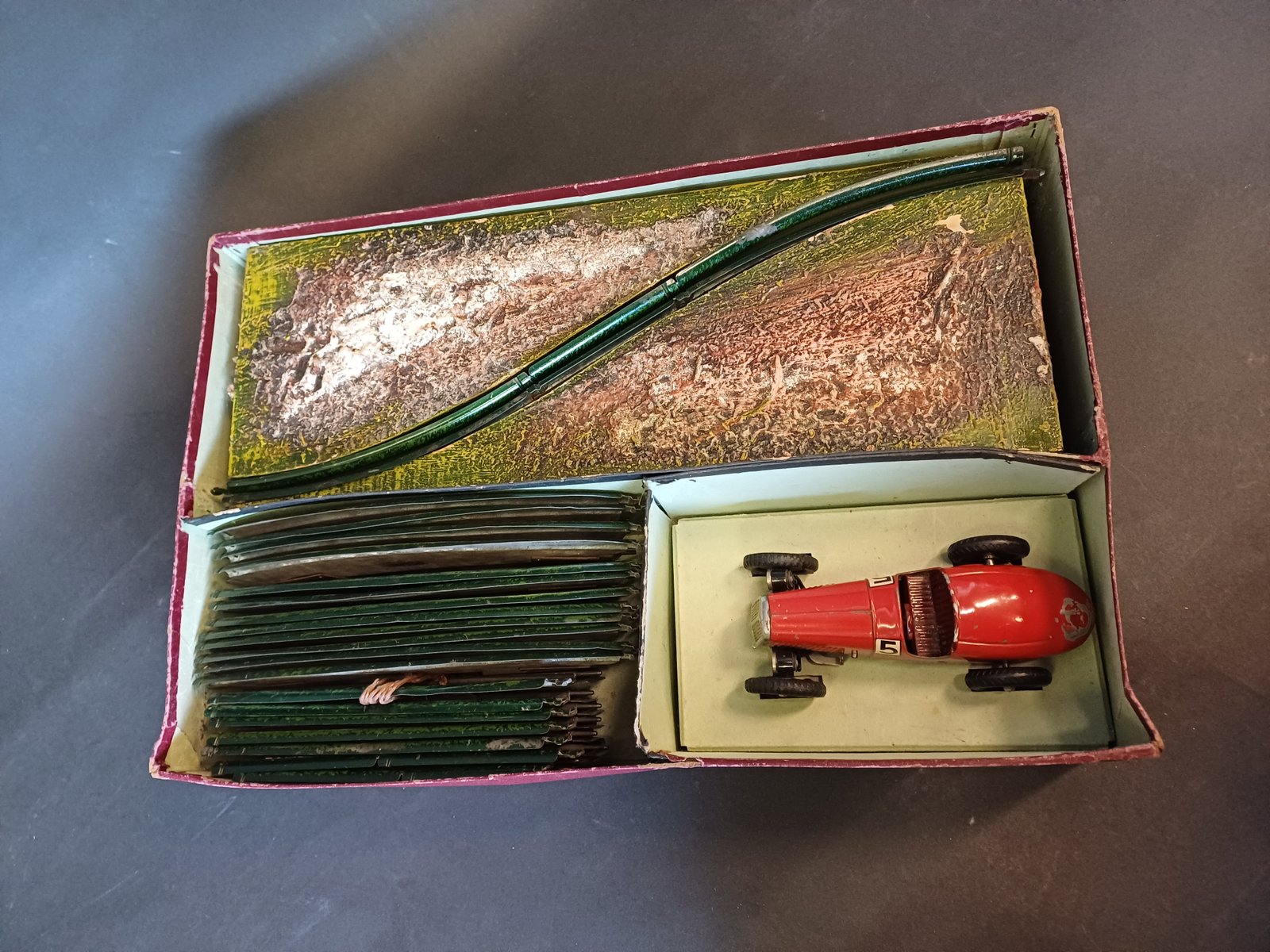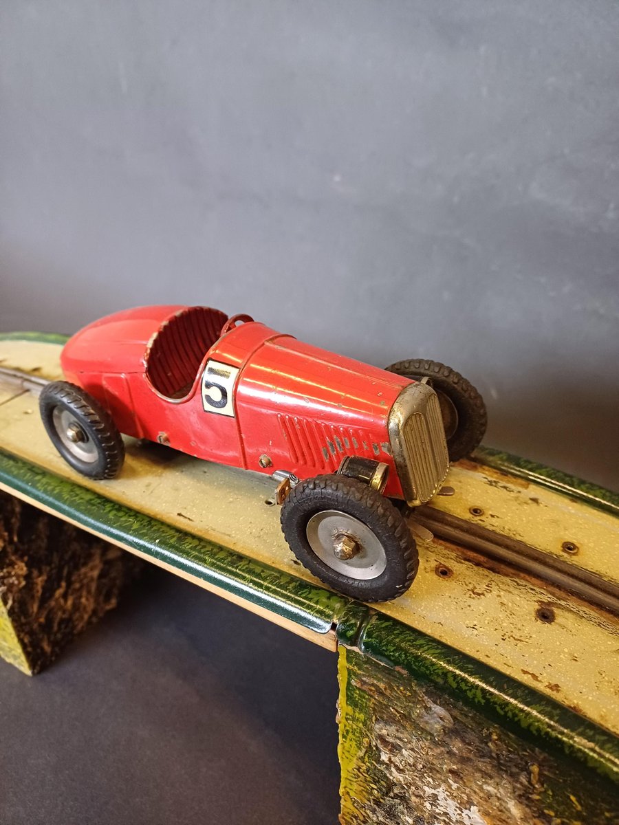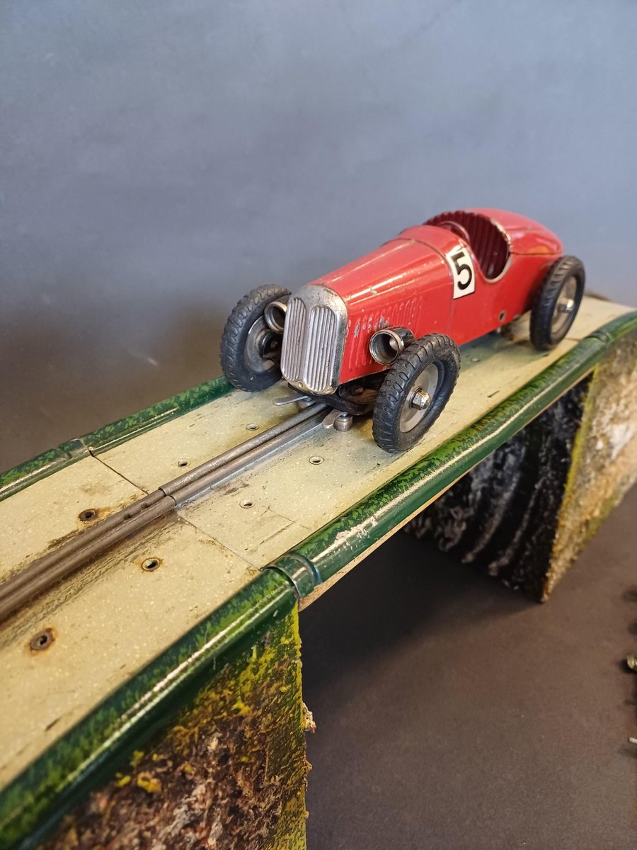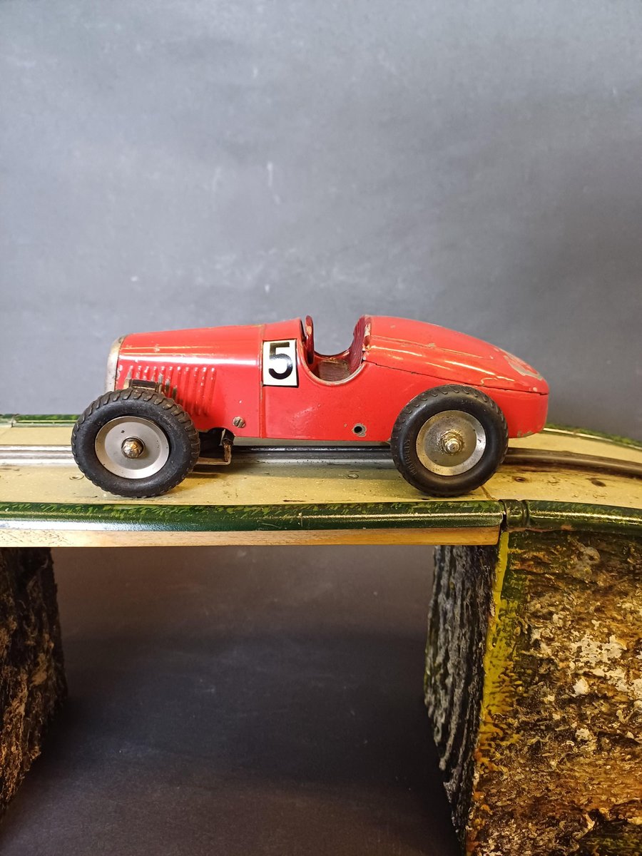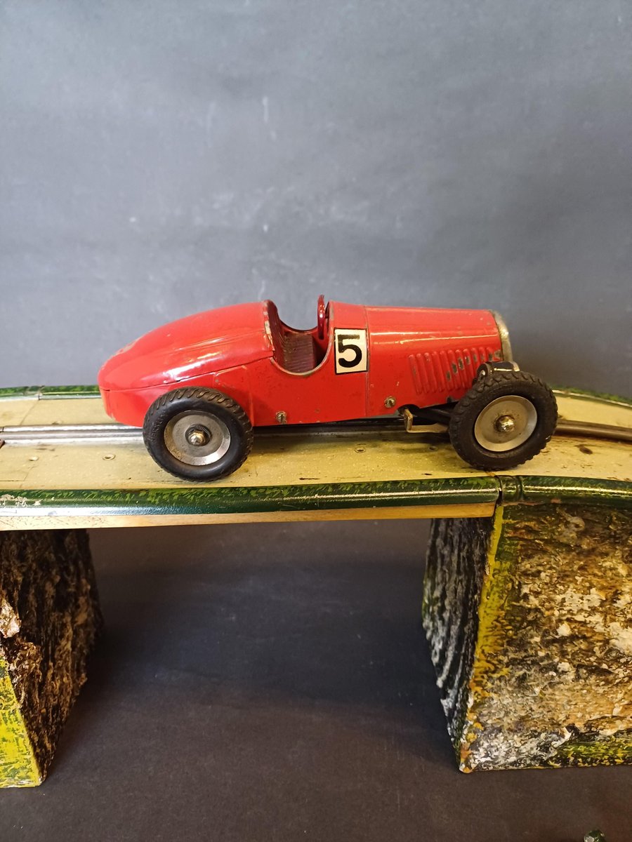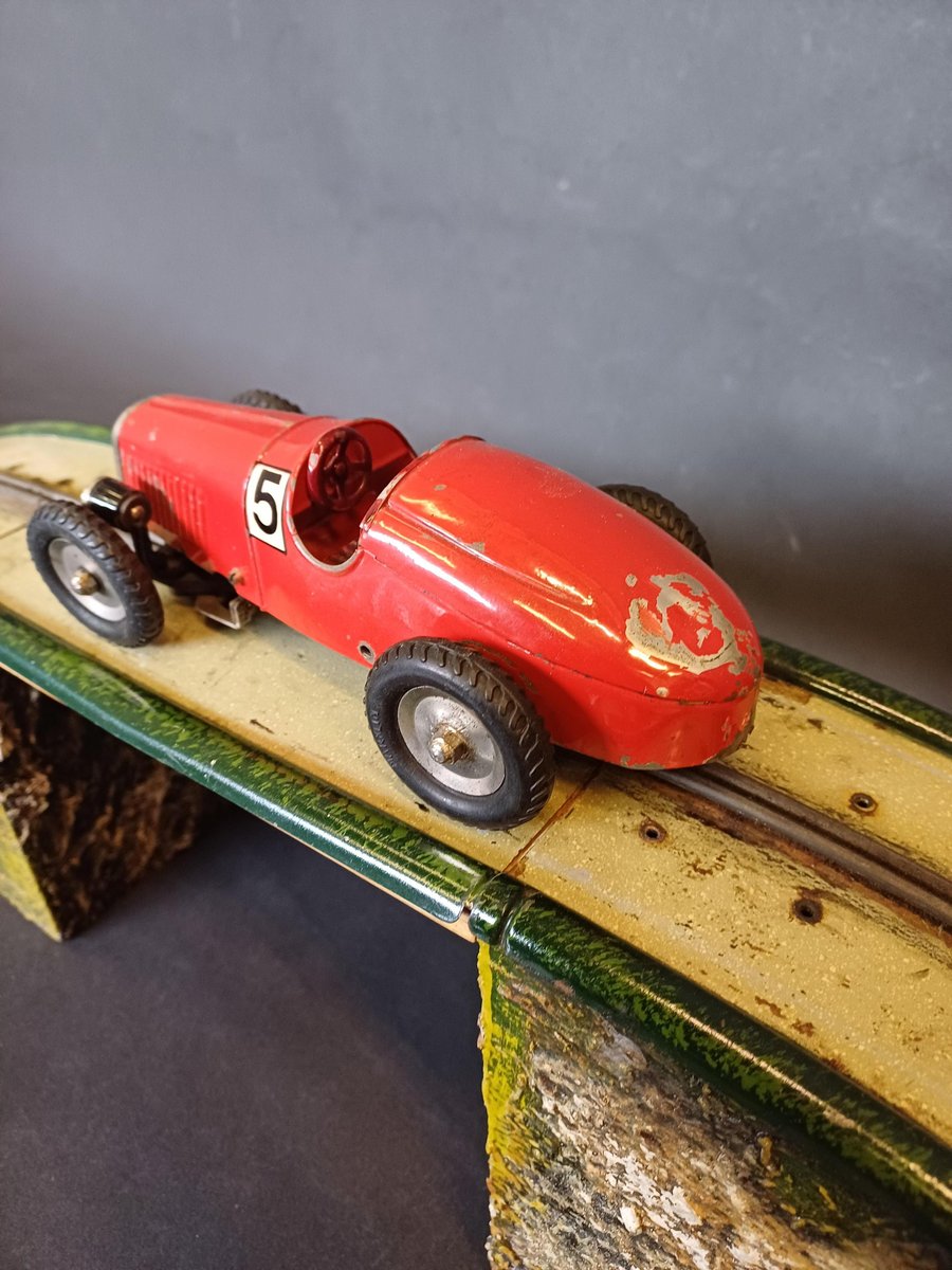 Extreamly rare Märklin Race Track 13301 G/3 with red coloured Racing Car No 5. Märklin's unnamed "rail" road car system appears in the 1936 Marklin catalogues, and doesn't seem to appear after this. Driver is missing, car is slightly damaged in the back (as seen on the fotos), everything is original including the box (W-35cm, L-53 cm, H-13 cm).