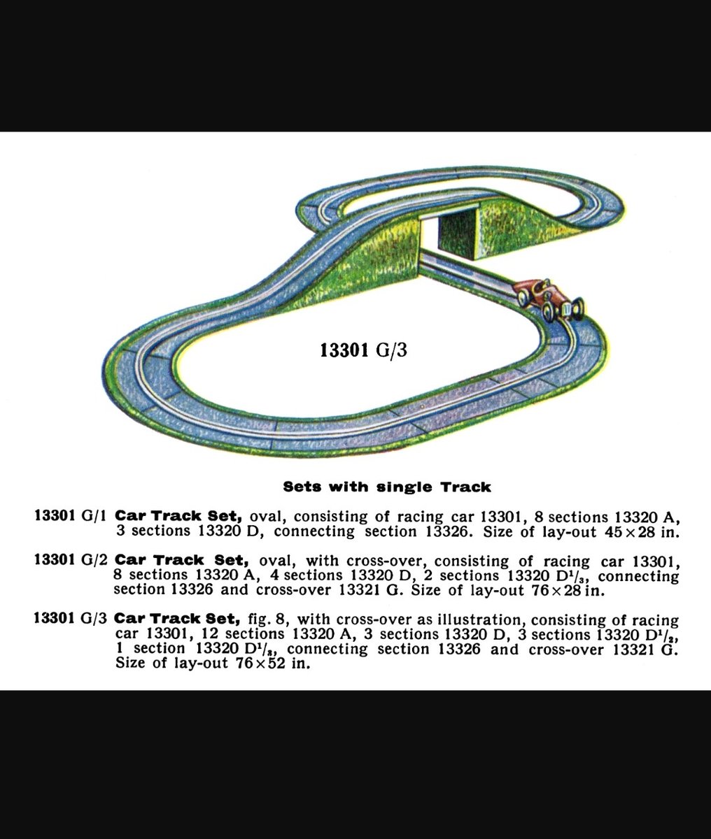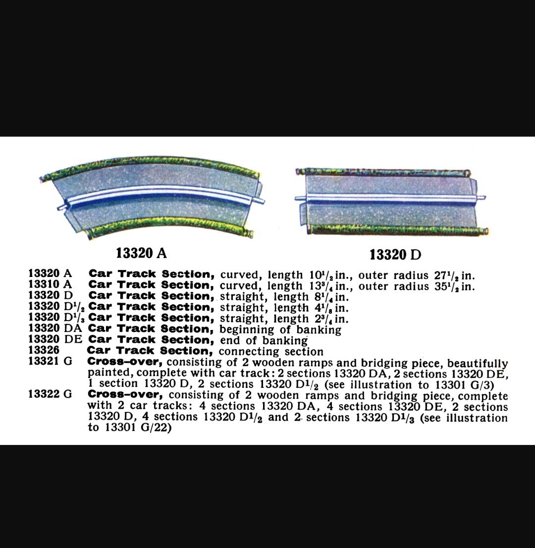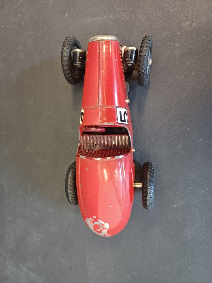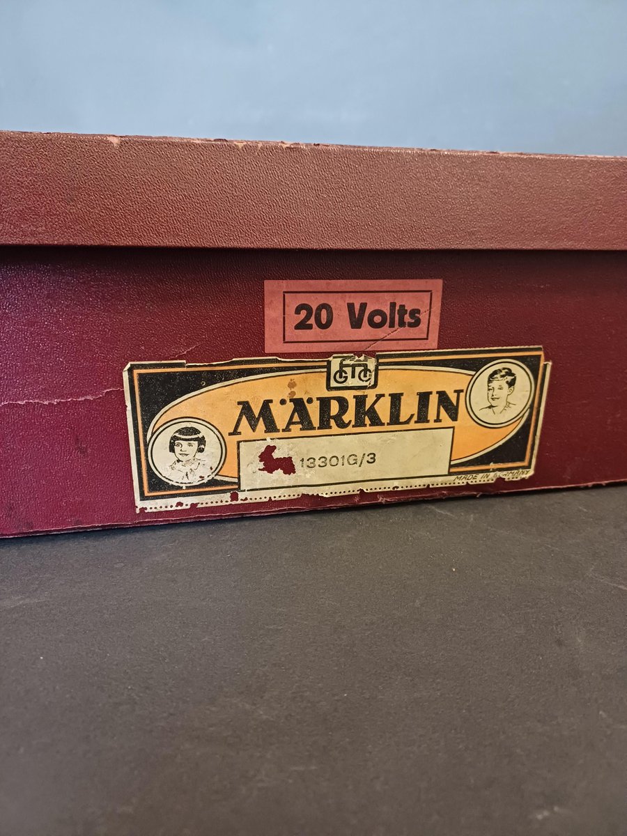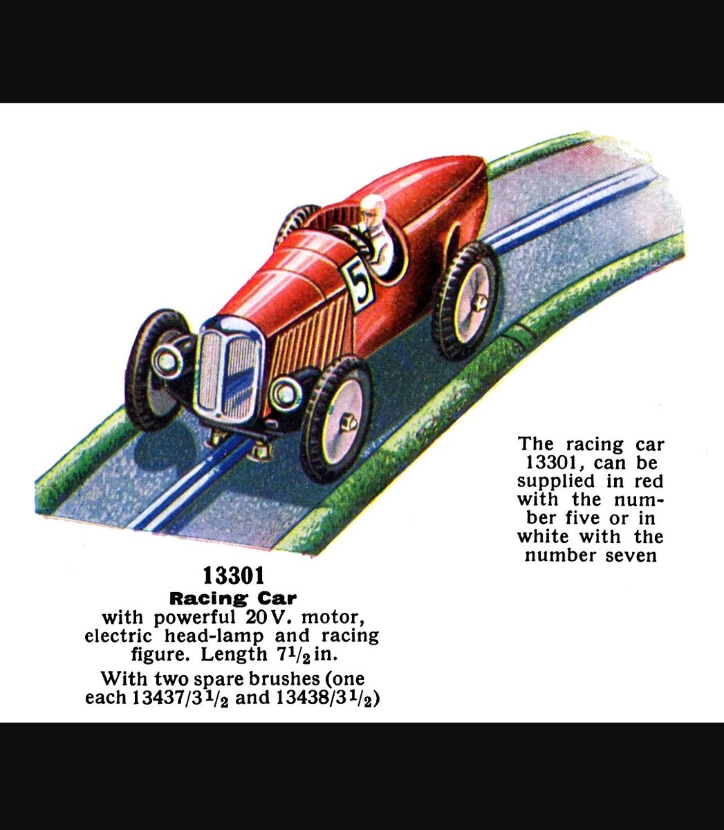 Extreamly rare Märklin Race Track 13301 G/3 with red coloured Racing Car No 5. Märklin's unnamed "rail" road car system appears in the 1936 Marklin catalogues, and doesn't seem to appear after this. Driver is missing, car is slightly damaged in the back (as seen on the fotos), everything is original including the box (W-35cm, L-53 cm, H-13 cm).