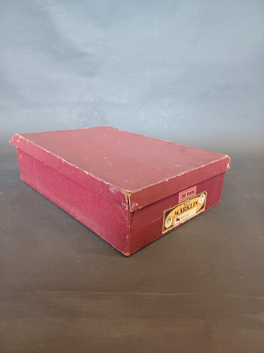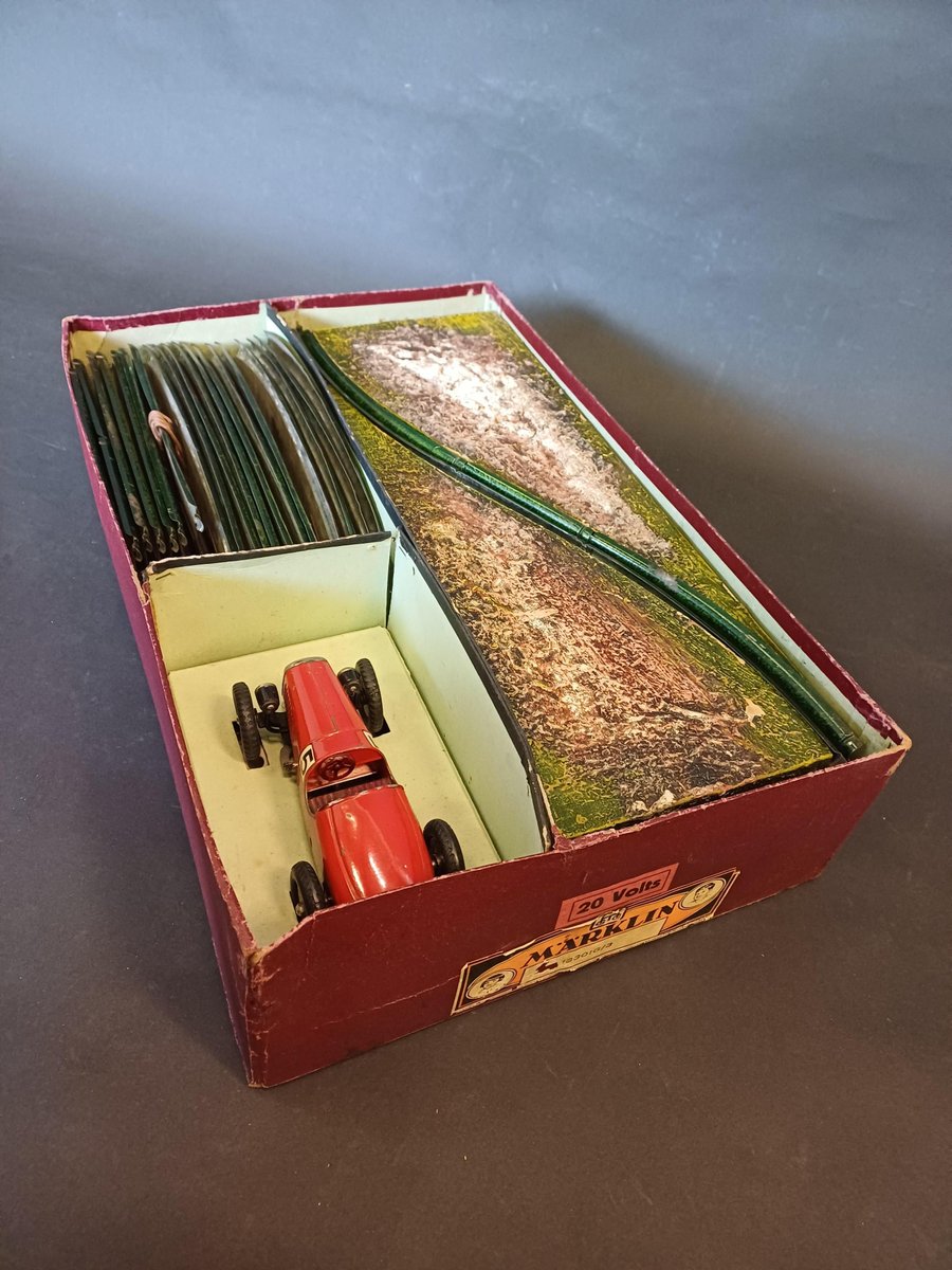 Äußerst seltene Märklin Rennbahn 13301 G/3 mit rot gefärbtem Rennwagen Nr. 5. Märklins unbenanntes "Schienen"-Straßenwagensystem erscheint in den Märklin-Katalogen von 1936 und scheint danach nicht mehr zu erscheinen. Der Fahrer fehlt, der Wagen ist hinten leicht beschädigt (wie auf den Fotos zu sehen), alles ist original, auch die Schachtel (B-35cm, L-53 cm, H-13 cm).
