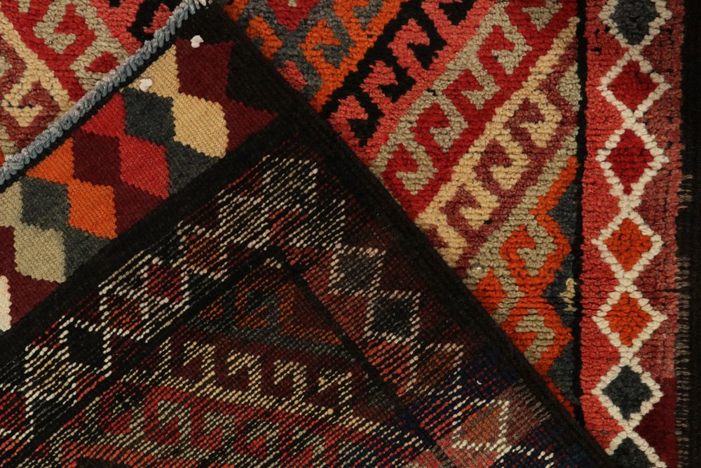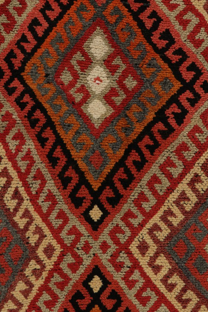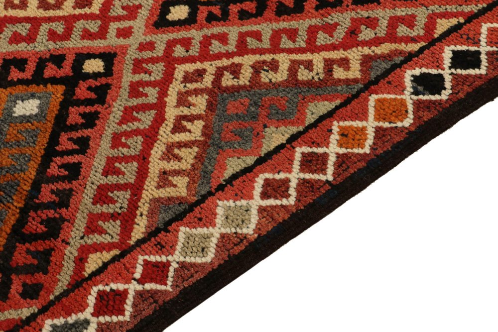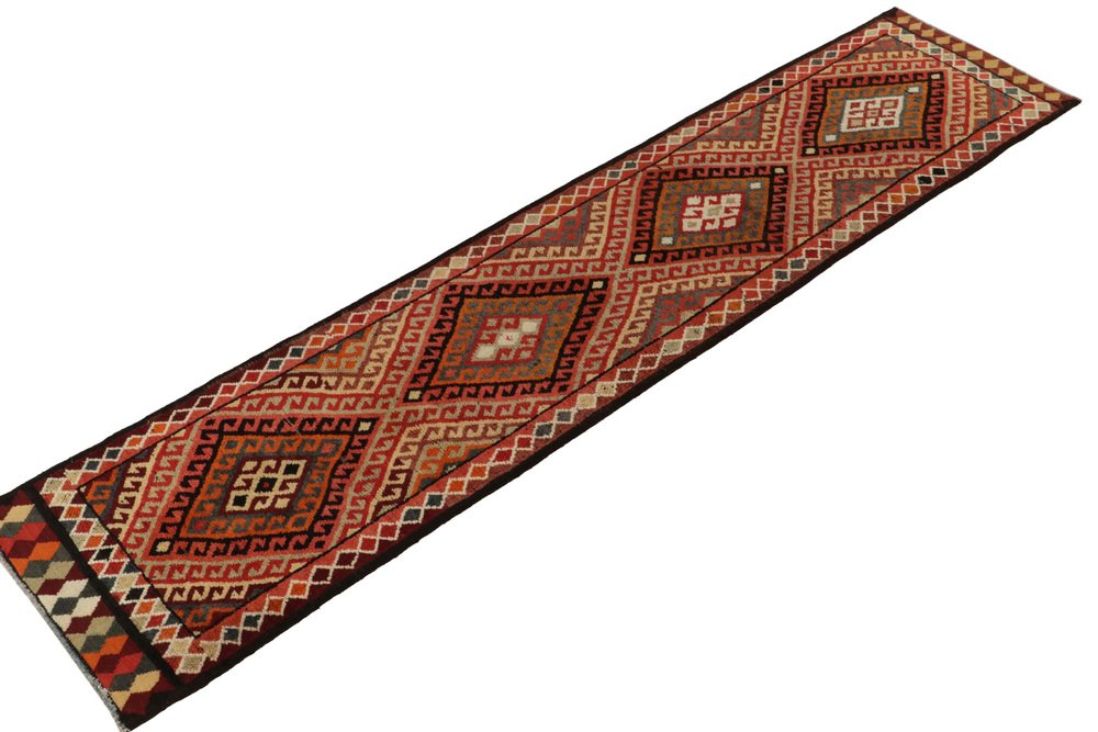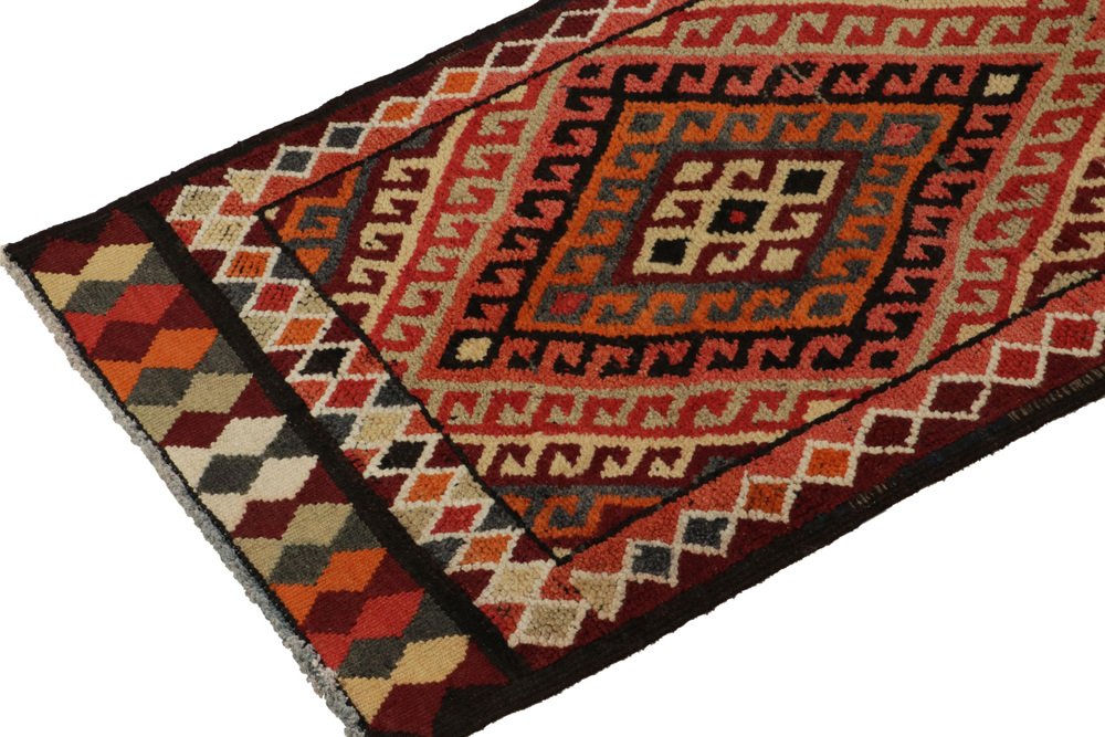 Hand-knotted in wool, a 3x12 runner from Rug & Kilim’s latest curation of rare tribal pieces from the mid-20th century. … Read more Hand-knotted in wool, a 3x12 runner from Rug & Kilim’s latest curation of rare tribal pieces from the mid-20th century. Originating from Turkey circa 1950-1960, the rug relishes a symmetric diamond pattern with traditional latch hooks in rich red, beige-brown, orange & black with a scintillating movement and charm. Connoisseurs & collectors may note a chain of diamond patterns in variegated tones on the inner border further exemplifying the nomadic aesthetics of its time. Prevailing in great condition, a cultured piece of unique folk art in comforting warm tones worthy of a meaningful addition to a variety of projects. See less