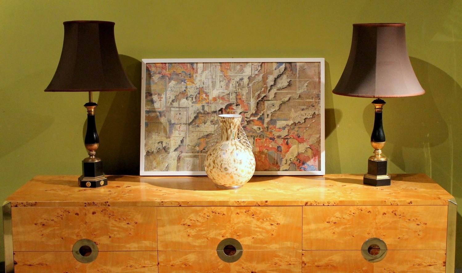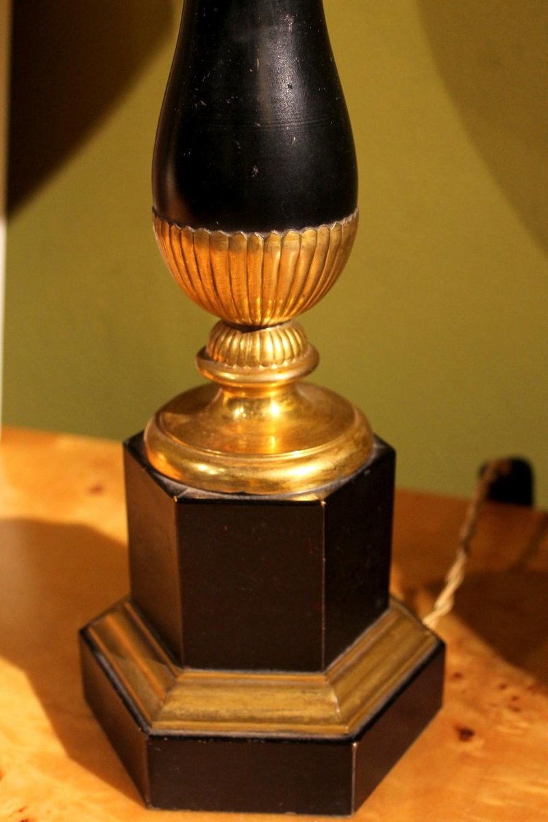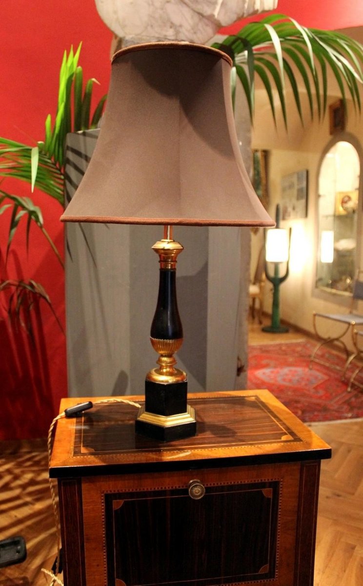 20. Jh. Französische Tischlampen aus schwarzer Emaille und Vergoldeter Bronze mit Seidenschirm, 2er Set