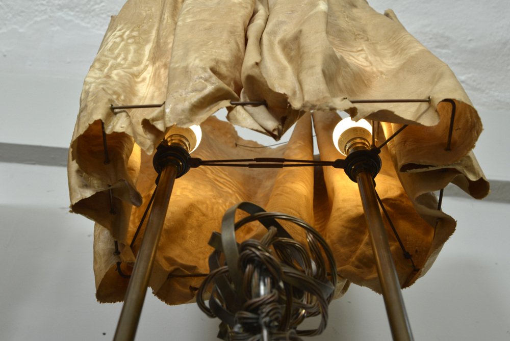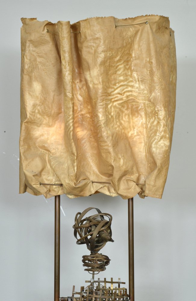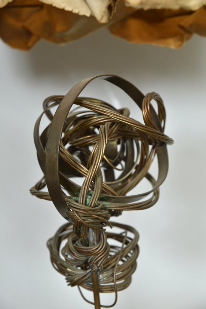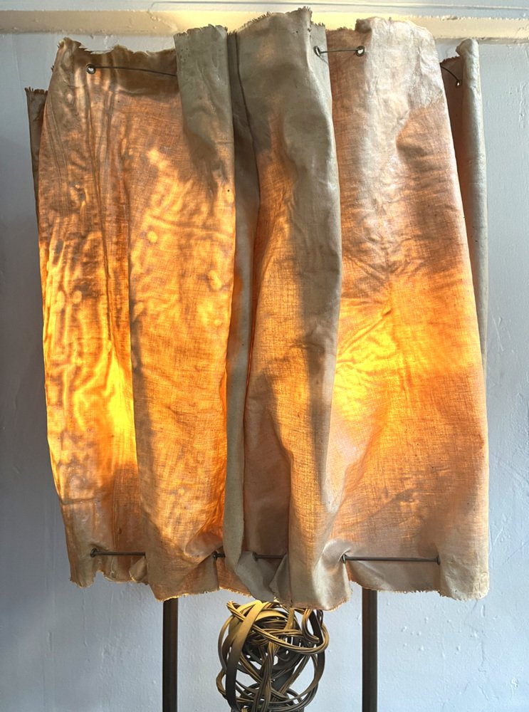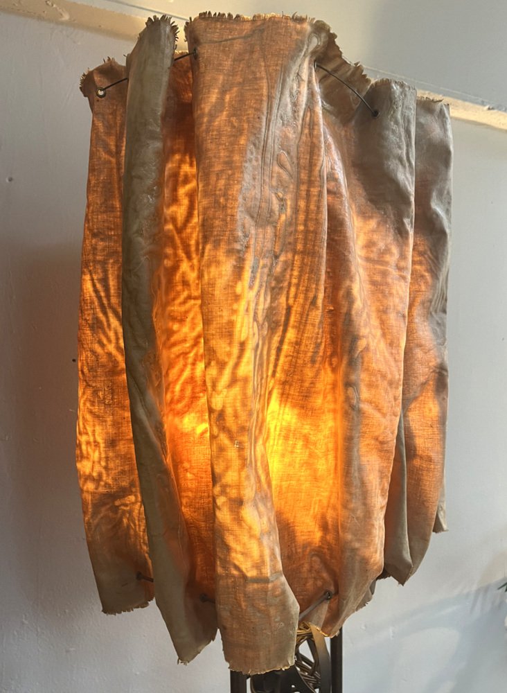 Die über zwei Meter hohe Leuchte hat einen abgestuften Sockel aus ebonisiertem Holz, aus dem zwei hohe Kupferstangen herausragen, die mit den Glühbirnenfassungen im Inneren des Schirms abschließen. Der Schirm aus steifem Stoff wurde mit Messingösen durchbohrt, mit Metalldraht durchzogen und dann in Form geknautscht, so dass er beim Anzünden einen wunderbar warmen, feurigen Schein abgibt.