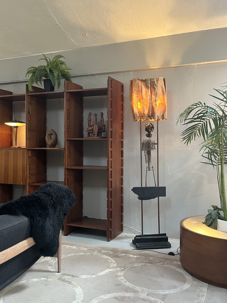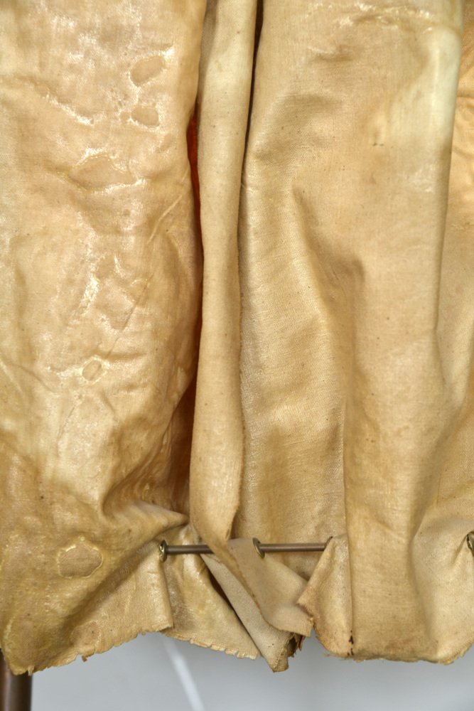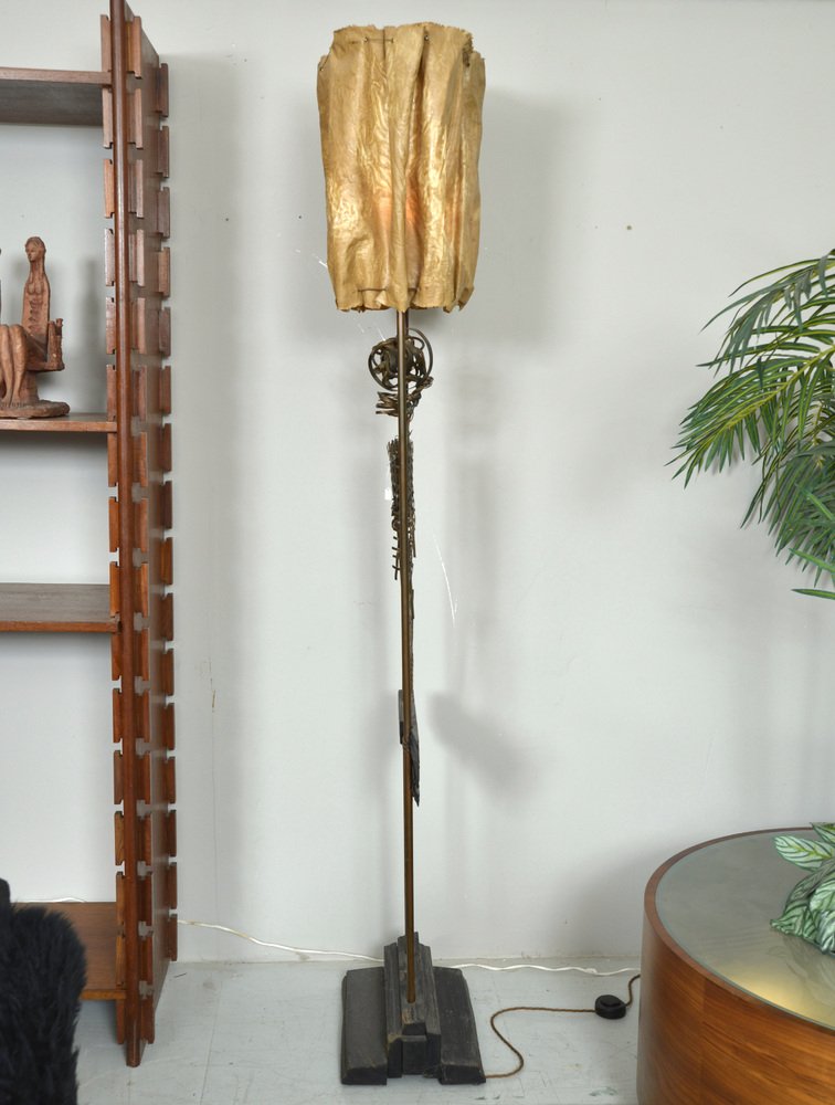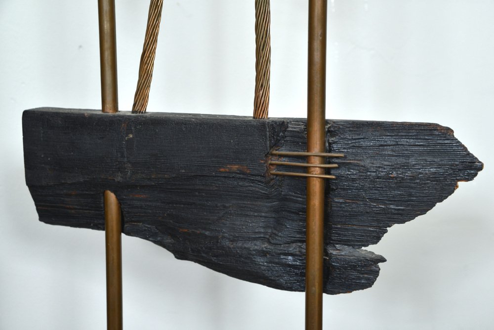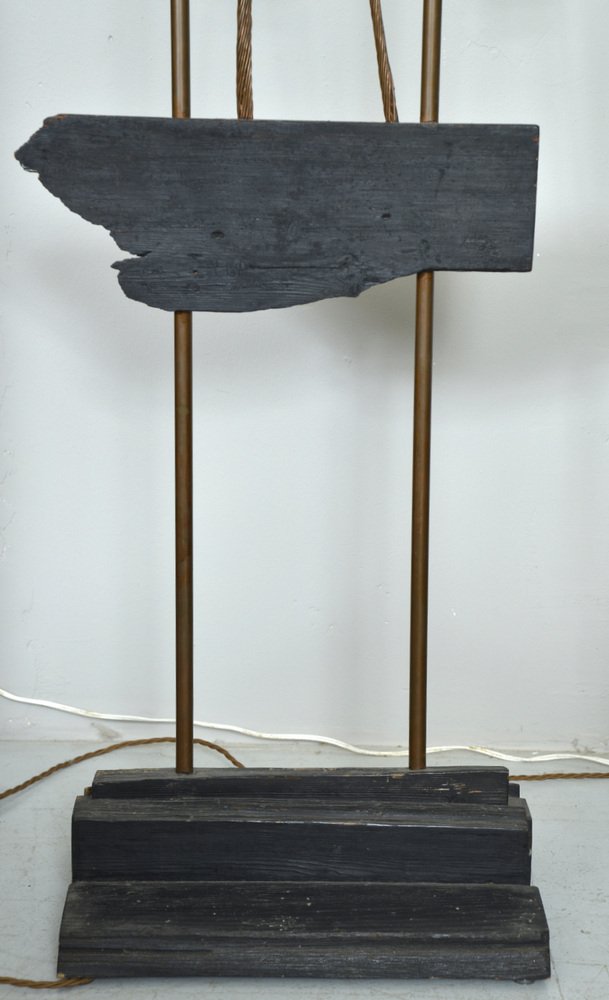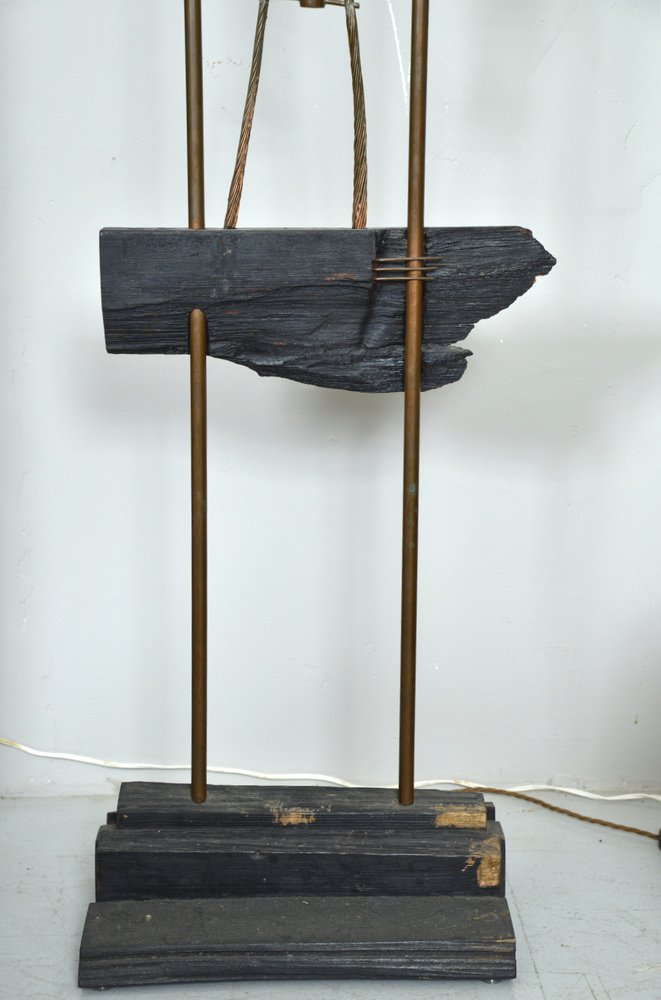 Die über zwei Meter hohe Leuchte hat einen abgestuften Sockel aus ebonisiertem Holz, aus dem zwei hohe Kupferstangen herausragen, die mit den Glühbirnenfassungen im Inneren des Schirms abschließen. Der Schirm aus steifem Stoff wurde mit Messingösen durchbohrt, mit Metalldraht durchzogen und dann in Form geknautscht, so dass er beim Anzünden einen wunderbar warmen, feurigen Schein abgibt.