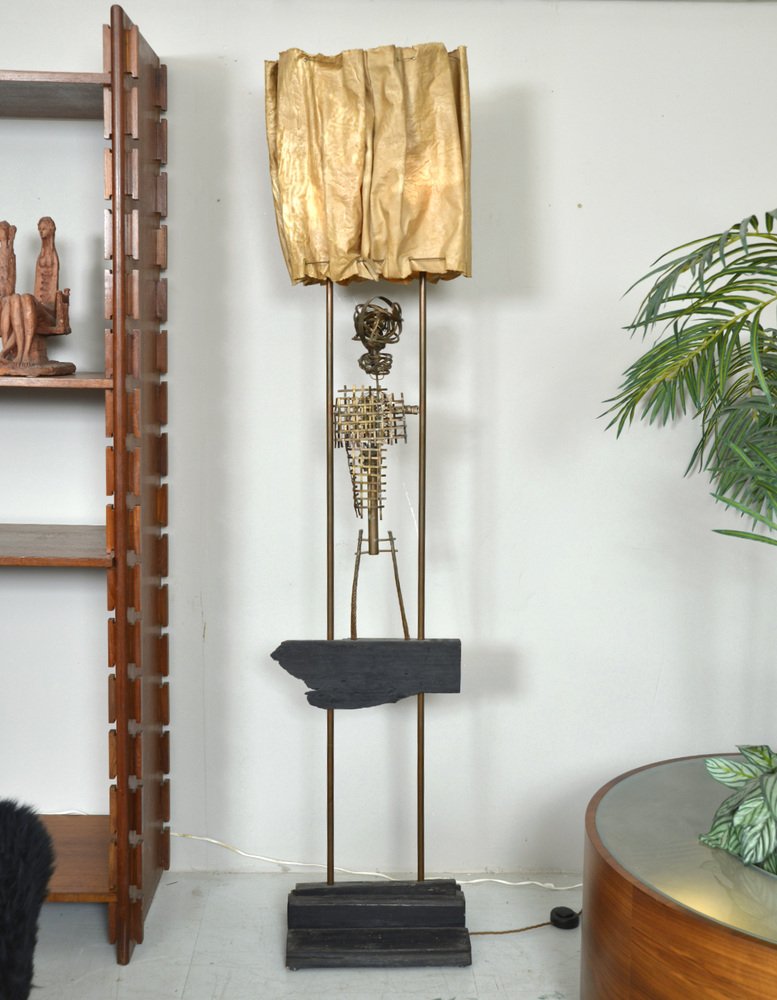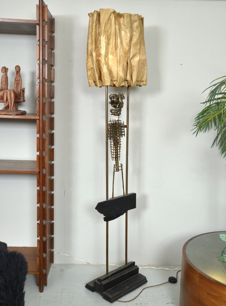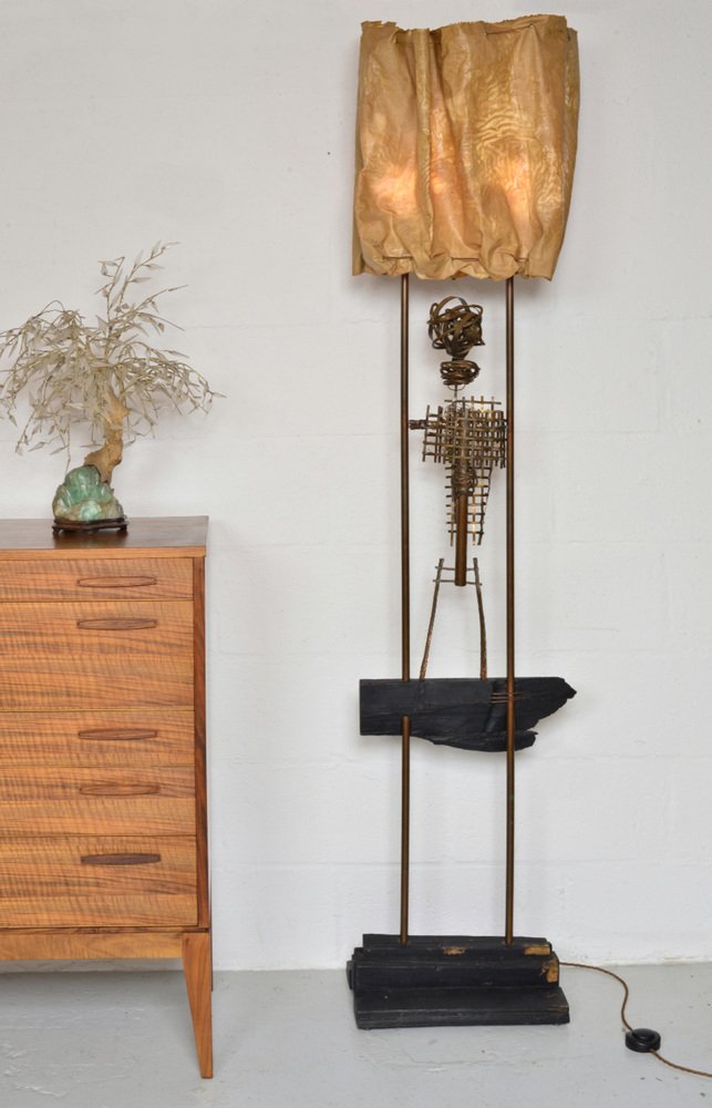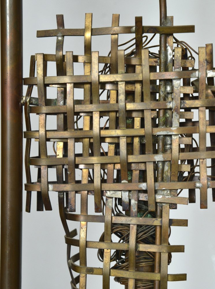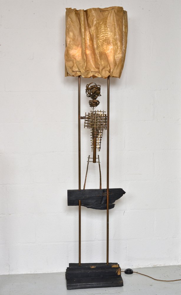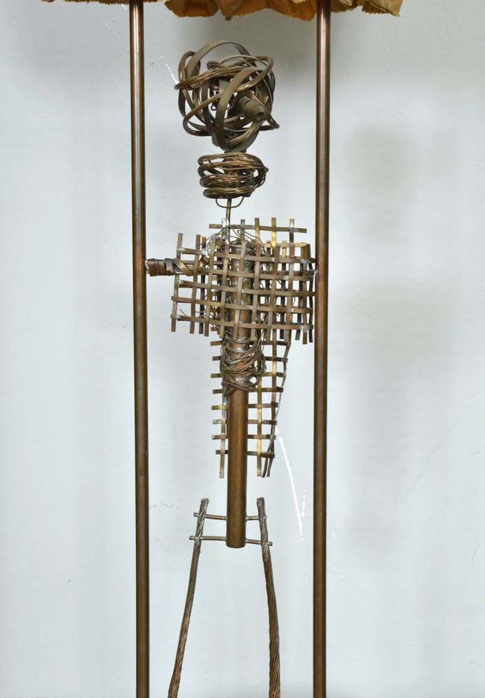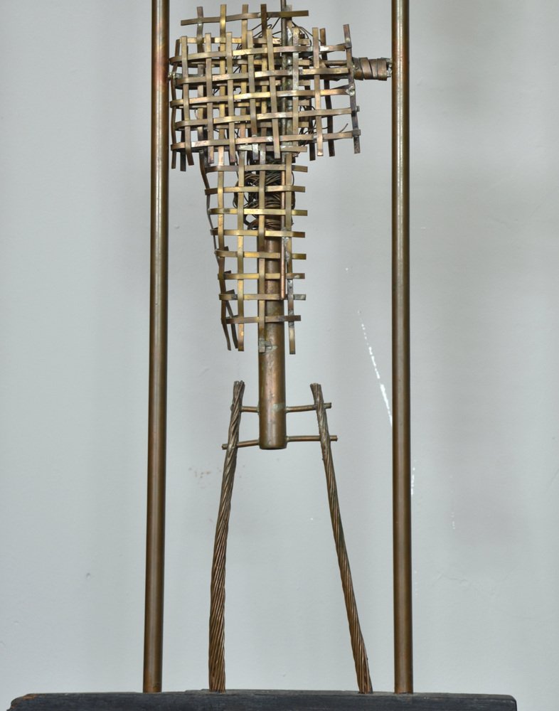 An abstract copper figure forms the body of the sculpture, where Graves has twisted, woven, bent and welded the copper and wire to form a figure. The sculpture has a wonderful patination and has not been touched since its creation, apart from being professionally rewired with 3-core braided wire and foot-switch.