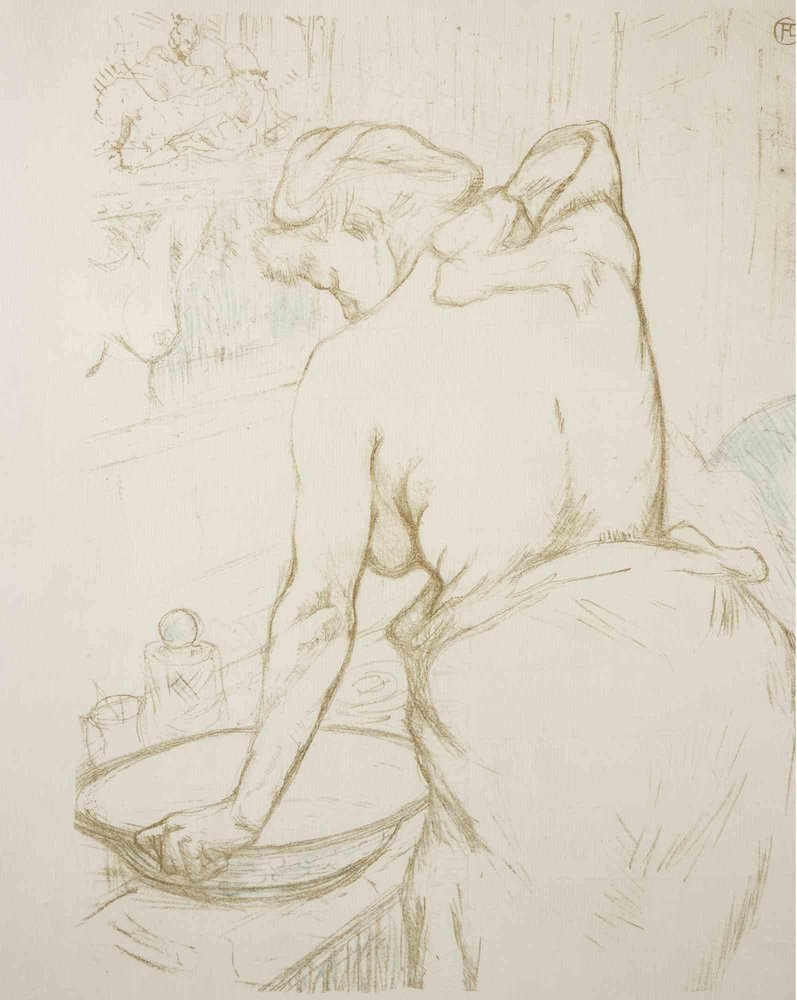 Femme qui se Lave - La Toiletteis a color lithograph realized by Henri de Toulouse Lautrec in 1896. cm. 58 x 45,5; matted. Monogrammed in the plate. Good conditions. This specimen belongs to an edition of 1900 ca., whose size is unknown, on Vélin Hollande Van Gelder Zonen. Van Gelder Zonen watermark in the paper. Ref. Wittrock 160; Delteil 184; Adhémar 205 Elles; 1896 is the year of the album "Elles". The series was printed in 100 copies. The title page was also used as a Manifesto. The subject is life in brothels, and Lautrec wants to show that women of pleasure, whom he has known well, especially for two years, are not damned souls, but live like the others. He calls them Elles (they), a pronoun that refers to all women and very little in his drawings of him suggests that they are prostitutes. The women Lautrec frequented cared about him very much. This series of ten lithographs plus the cover constitutes one of the peaks of Lautrec's oeuvre. He had three women pose, Pauline, Baron, and another buxom woman whose name we have no name. The album was not very successful in bookstores, but aroused great interest from other artists, so much so that the following year the painter Truchet entitled Elles the painting he presented at the 1899 Salon, representing a group of women in long dresses gathered together in a room. As often happens, the Elles series was re-evaluated years later due to the "very skilful" technique and the avant-garde way of dealing with the subject.