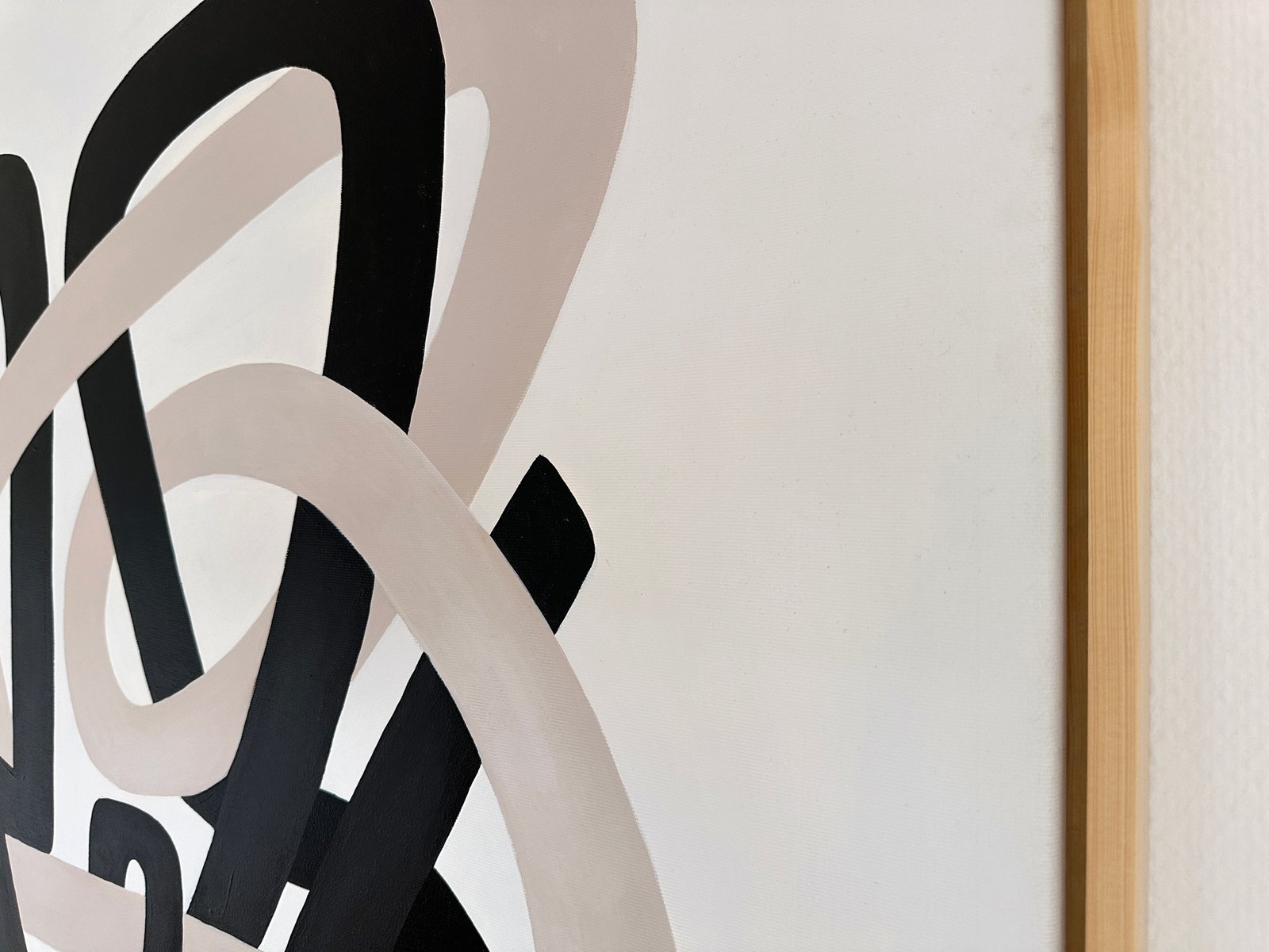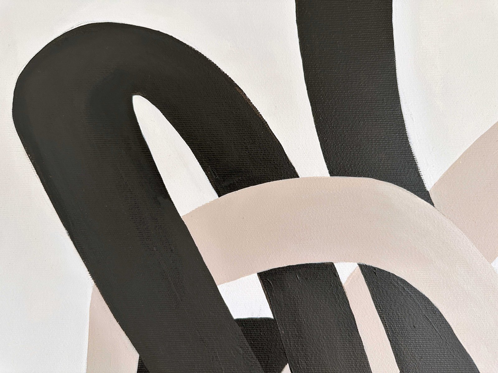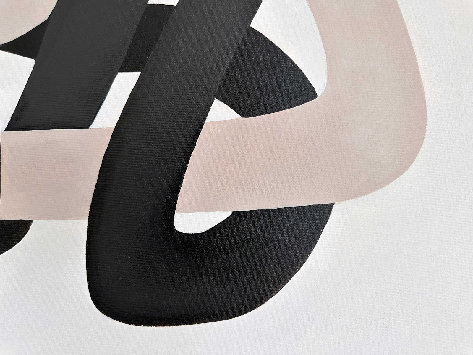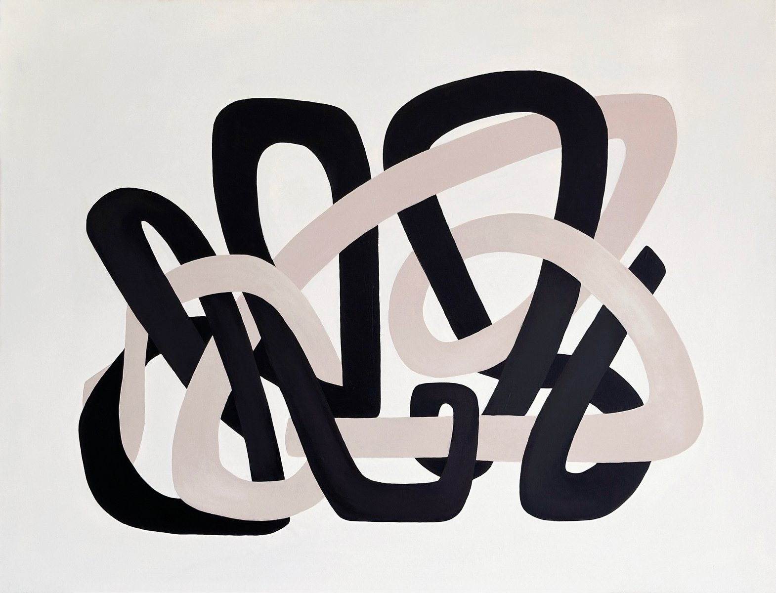 Minimal organic forms grow into each other with a simplicity similar to the soft shapes found in the natural world, like clustering vines and tree branches. A striking composition of two cool neutral hues is carefully formed into sinuous, soft shapes that echo the gentle contours of nature. These lines, with their graceful curves and fluid movement, entwine each other in a balanced flow of form, suggesting a harmonious relationship between opposing values of dark and light. Their intertwining asymmetric shapes create a sense of unity and cohesion, symbolizing the interconnectedness of life and the quiet beauty found in symbiotic relationships. The larger format amplifies the meditative quality of the original studies, inviting viewers into an immersive experience of interconnected forms.