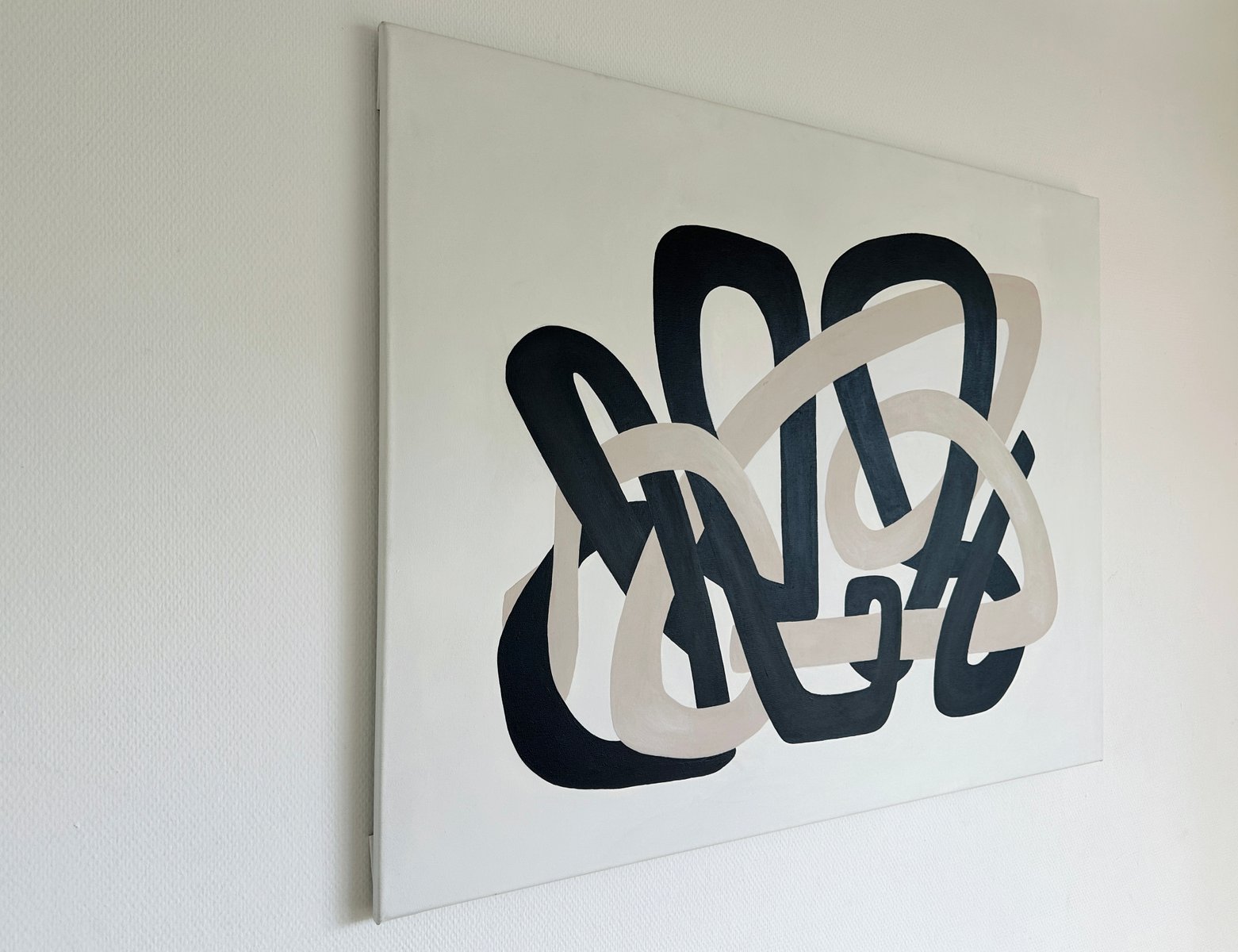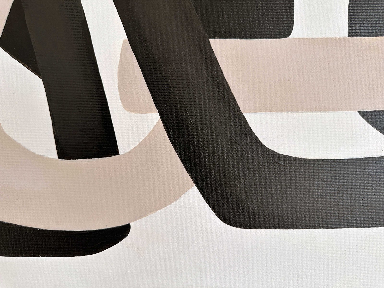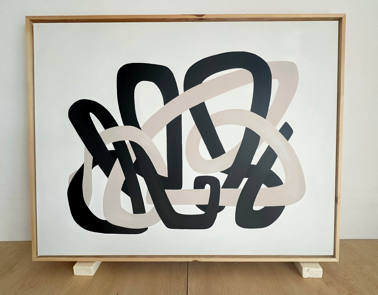 Minimal organic forms grow into each other with a simplicity similar to the soft shapes found in the natural world, like clustering vines and tree branches. A striking composition of two cool neutral hues is carefully formed into sinuous, soft shapes that echo the gentle contours of nature. These lines, with their graceful curves and fluid movement, entwine each other in a balanced flow of form, suggesting a harmonious relationship between opposing values of dark and light. Their intertwining asymmetric shapes create a sense of unity and cohesion, symbolizing the interconnectedness of life and the quiet beauty found in symbiotic relationships. The larger format amplifies the meditative quality of the original studies, inviting viewers into an immersive experience of interconnected forms.