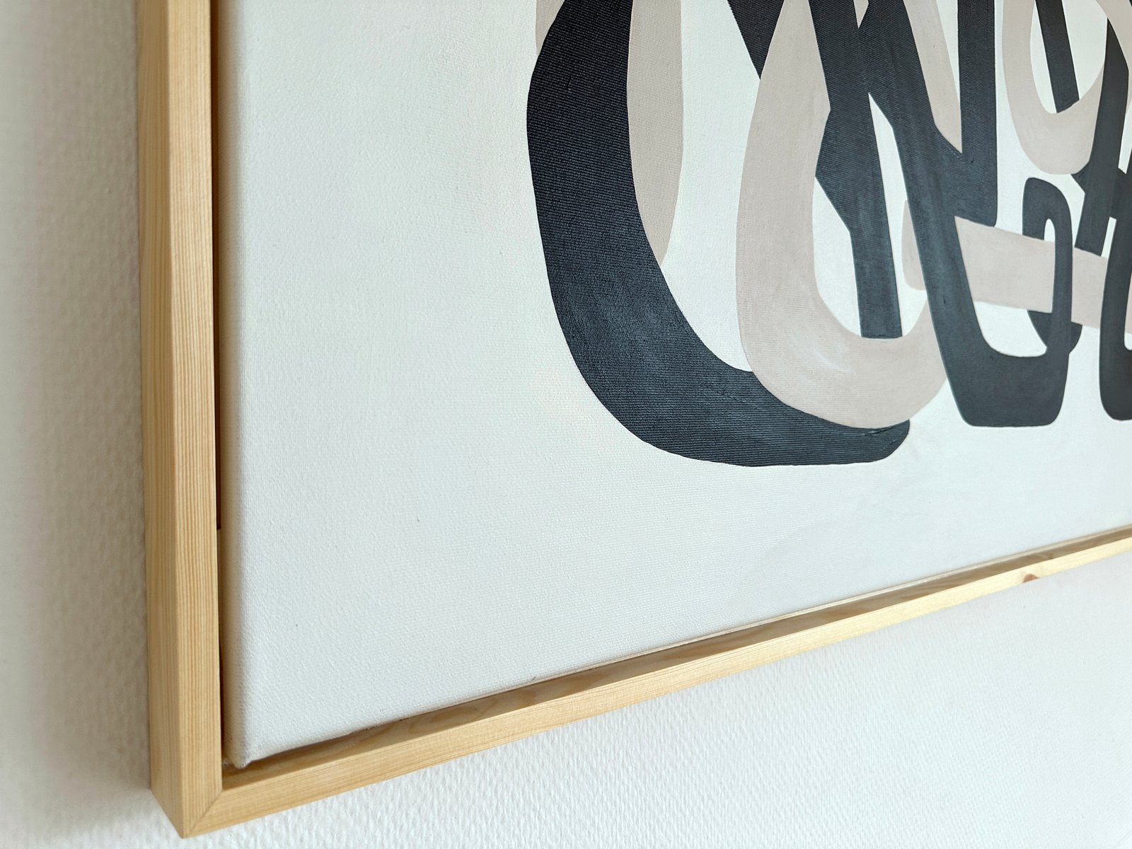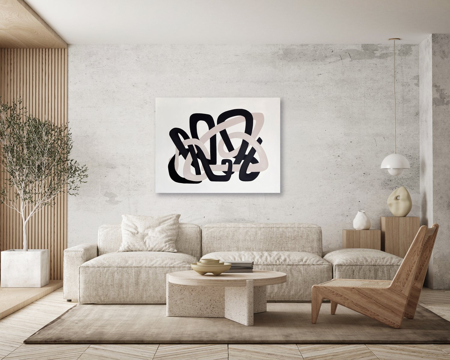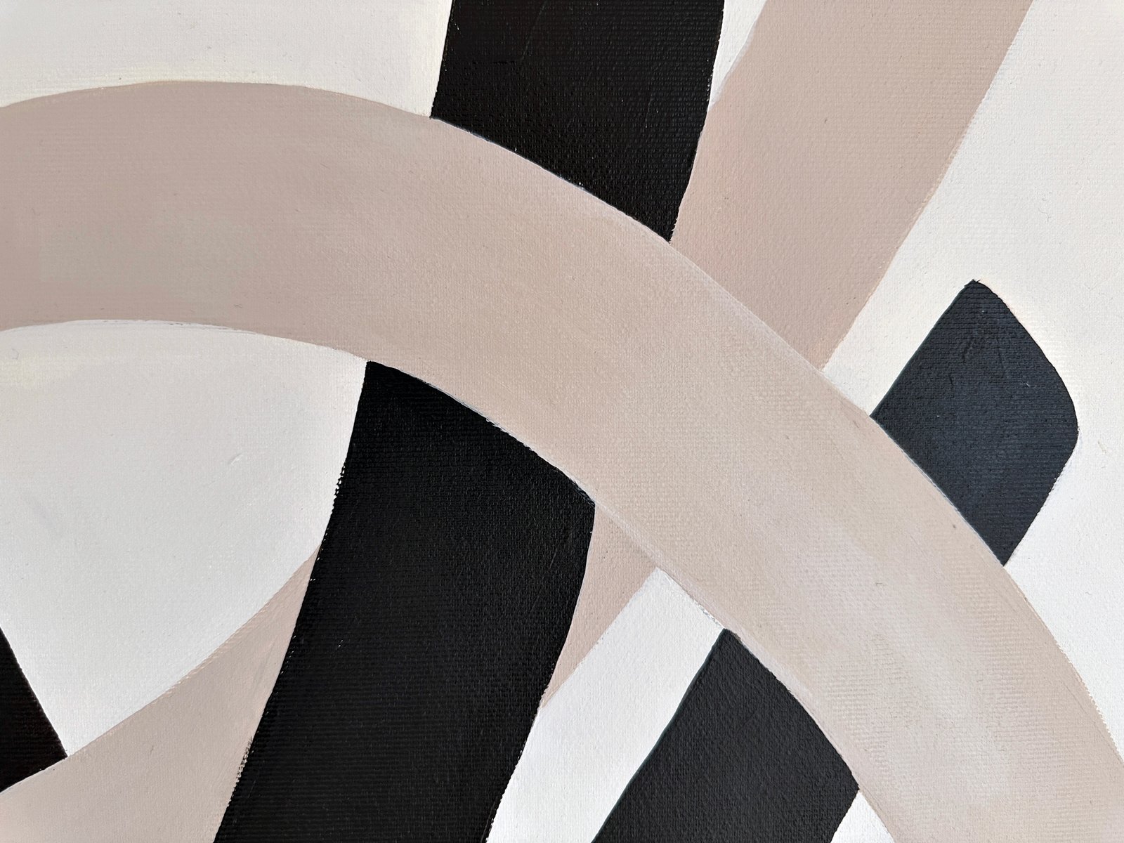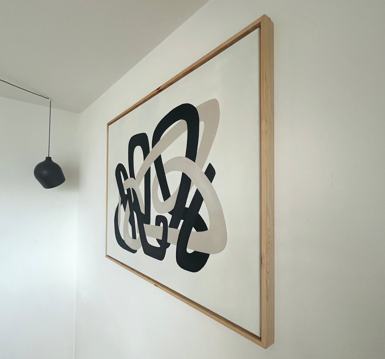 Minimal organic forms grow into each other with a simplicity similar to the soft shapes found in the natural world, like clustering vines and tree branches. A striking composition of two cool neutral hues is carefully formed into sinuous, soft shapes that echo the gentle contours of nature. These lines, with their graceful curves and fluid movement, entwine each other in a balanced flow of form, suggesting a harmonious relationship between opposing values of dark and light. Their intertwining asymmetric shapes create a sense of unity and cohesion, symbolizing the interconnectedness of life and the quiet beauty found in symbiotic relationships. The larger format amplifies the meditative quality of the original studies, inviting viewers into an immersive experience of interconnected forms.