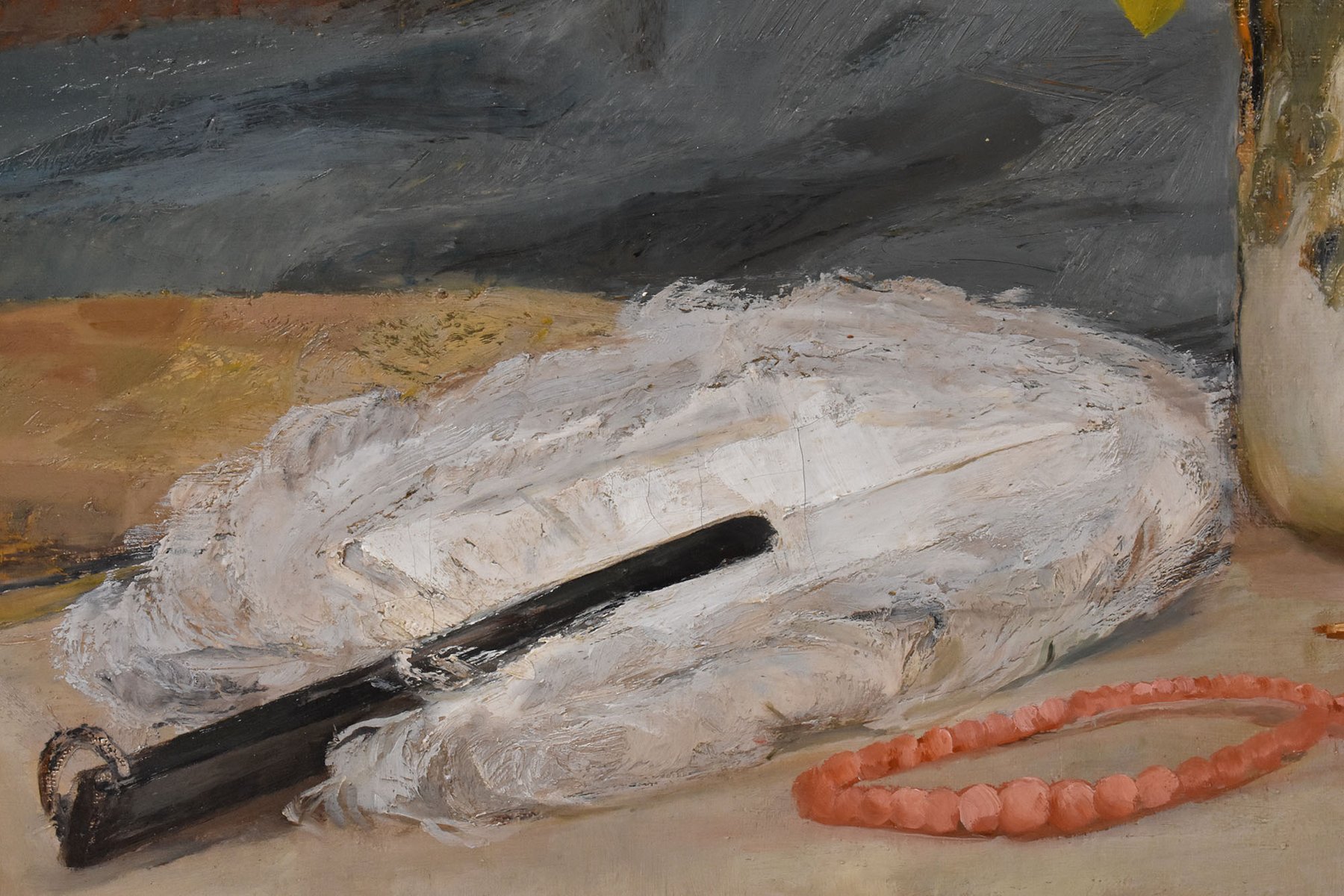 Diese antiken Stillleben mit Blumen zeigen eine Vase mit Frühlingsblumen mit Pfirsich- oder Kirschblüten aus der Zeit des Jugendstils/Art Déco. Ein feines Ölgemälde auf Leinwand aus dem frühen 20. Jahrhundert. Die glasierte Keramikvase in warmen Naturtönen enthält einen sorgfältig arrangierten Blumenstrauß. Die Komposition umfasst Goldregenzweige mit ihren charakteristischen herabhängenden gelben Blüten, eine antike rosa Rose und zarte Pfirsich- oder Kirschblüten, die mit weichen, lebendigen Pinselstrichen dargestellt sind, die die chromatische Leuchtkraft verstärken. Im Vordergrund, auf einer hellen Fläche platziert, befinden sich feminine Toilettenartikel: ein weißer Fächer, eine rosa Korallenkette und eine dunkel lackierte Schachtel.