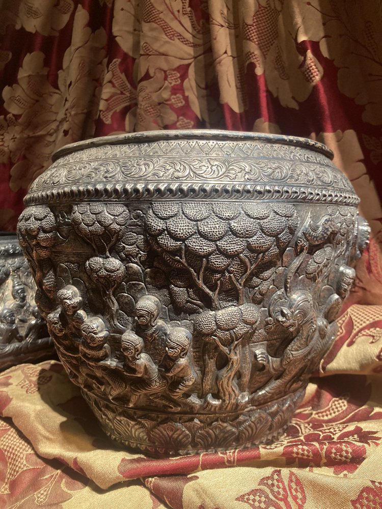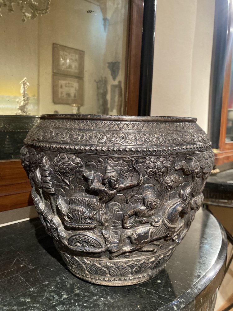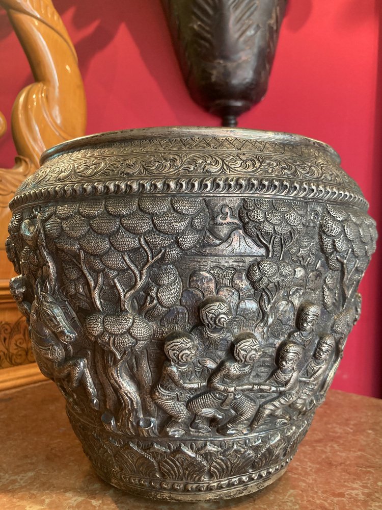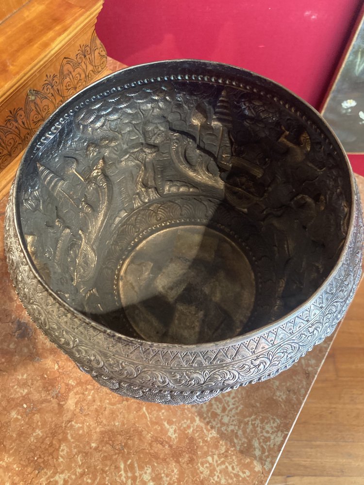 Discover an extraordinary 19th-century antique Burmese silver Thabeik bowl, masterfully handcrafted in solid silver and featuring stunning repousse decoration. This bowl is not only functional but also serve as exquisite piece of art that will elevate the aesthetic of any room.