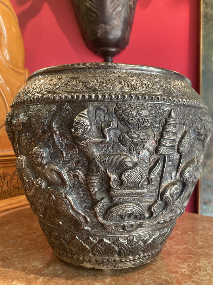 Entdecken Sie eine außergewöhnliche antike birmanische Thabeik-Schale aus dem 19. Jahrhundert, die in meisterhafter Handarbeit aus massivem Silber gefertigt wurde und eine atemberaubende Repoussierverzierung aufweist. Diese Schale ist nicht nur funktional, sondern dient auch als exquisites Kunstwerk, das die Ästhetik eines jeden Raumes aufwertet.