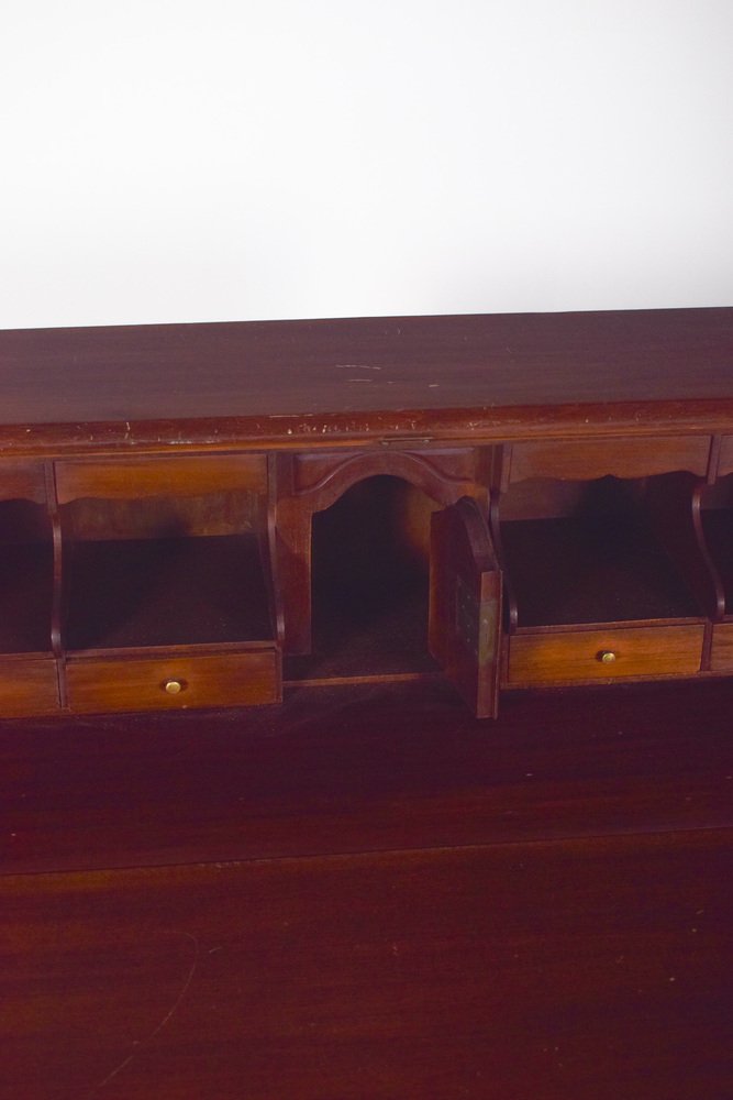 Paper chest of drawers in mahogany. Elegant, finished in a warm, uniform tone that emphasises the natural grain of the wood, with a structure that is both functional and decorative. At the bottom, there are four spacious drawers with gold metal handles and lock entrances. The top is made up of a folding top that transforms into a writing surface, revealing a compartmentalised interior with small niches, drawers and a central door, ideal for storing correspondence, documents or small personal items.