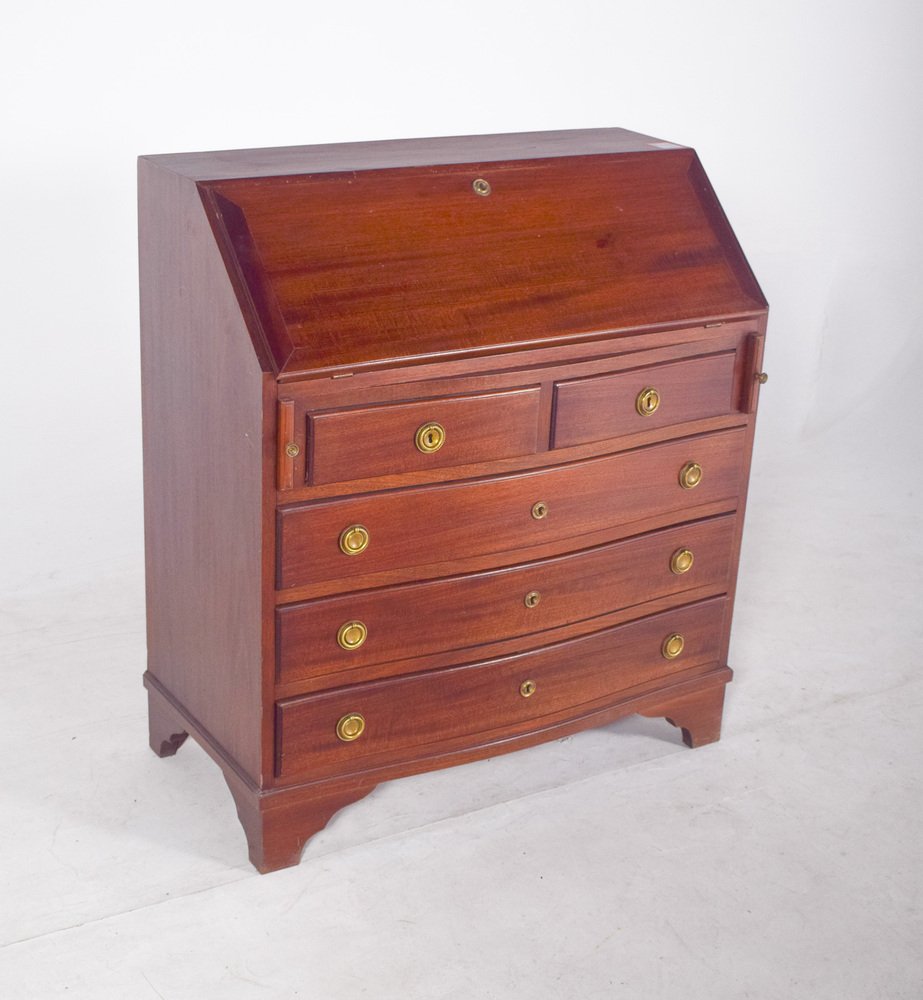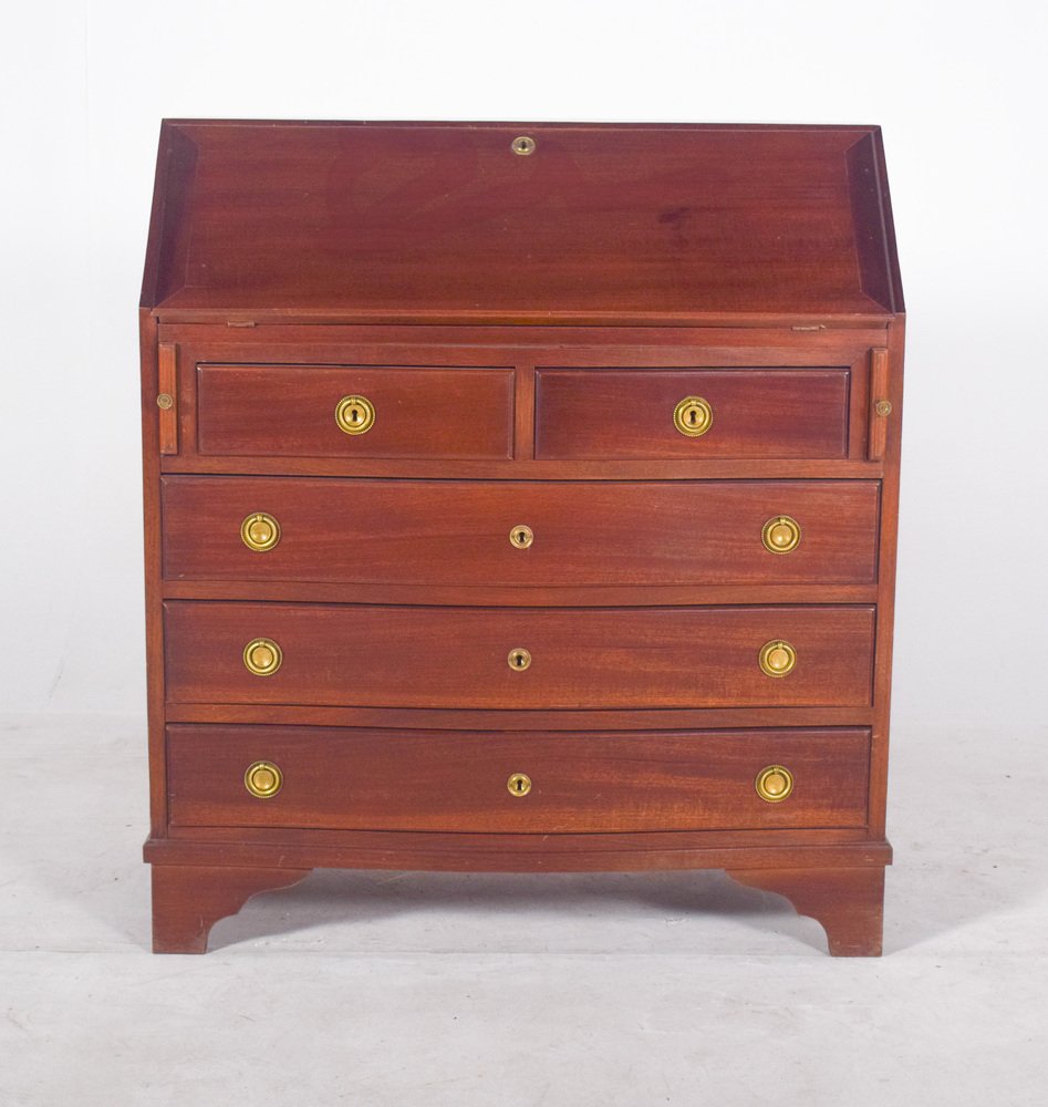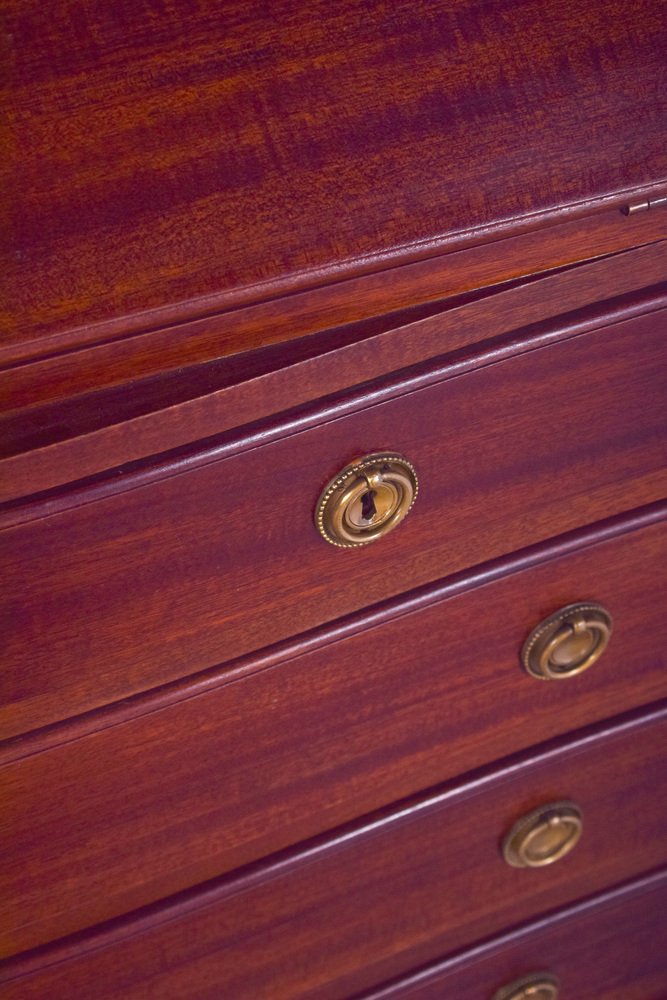 Papierkommode aus Mahagoni. Elegant, in einem warmen, gleichmäßigen Farbton ausgeführt, der die natürliche Maserung des Holzes betont, mit einer Struktur, die sowohl funktional als auch dekorativ ist. Im unteren Bereich befinden sich vier geräumige Schubladen mit goldenen Metallgriffen und Schlössern. Die Oberseite besteht aus einem Klappdeckel, der sich in eine Schreibfläche verwandelt und ein unterteiltes Inneres mit kleinen Nischen, Schubladen und einer zentralen Tür offenbart, ideal für die Aufbewahrung von Korrespondenz, Dokumenten oder kleinen persönlichen Gegenständen.