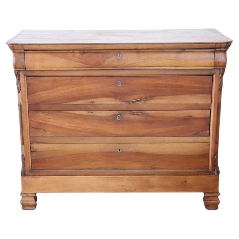 Produced during the Louis Philippe period, this chest of drawers has a clean and simple design that also suits modern furnishings. with two delicate decorations on the sides of the front, the lack of excessive decoration highlights the beautiful grain of the walnut wood.
