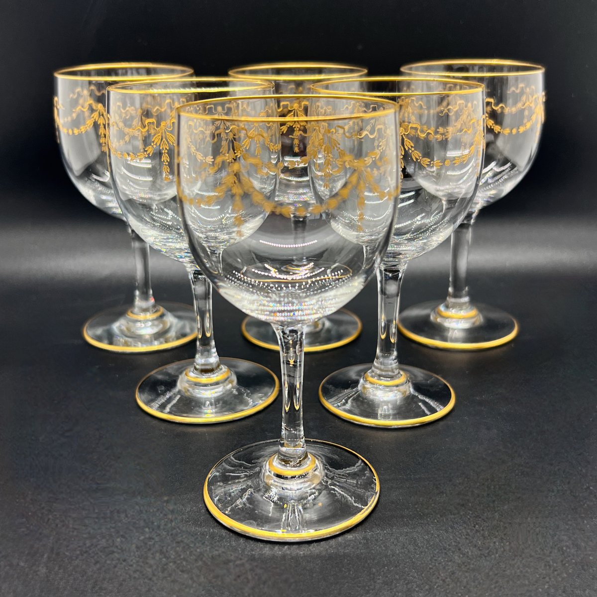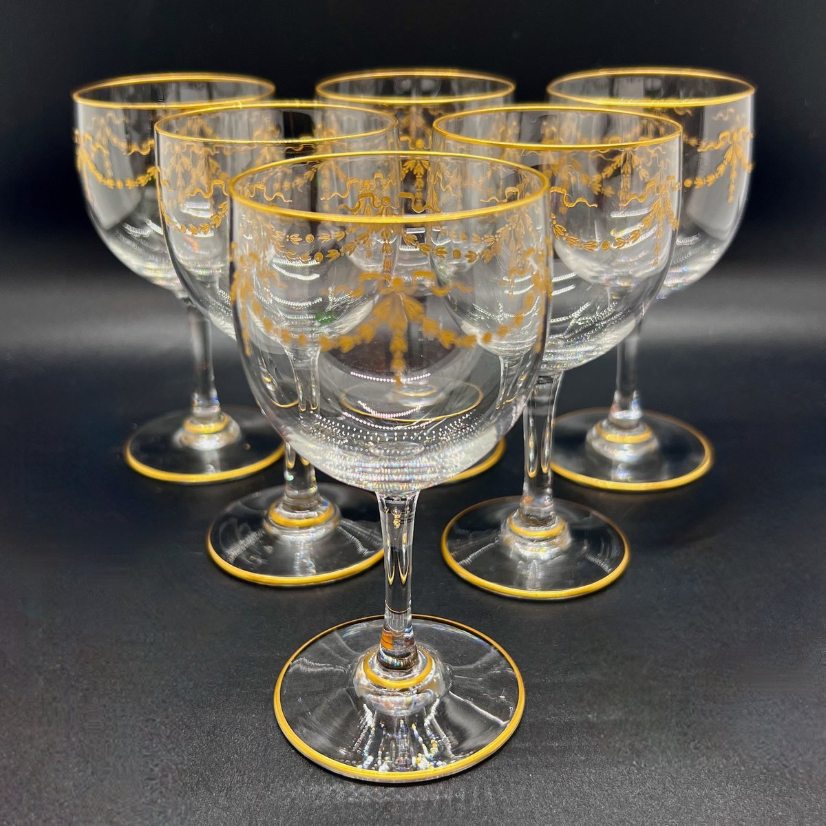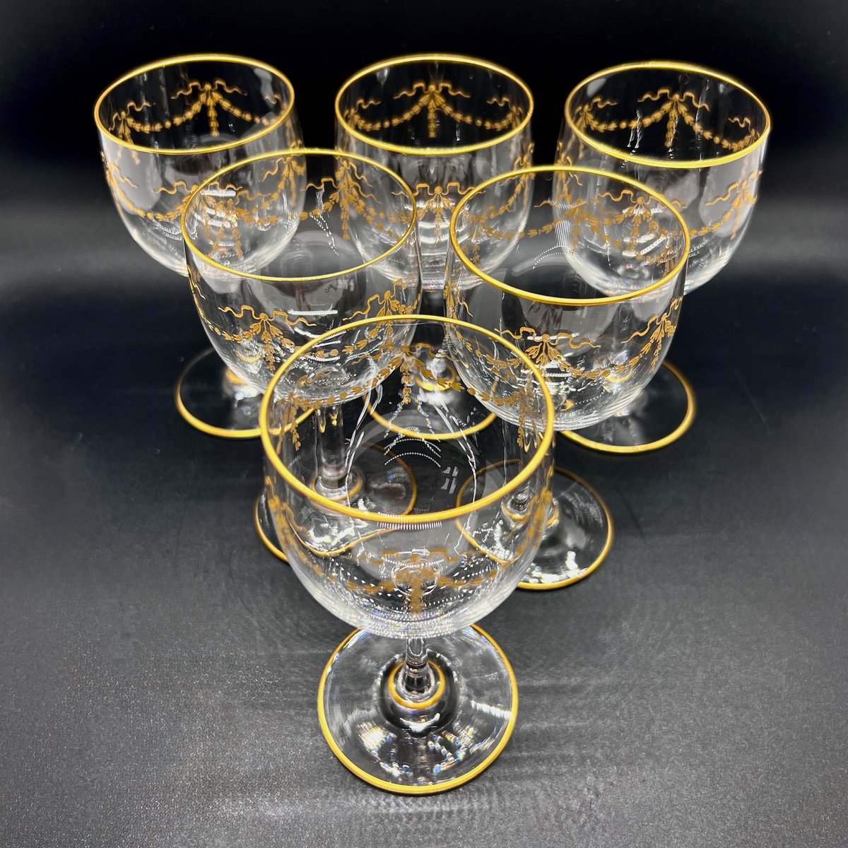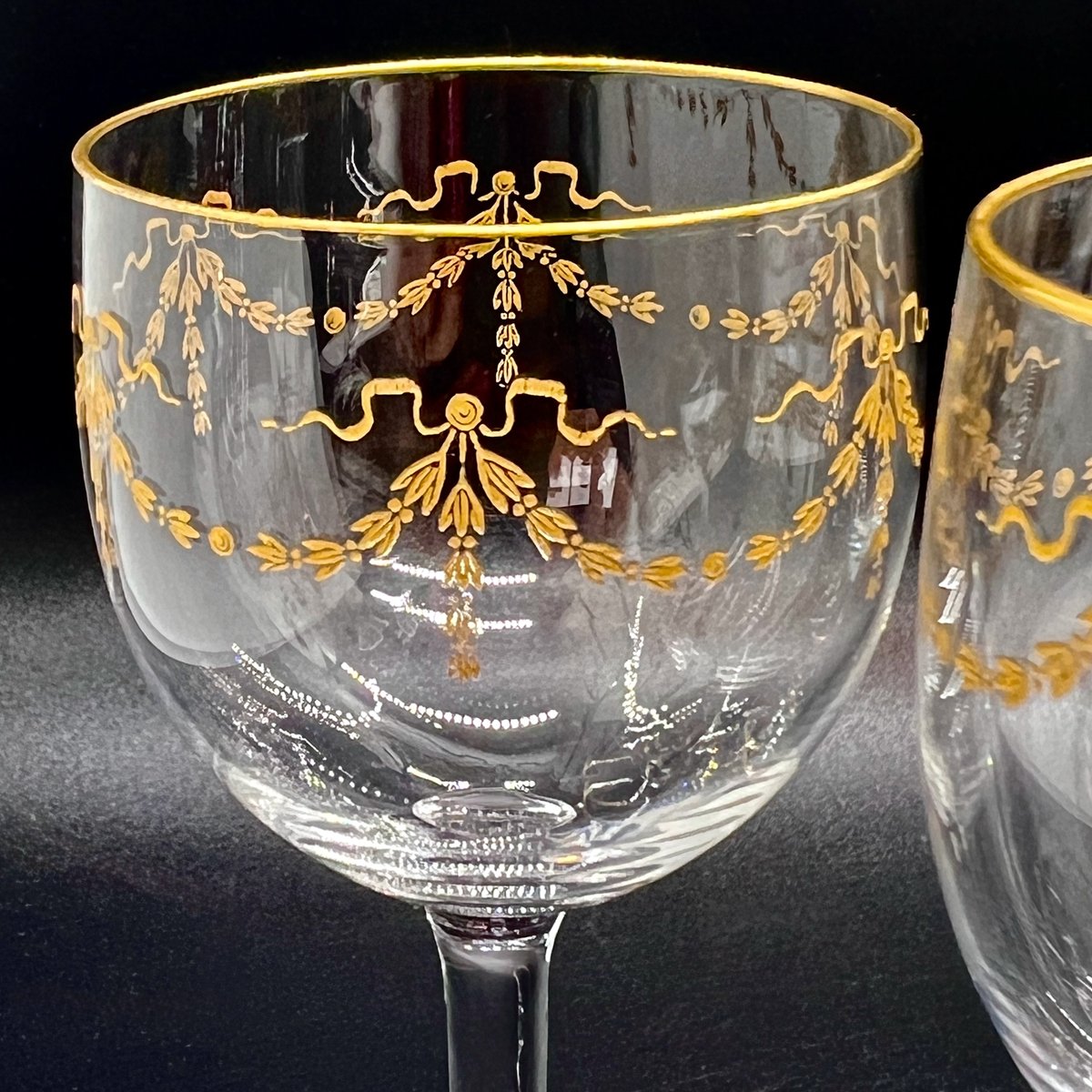 An antique rare Baccarat Louis XVI–style crystal service hand-blown, engraved and fire-gilded with neoclassical garlands and bows. The design appears in Baccarat’s firm 1916 catalogue under models 11582 and 7776, where this pattern is recorded as part of the mousseline crystal service. Although these examples are unmarked, Baccarat glassware from this Belle Époque period was often sold without etched marks, as the acid-etched logo was introduced only in the 1930s.
