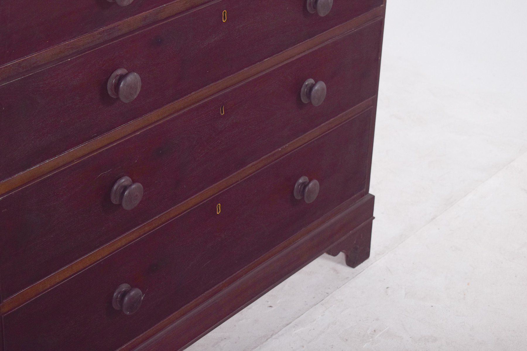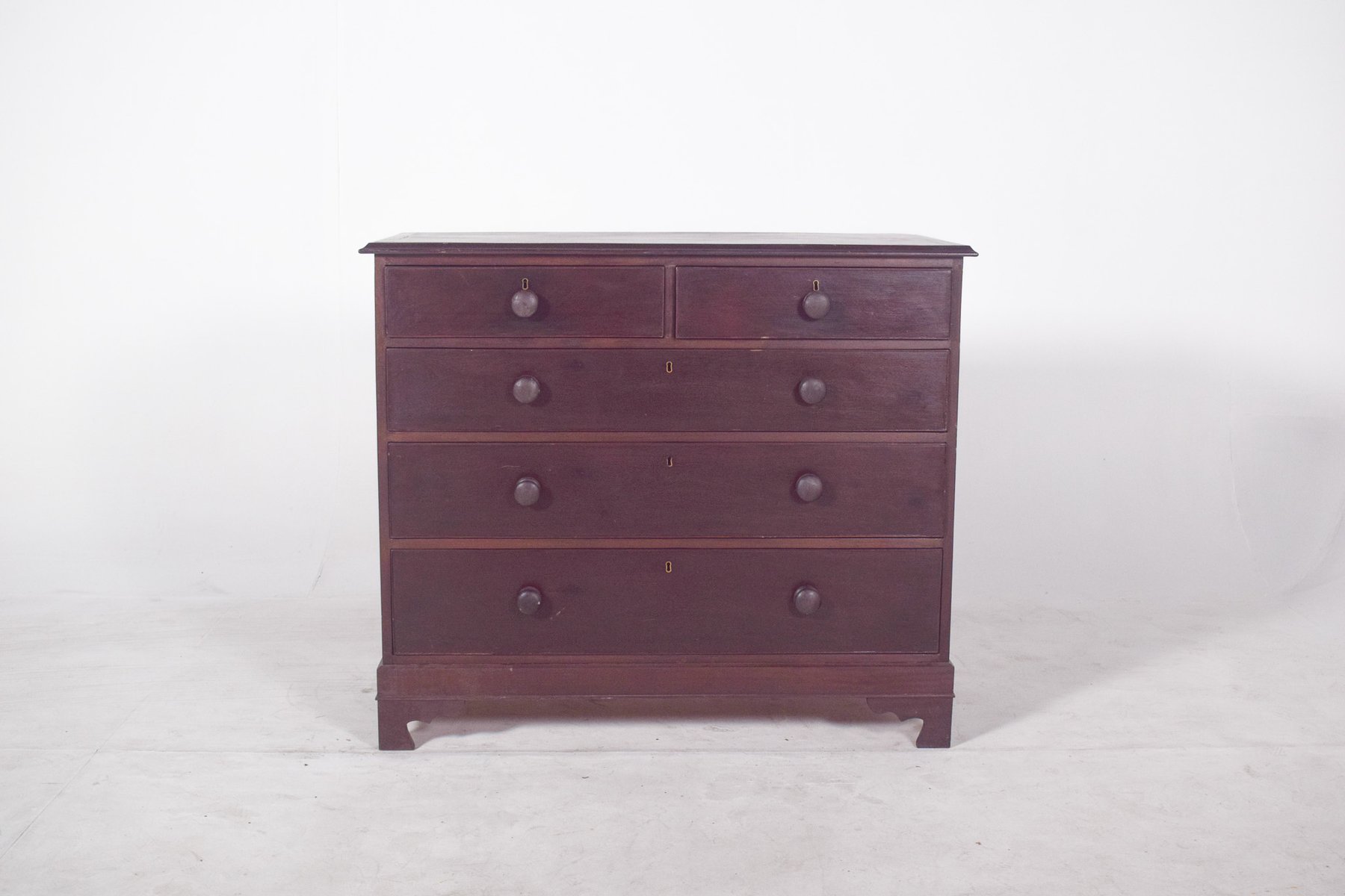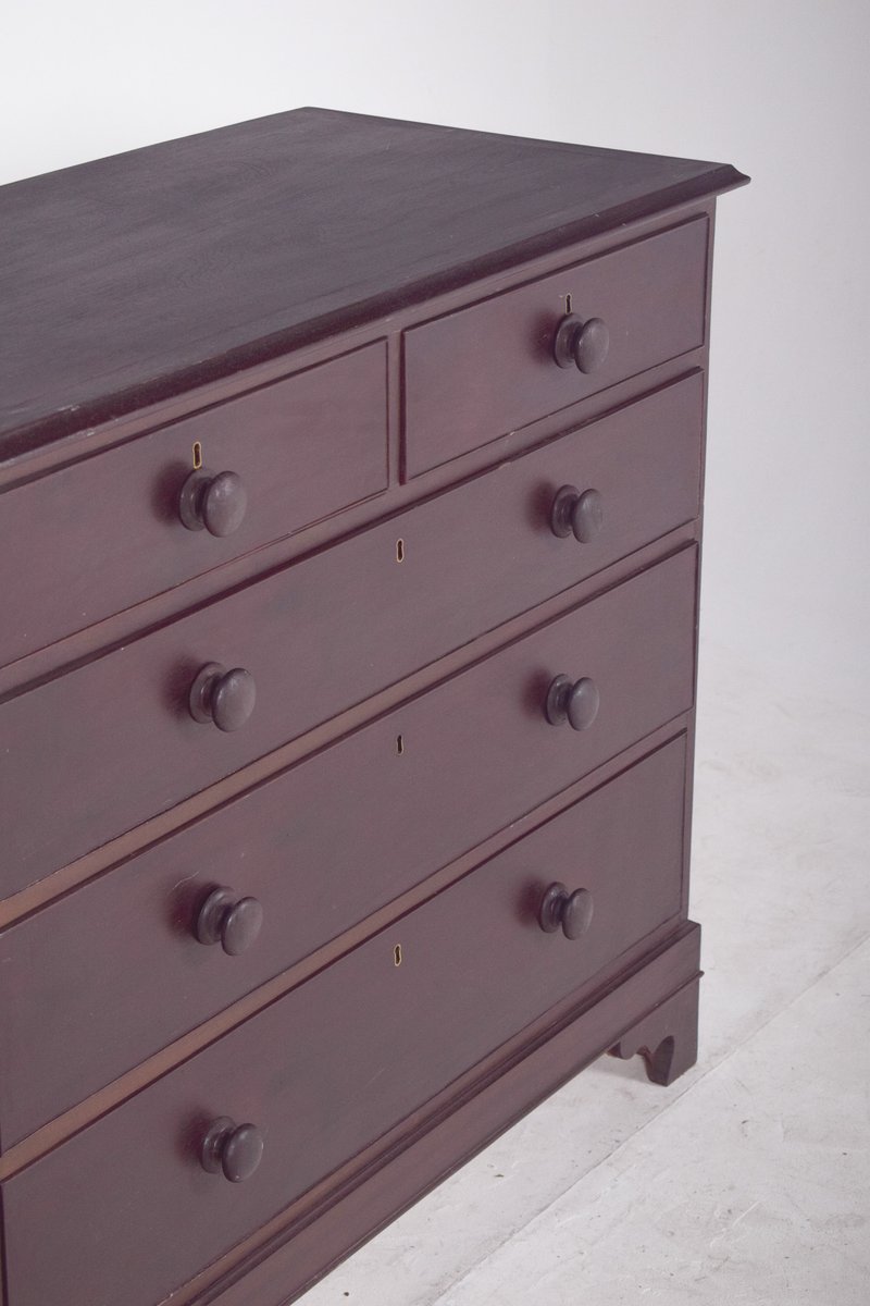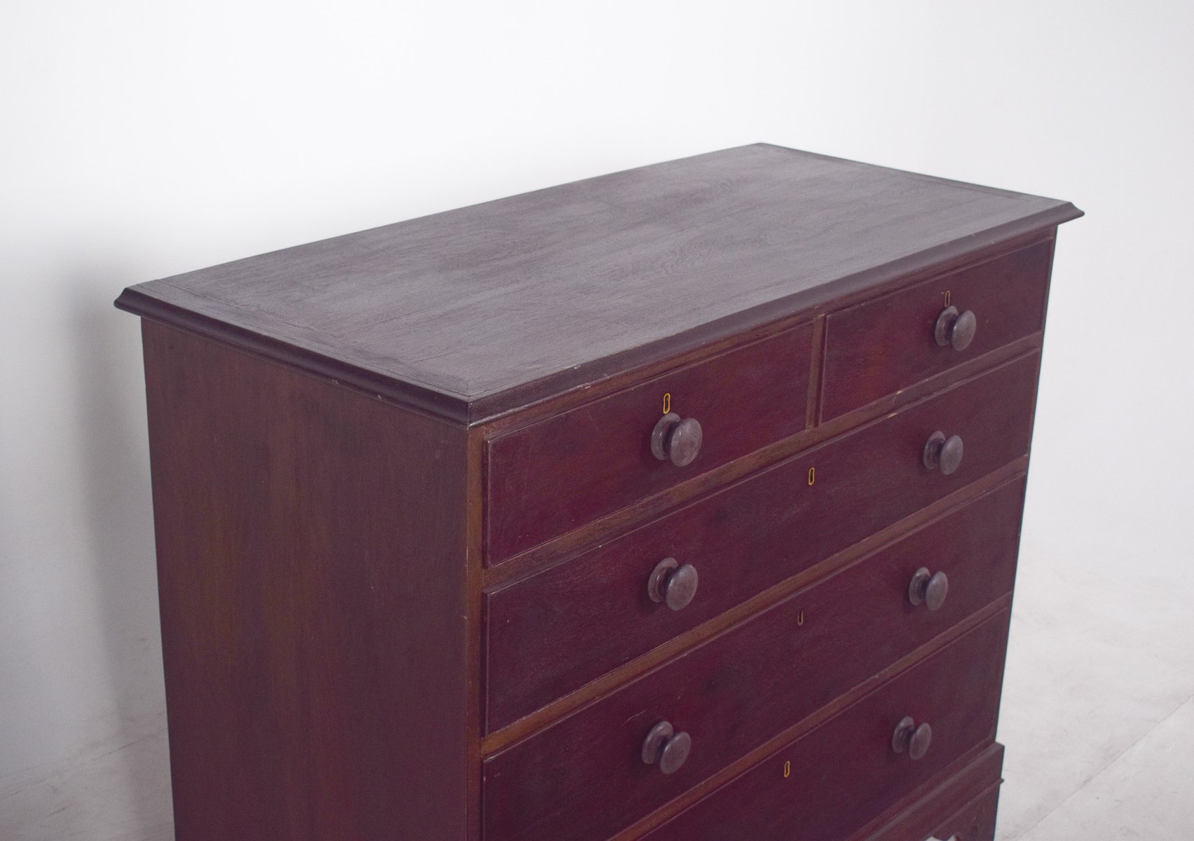 Romantische Kommode mit zwei und drei Schubladen. Mit einer glatten Oberfläche und geraden Linien, gekennzeichnet durch einen nüchternen und eleganten Stil, hat die Kommode fünf Schubladen, zwei kleinere oben und drei große unten, die eine praktische Unterteilung für die Aufbewahrung verschiedener Arten von Objekten bieten. Die Griffe sind rund, aus Holz im gleichen Farbton wie der Korpus, was die ästhetische Einheit des Stücks verstärkt.