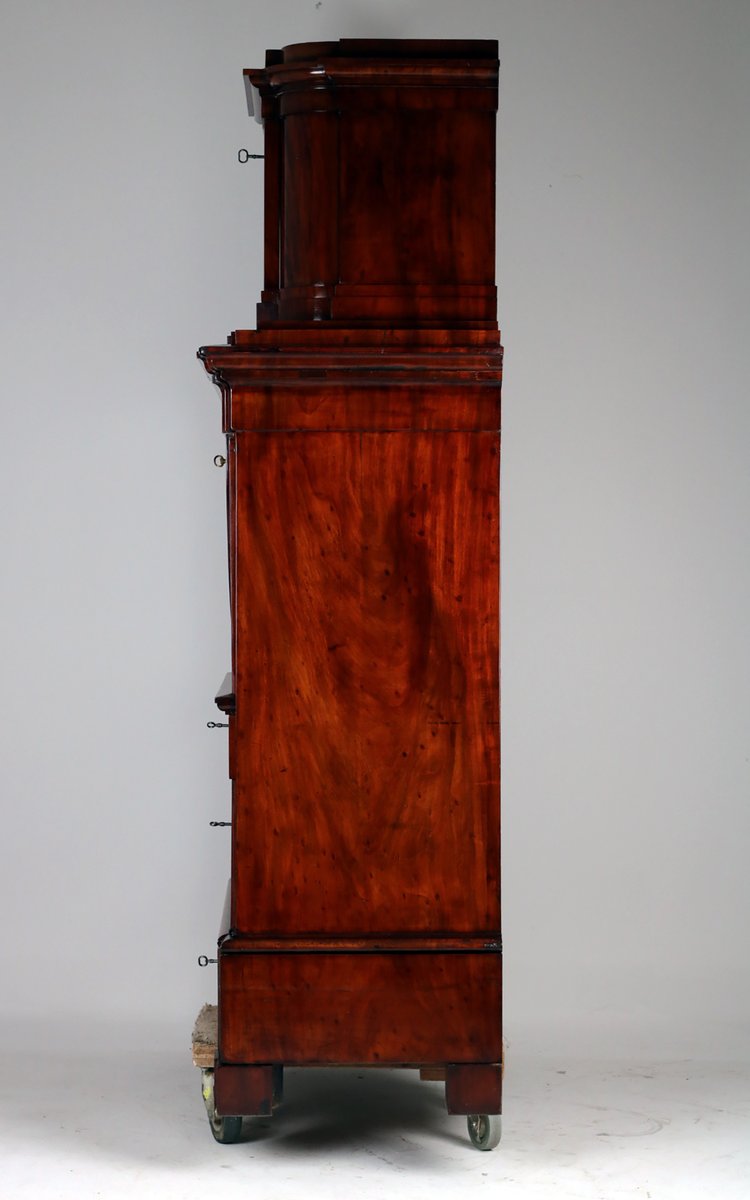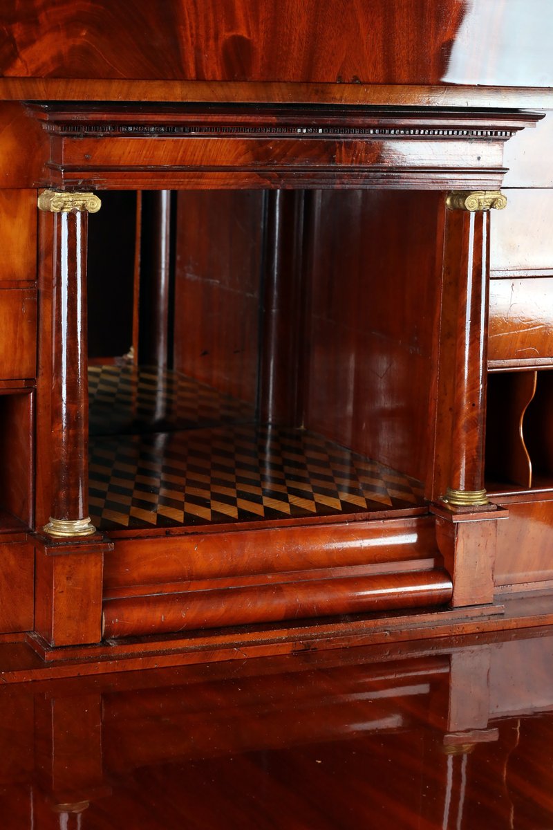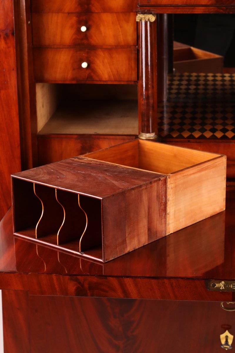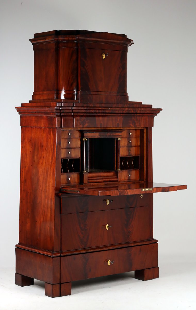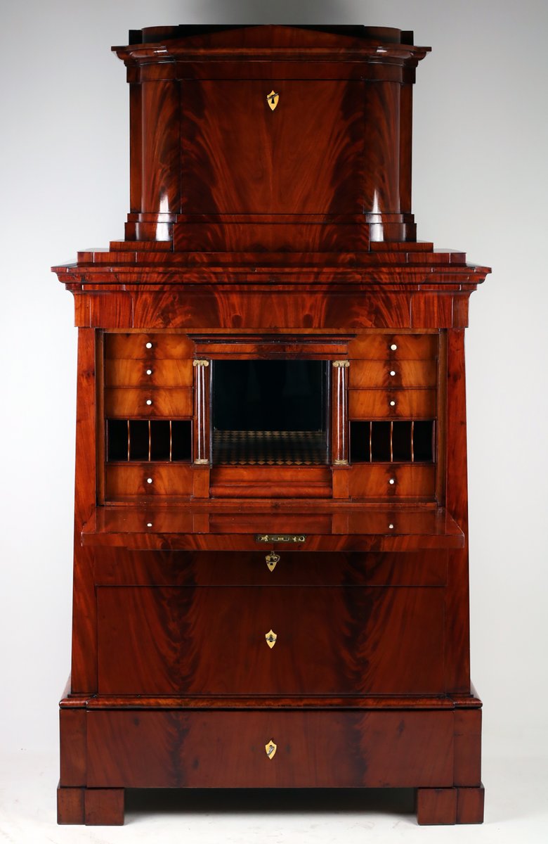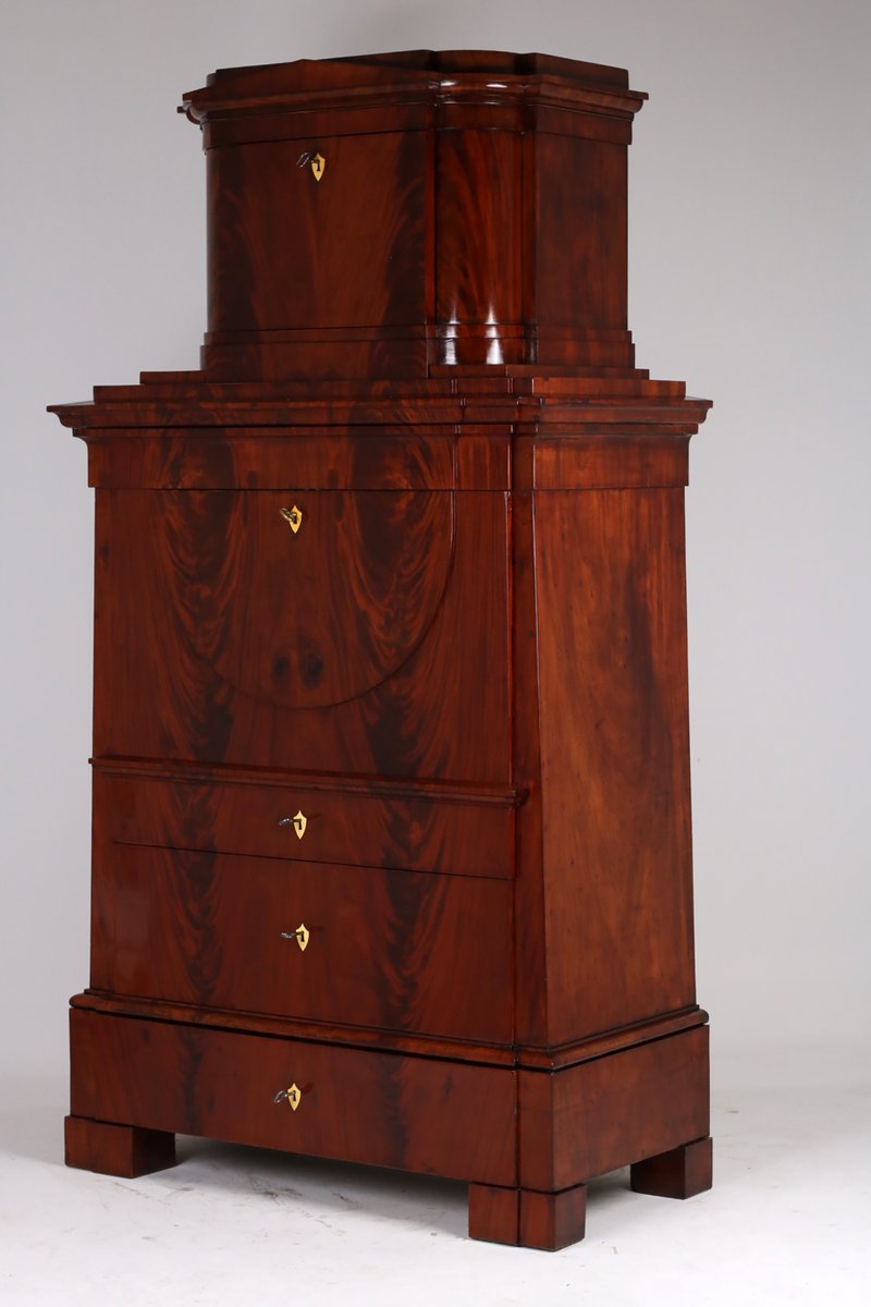 Beeindruckender Sekretär mit Aufsatz kleiner Giebel , verdecktes Fach wird mit Druckfeder geöffnet , sehr schönes Kabinett Innenraum mit Parketterie intarsiert und verspiegelt , mittig abgetrepptes Fach wird durch Drehen einer kleinen Säule geöffnet , 10 weitere kleine Schübe , 2 Brieffächer mit dahinter liegenden Ablagen , Schreibklappe mit gekippten Braunschweiger Bogen , Doppelzungenschlossschloss , insgesamt 5 Schlüssel , 3 große Schübe mit Schlössern , behutsam restauriert und mit Schellack handpoliert , Korpus ruht auf Klotzfüßen