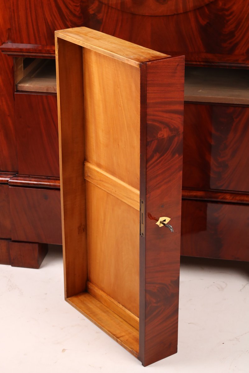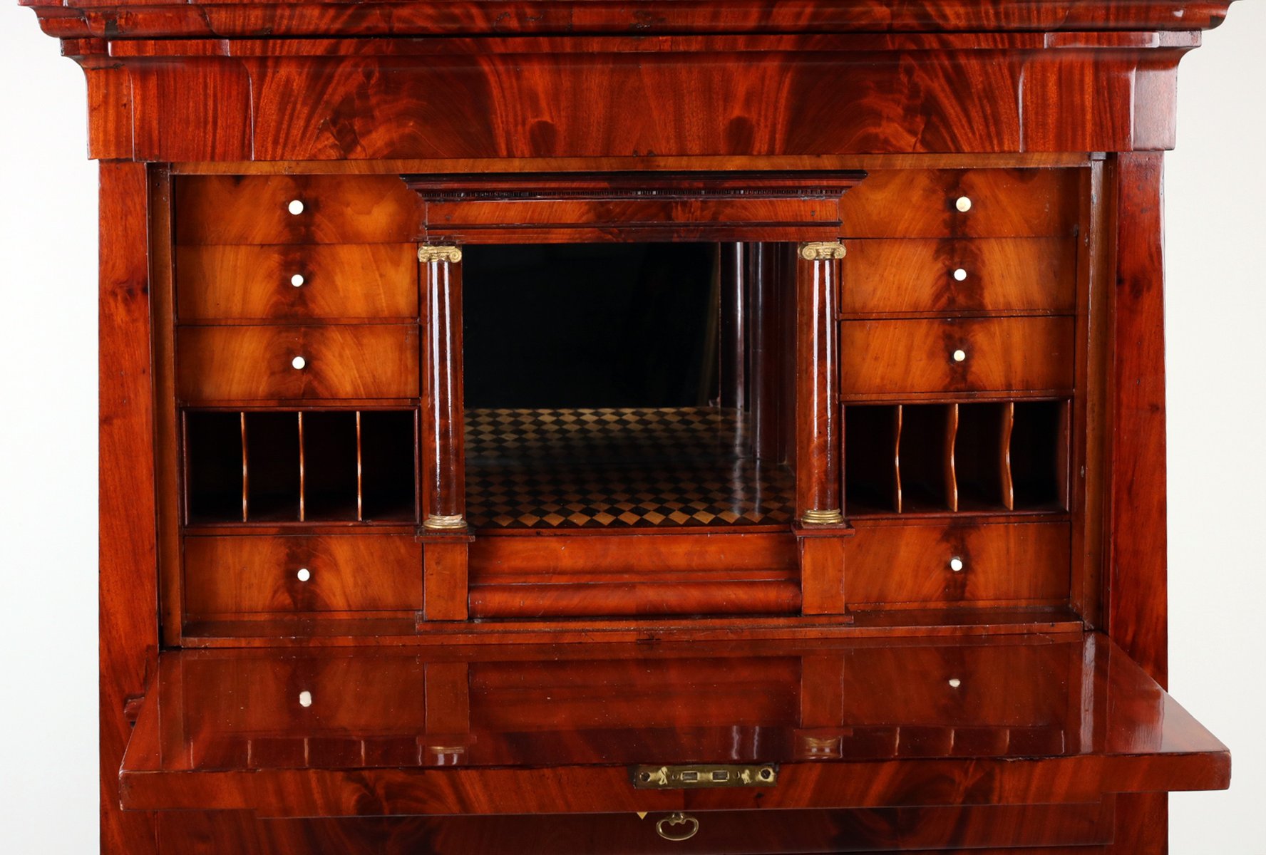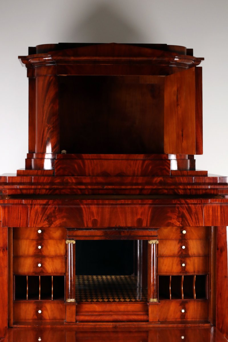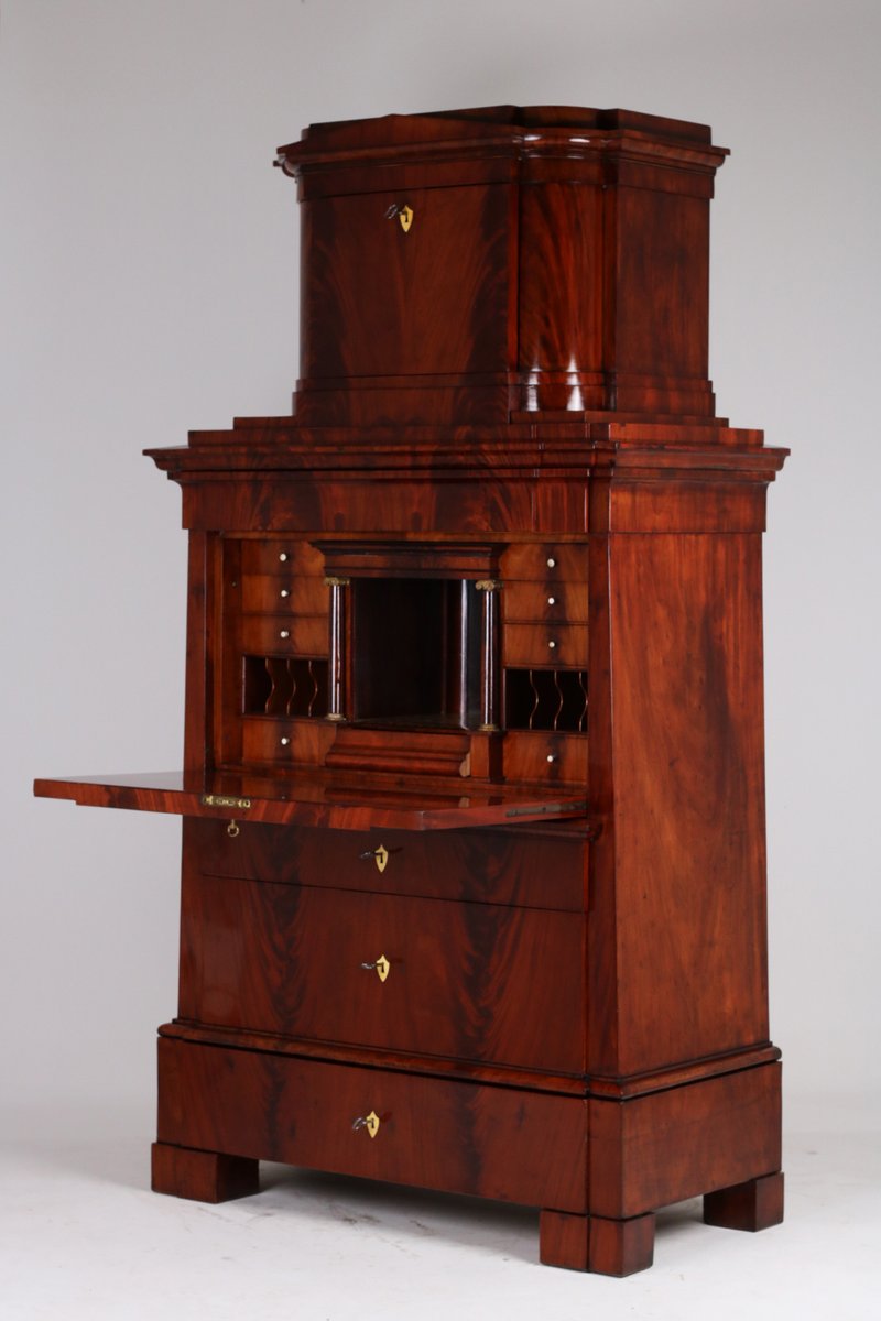 Impressive secretary desk with small pediment top, concealed compartment opens with a pressure spring, very beautiful cabinet interior with parquetry inlay and mirrored finish, stepped compartment in the center opens by turning a small column, 10 additional small drawers, two letter compartments with shelves behind, writing flap with tilted Braunschweig arch, double tongue lock, a total of five keys, three large drawers with locks, carefully restored and hand-polished with shellac, body rests on block feet.