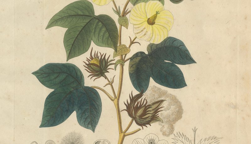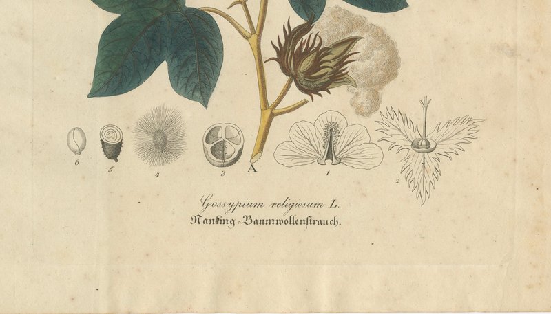 Antique Cotton Botanical Print, Gossypium Religiosum, c.1831 : This decorative botanical engraving illustrates Gossypium religiosum, another important cotton species, shown with flowers, seed capsules, and raw cotton fiber. Published in Zenker’s Merkantilische Waarenkunde, the plate complements other cotton subjects in the series and emphasizes variation within commercially cultivated species. Original hand coloring adds warmth and depth, particularly in the blossoms and seed structures, making this plate especially appealing for interior display.