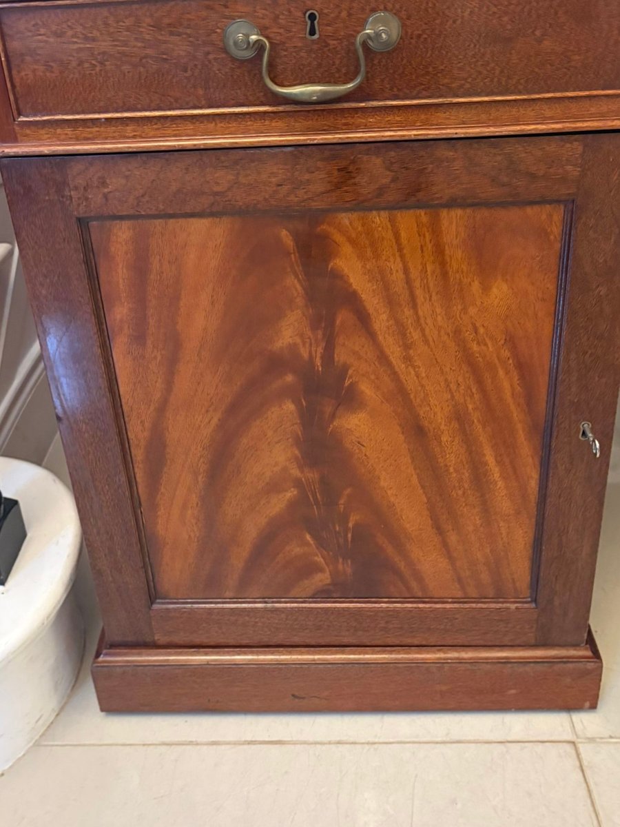 Constructed in well-figured mahogany with a warm, mellow tone, the desk stands on a plinth base fitted with concealed castors for ease of movement. The drawers are finely dovetailed and retain their original turned mahogany knobs. The piece separates into three sections—top and two pedestals—for convenient transport and installation.