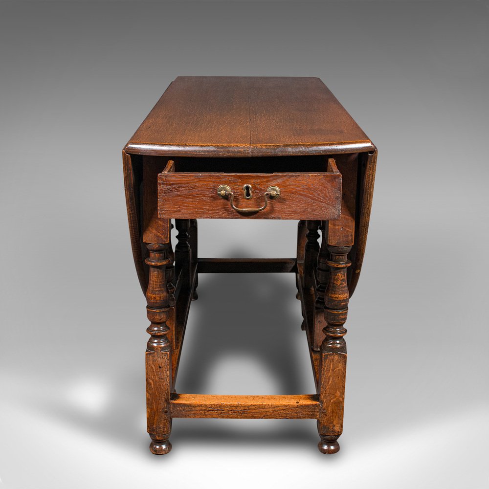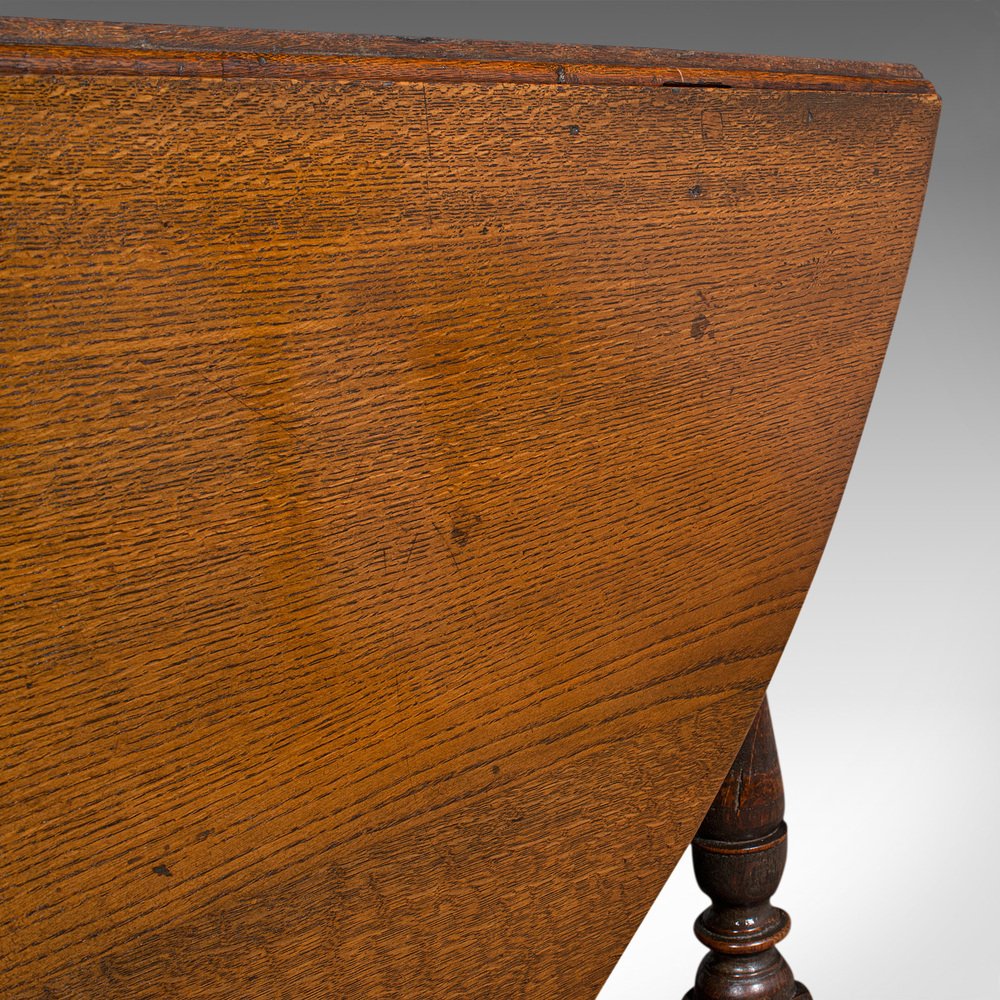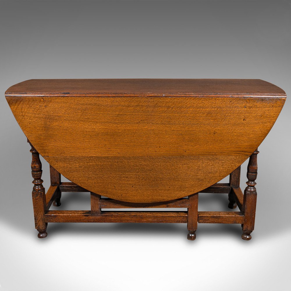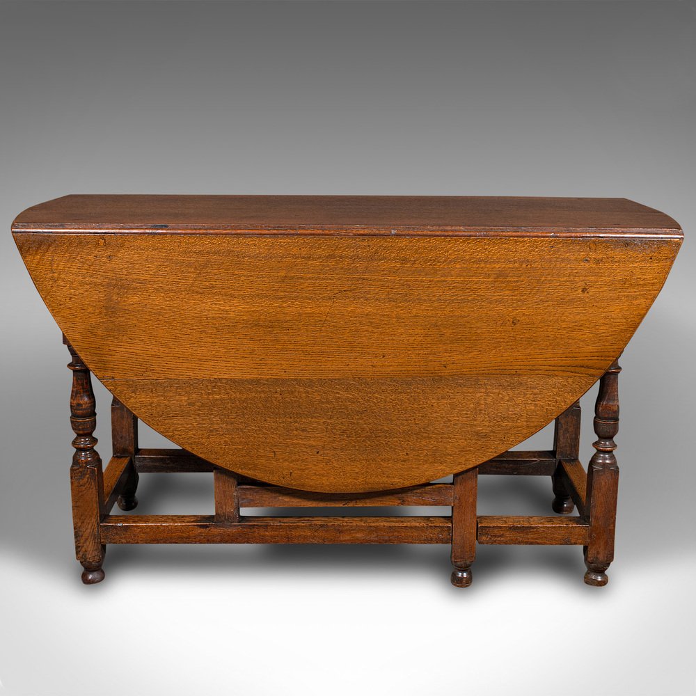 This is an antique 4-6 seat gate leg table. An English, oak oval extending farmhouse table, dating to the early Georgian period, circa 1750.