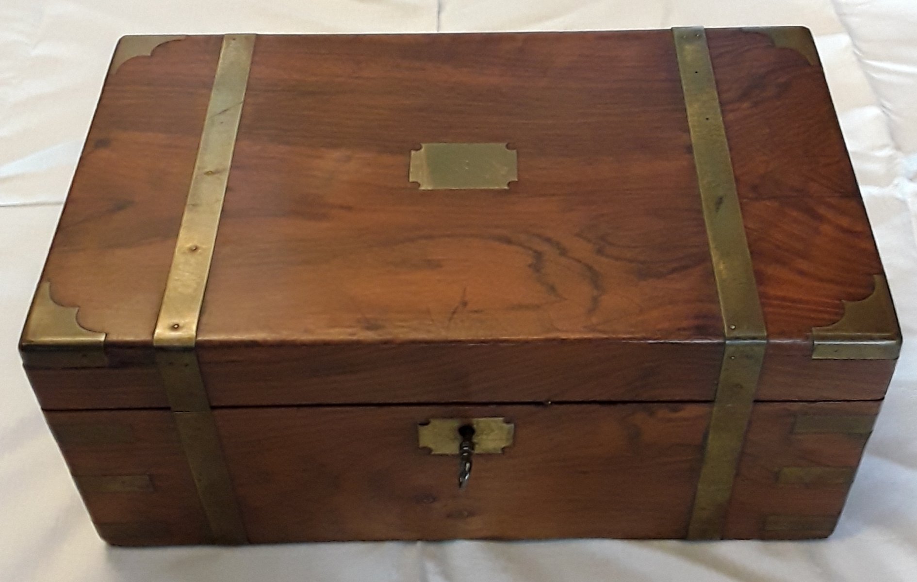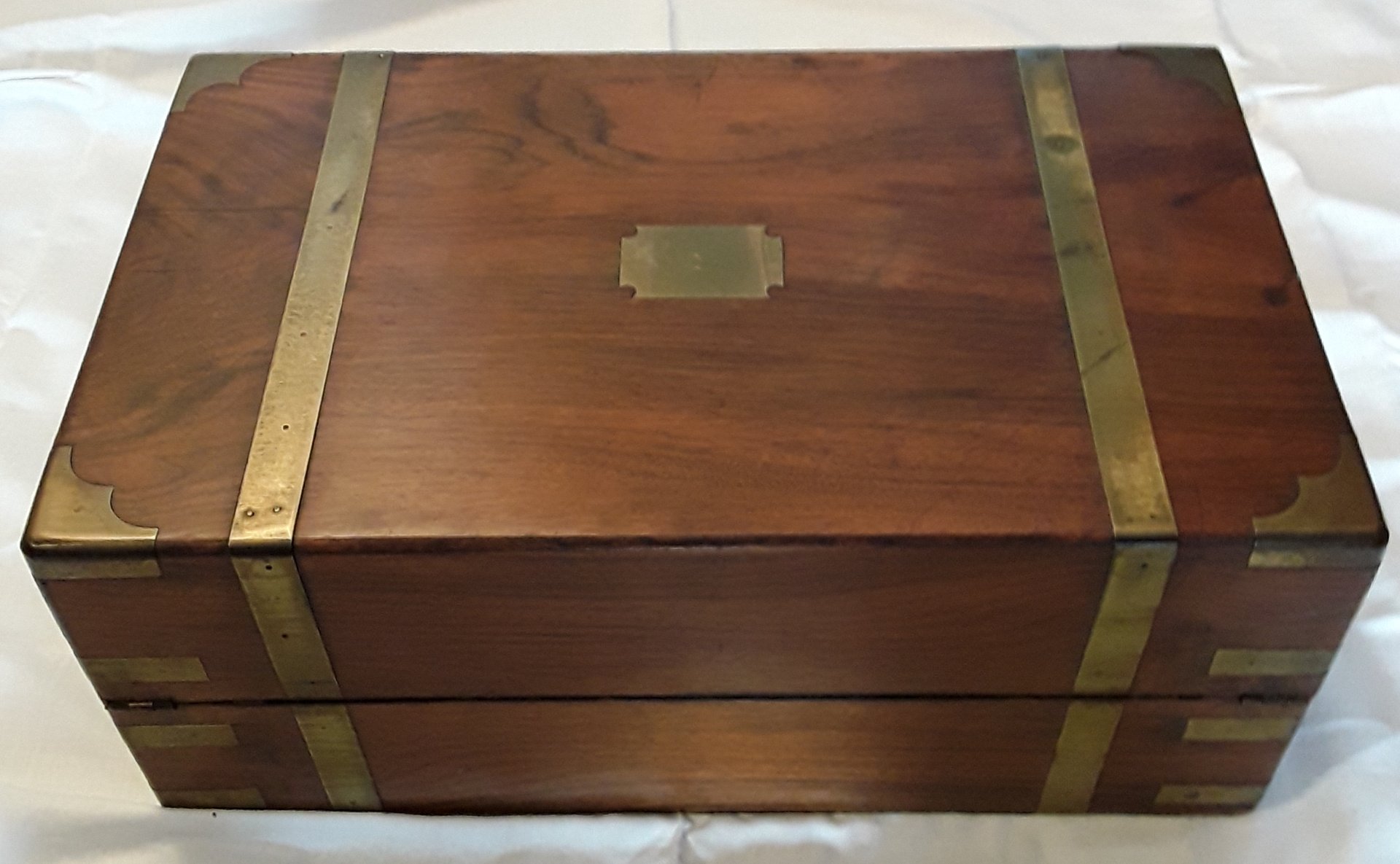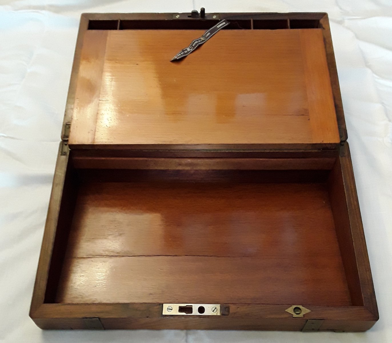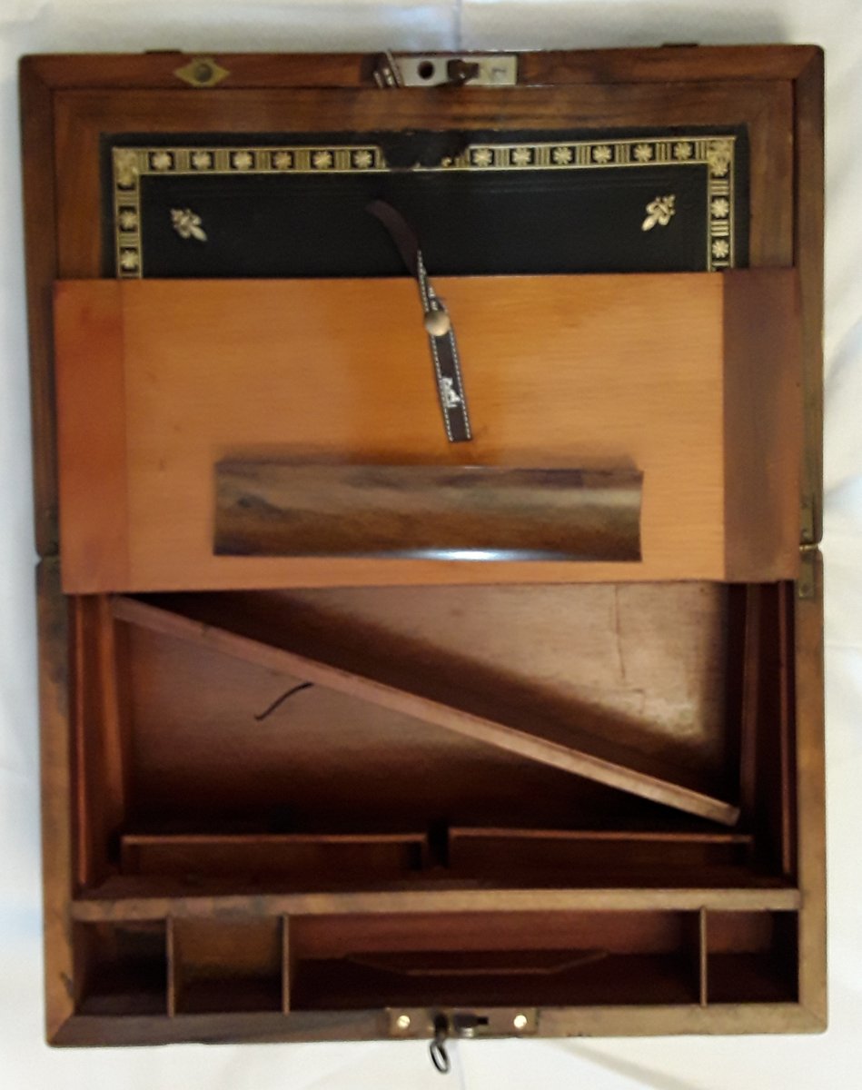 Antiker englischer Intarsia Schreibtischkasten aus Nussholz & Messing mit Geheimfach