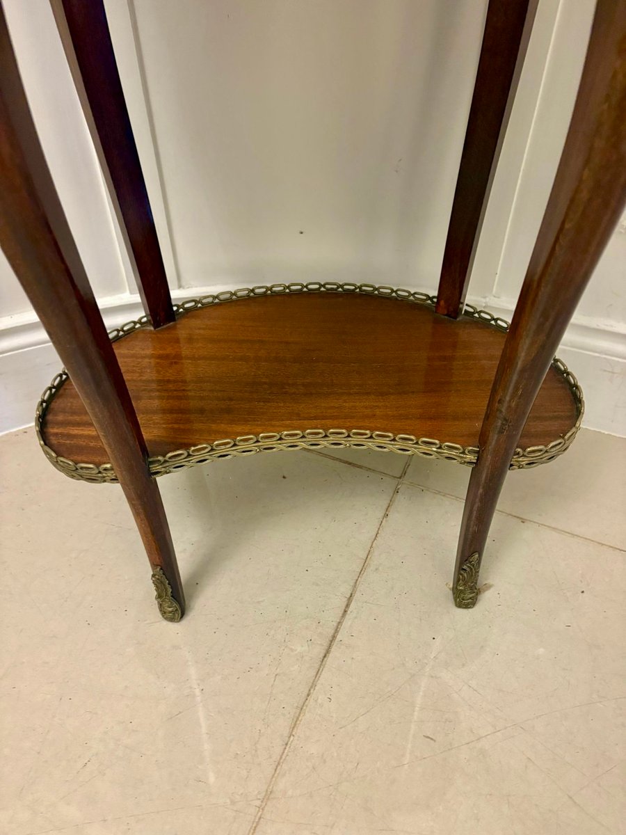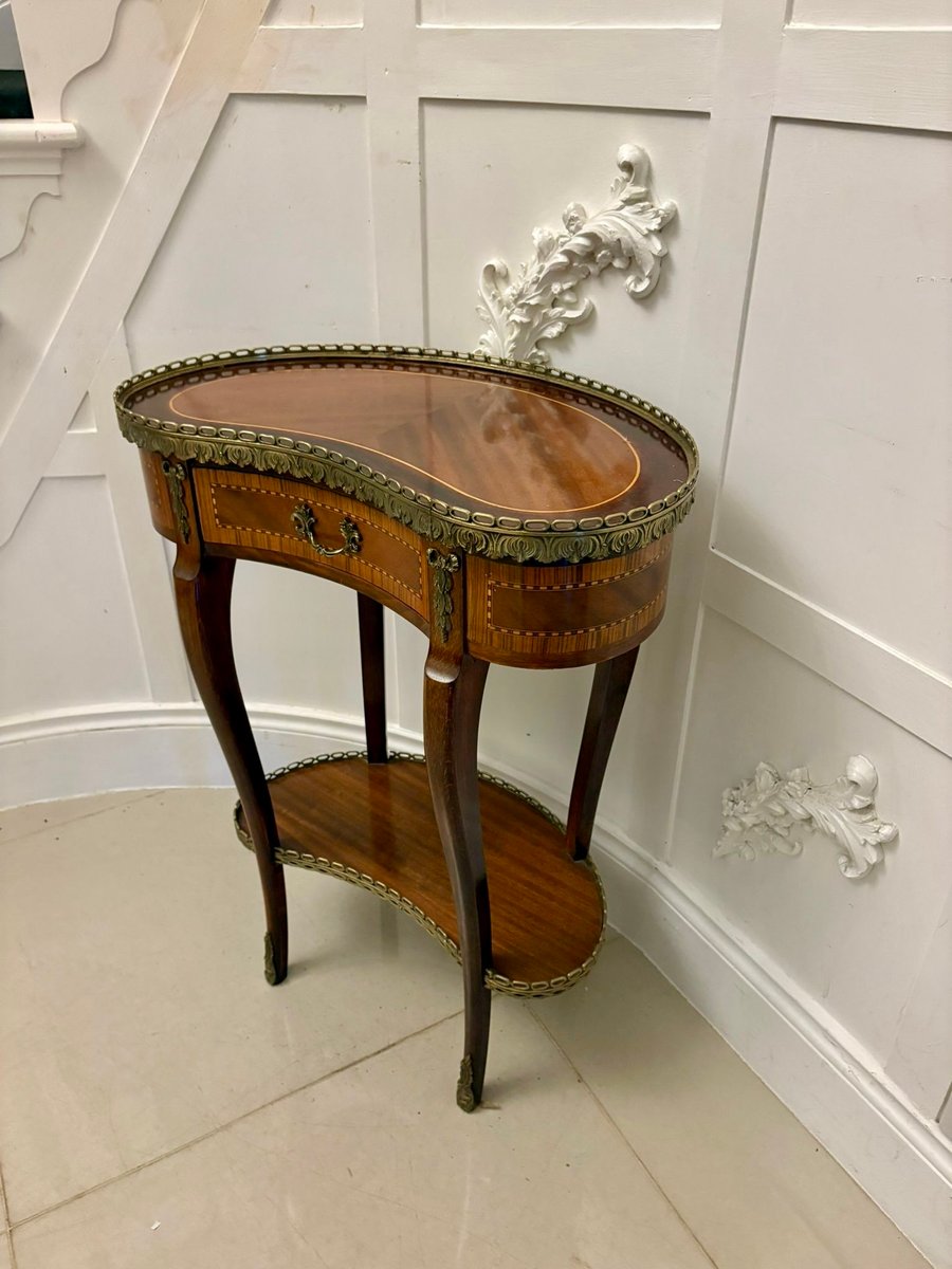 Ein feiner antiker französischer nierenförmiger Beistelltisch im Louis XV-Stil von eleganter, raffinierter Form. Die geformte Platte ist schön in gut ausgewählten Mahagoni mit Satinholz Querbändern furniert, innerhalb einer verzierten durchbrochenen Messing Galerie eingeschlossen. Unter der Platte befindet sich eine einzelne Schublade mit Fries, die ihren ursprünglichen dekorativen Messinggriff und klassische Ormolu-Beschläge an den Ecken beibehält.