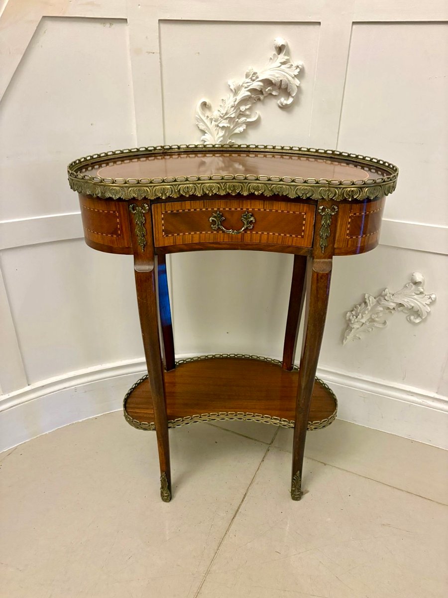 A fine antique French Louis XV style kidney-shaped occasional table of elegant, refined form. The shaped top is beautifully veneered in well-chosen mahogany with satinwood crossbanding, enclosed within an ornate pierced brass gallery. Beneath the top sits a single frieze drawer retaining its original decorative brass handle and classical ormolu mounts to the corners.