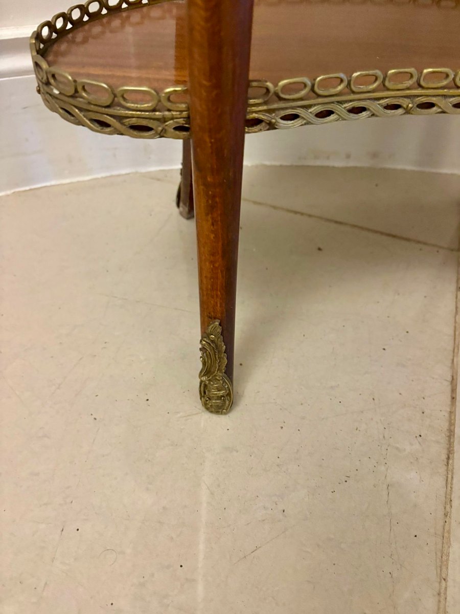 Der Tisch steht auf vier schlanken, leicht geschwungenen Cabriole-Beinen, die durch einen unteren nierenförmigen Unterbau verbunden sind, der ebenfalls mit einer passenden durchbrochenen Messinggalerie eingefasst ist. Die Kombination aus feinen Furnieren, warmen Farben und hochwertigen Beschlägen macht den Tisch zu einem außergewöhnlich dekorativen Stück.