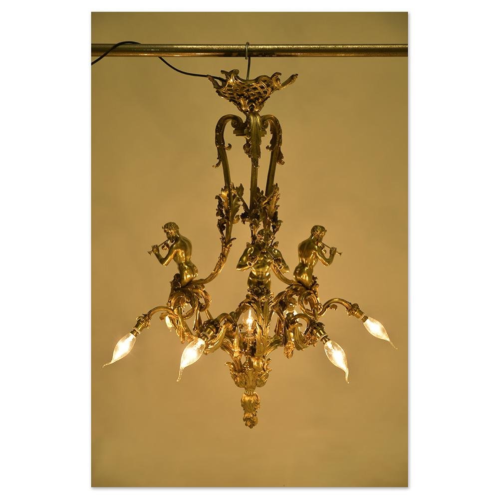 This spectacular gilt bronze chandelier, signed Mottheau, embodies all the richness of the French Rococo style. Adorned with mythological figures and finely chiseled foliage, it offers a theatrical brilliance and exceptional ornamental mastery. Every detail, from the sconces to the decorative mascarons, testifies to the expertise of a renowned bronze artist. Main characteristics: - Materials: Gilt bronze with original gilding, richly molded and chiseled. The brilliance of the metal magnifies each curve and sculpted relief. - Structure: Composition with five light arms, animated by satyr musicians playing the double flute. The central body is highlighted by foliage, scrolls and an openwork crown in a flower basket at the top. - Dimensions: 86 cm high, 74 cm in diameter. A generous size, ideal for magnifying a living room, a stairwell or a reception room. - Signature: "Mottheau" stamp, a guarantee of authenticity and artisanal excellence. Wiring in place, to be checked or have revised by a professional. A chandelier that is both majestic and poetic Perfect for: - Enhance a classic, baroque or empire style decoration with an exceptional object. - Bring a touch of pomp to a contemporary interior in search of refined contrast. - Integrate a collection of art lighting or become the centerpiece of a historical decor. This chandelier by Mottheau is more than a light fixture: it is a suspended work of art, combining theatrical elegance, technical precision and decorative presence.