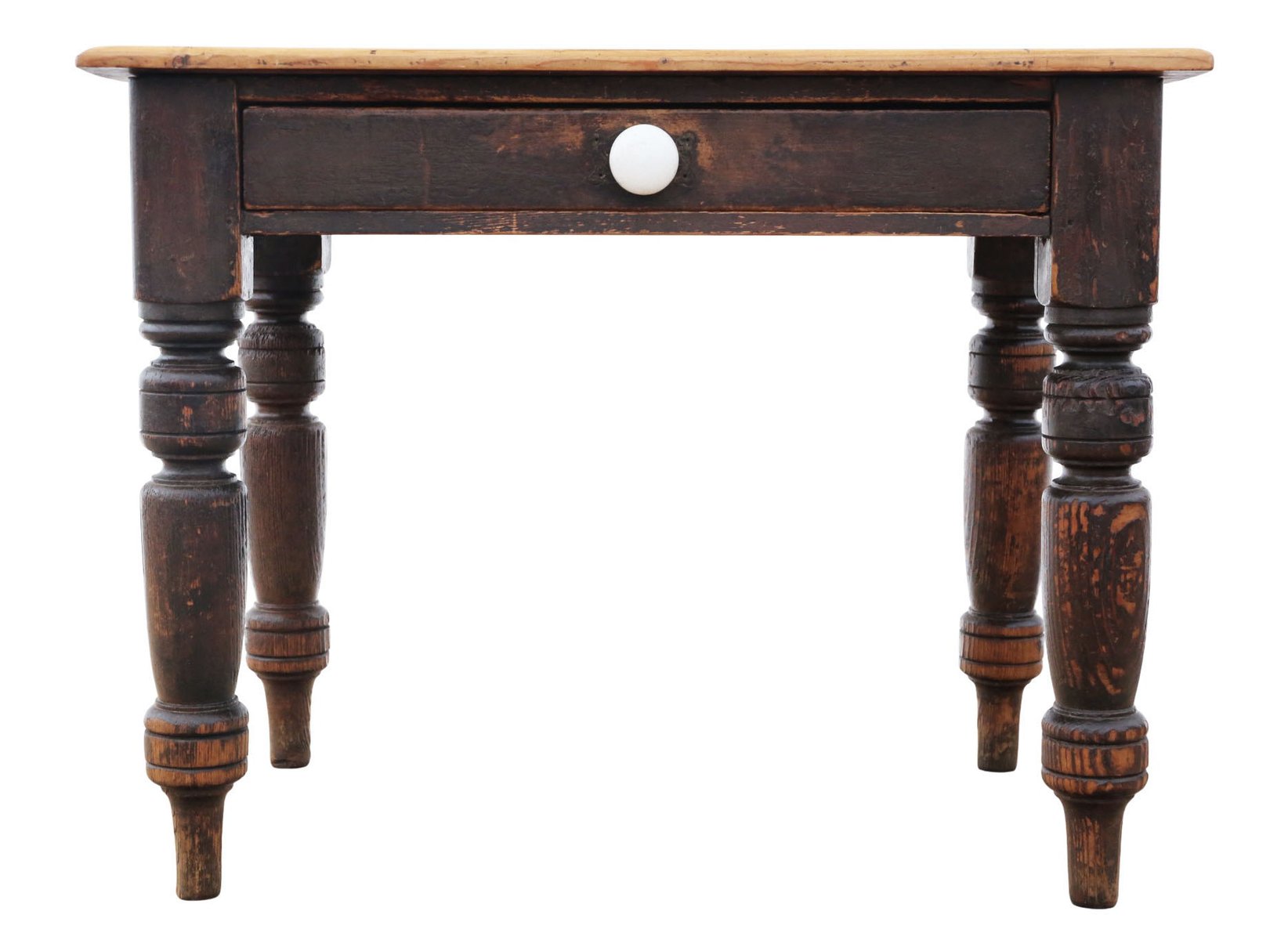 A charming 19th-century pine kitchen or writing table with attractive age, colour, and patina. This rare decorative find would make a wonderful statement piece in the right setting. Its base retains its original finish, and the drawer features a white ceramic knob with appealing surface crazing from age.