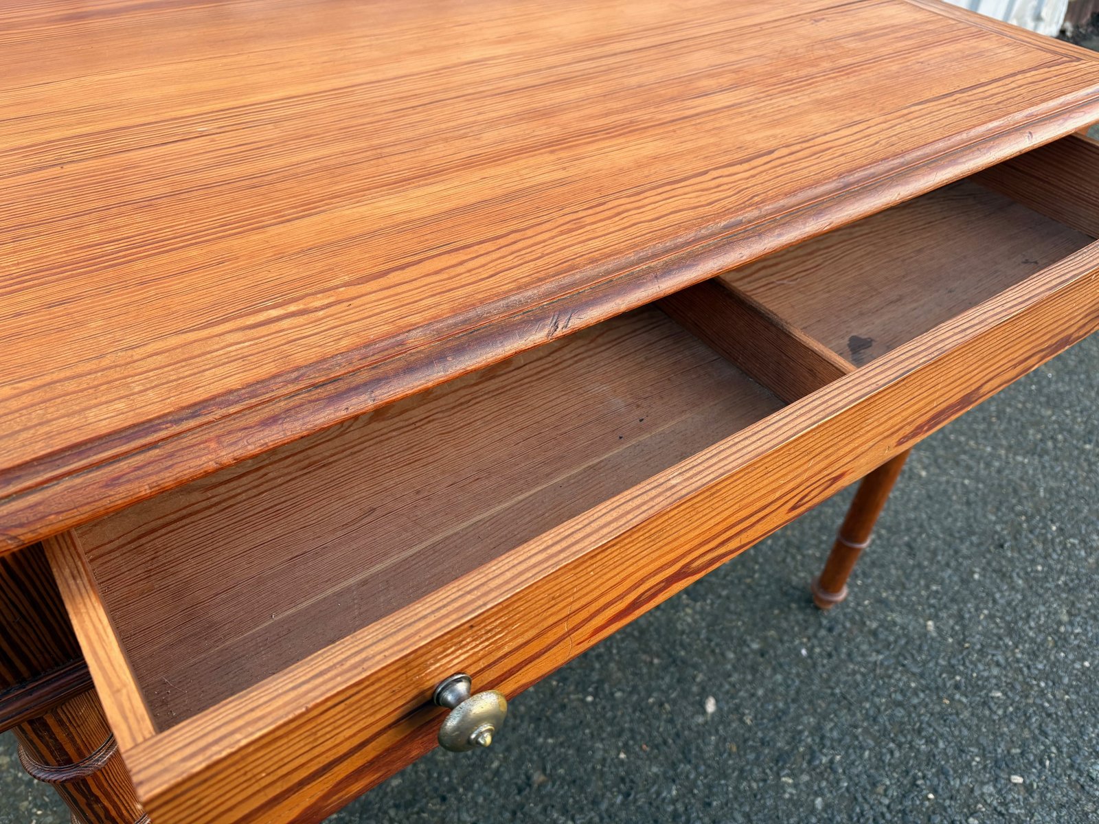 Elegant antique desk in pitch pine, a wood renowned for its robustness and deep grain. This piece features beautiful natural hues, a framed top, and a central drawer with dovetail joints, a testament to its craftsmanship.