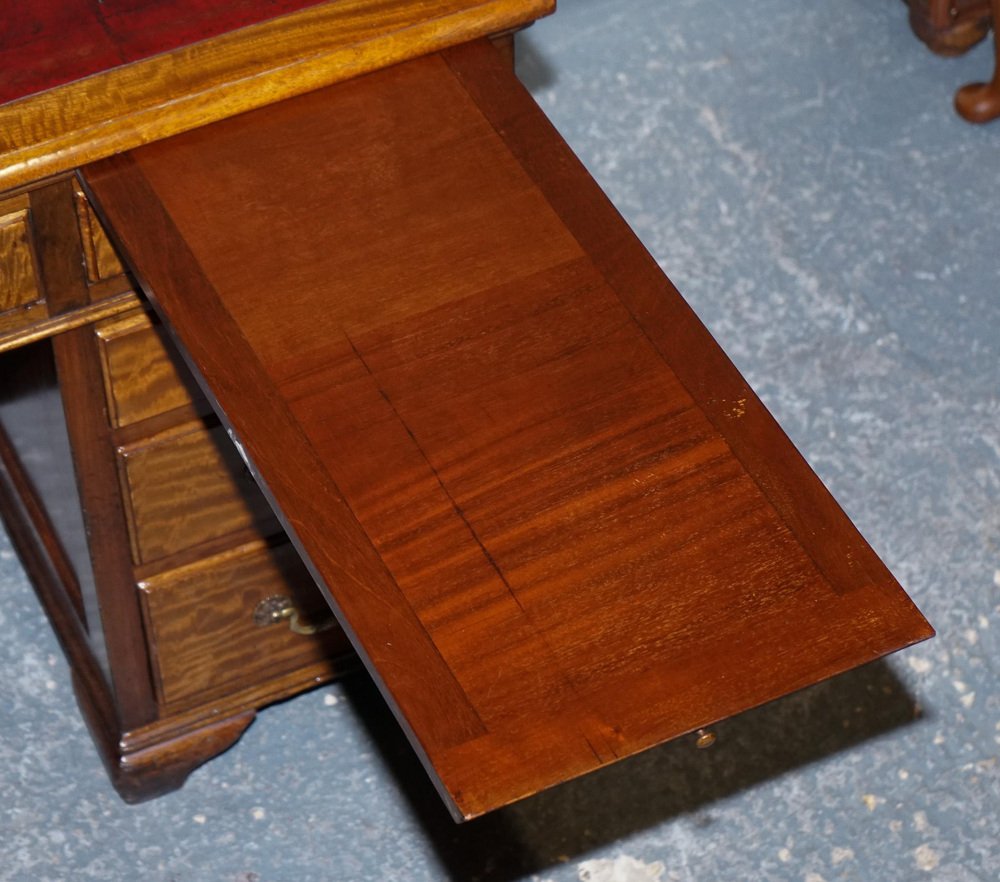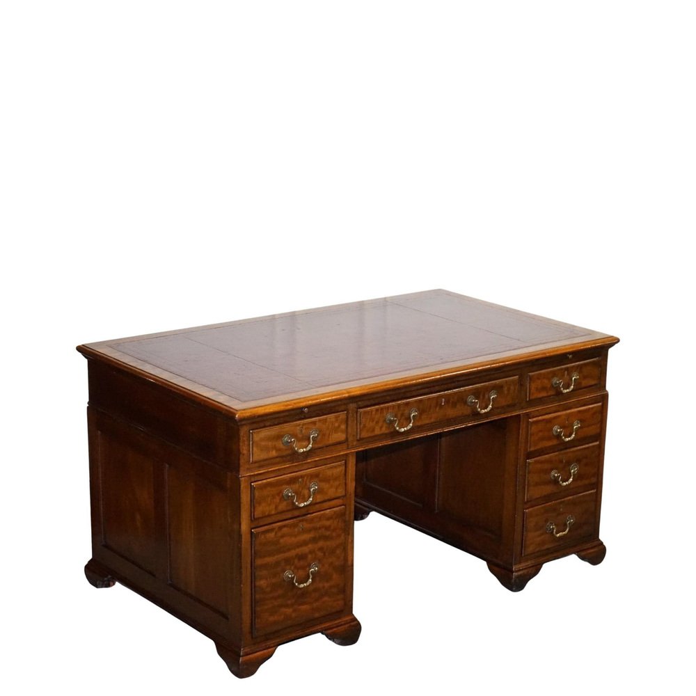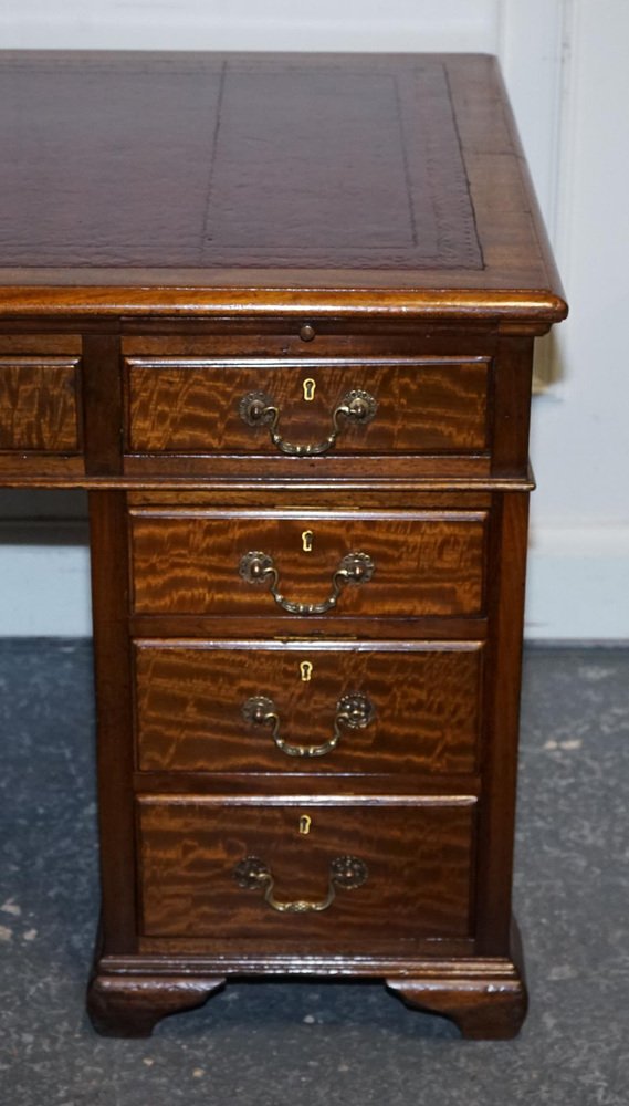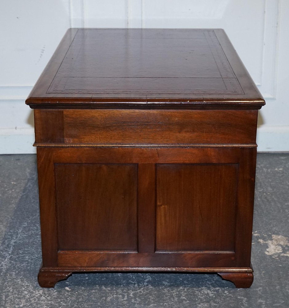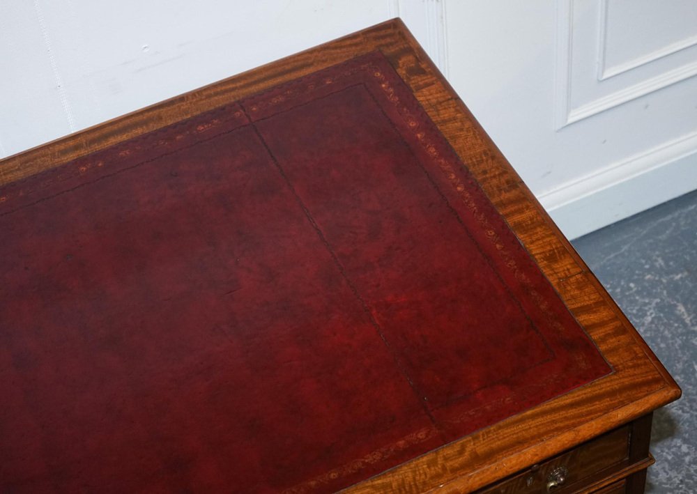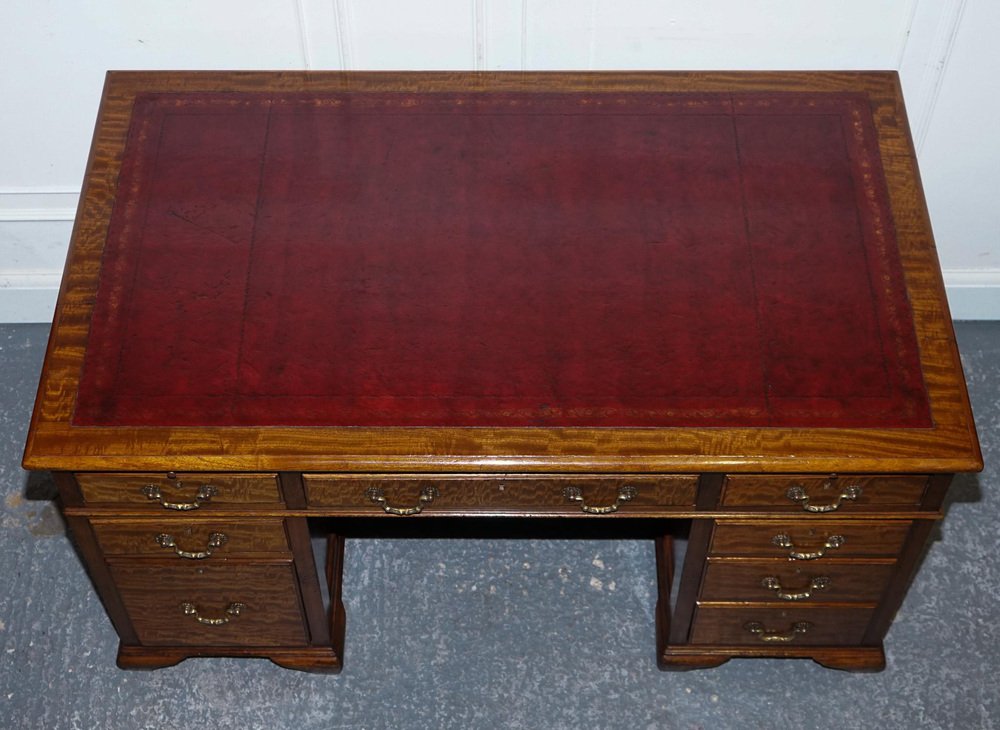 Antiques of London A beautifully restored antique twin pedestal desk by Hobbs & Co., London, a firm celebrated for its superior Victorian craftsmanship and refined cabinetmaking. This impressive desk showcases a classic, well-balanced silhouette with finely constructed drawers, traditional mouldings, and the robust presence expected from a prestigious London maker of the period. The restoration has been carried out with sensitivity, preserving the character of the wood while enhancing its natural warmth and depth. The standout feature of this piece is its hand-dyed red leather top, a luxurious and artisanal finish that elevates the entire desk. The leather has been dyed and finished by hand, creating rich layers of crimson tones that shift subtly across the surface. This process allows the natural texture and grain of the hide to show through, resulting in a surface with movement, depth, and a uniquely elegant patina. The colour is further enhanced by the traditional tooling around the border, adding refinement and a sense of timeless craftsmanship. Hand-dyed leather is achieved through a slow, intentional artisanal method using high-quality vegetable-tanned hides. The leather is carefully prepared, then colour is applied in soft, building layers using cloths and hand-blending techniques. As each layer is worked into the hide, the depth of tone grows, creating a finish that feels organic, warm, and full of character. The final sealing with waxes and oils enriches the sheen, protects the surface, and ensures the leather will age beautifully for decades to come. This Hobbs & Co. desk is a statement piece. Functional, distinguished, and deeply crafted. Perfect for a study, office, or creative space, it brings together heritage, artistry, and a bold, sophisticated aesthetic. Please carefully examine the pictures to see the condition before purchasing, as they form part of the . If you have any questions, please message us. Measurements Height - 73 cm Width - 140 cm Depth - 81 cm Kneehole height - 55 cm Kneehole width middle - 58 cm Kneehole width bottom - 55 cm Please note all measurements are taken to the widest point of the item. Wear consistent with age and use.