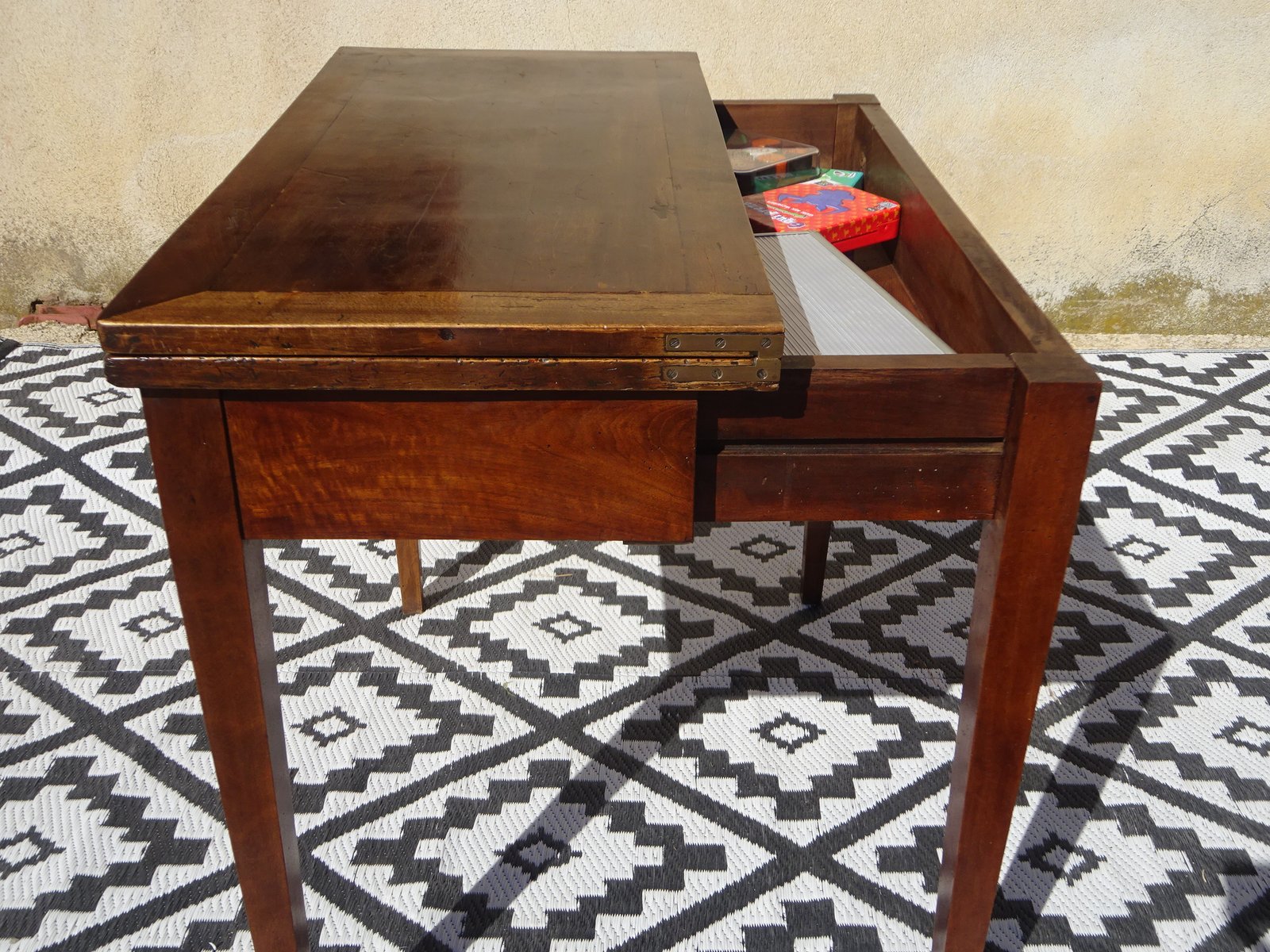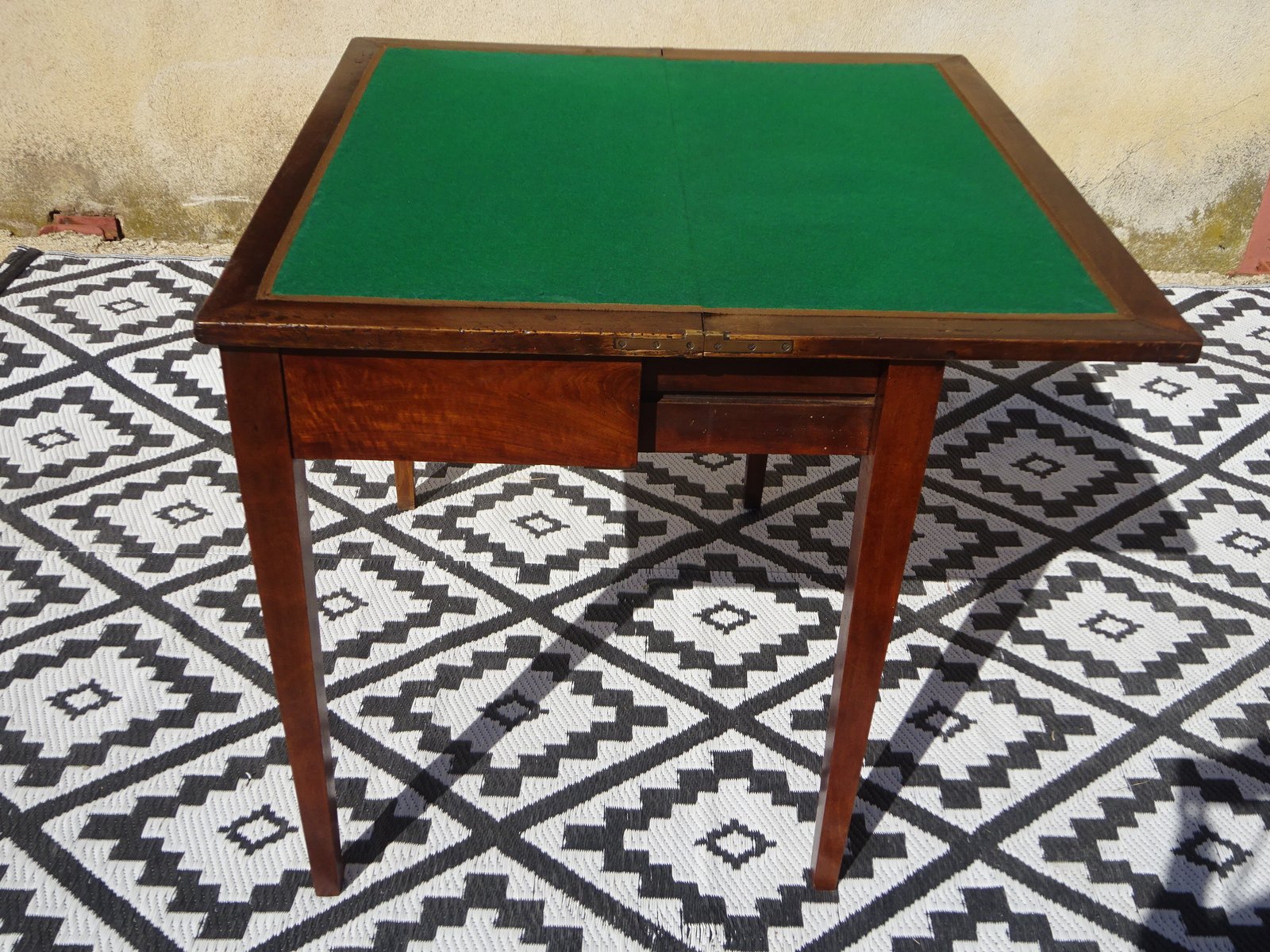 Klappbarer Spieltisch im schlichten, geradlinigen Konsolenstil, aus massivem Nussbaumholz. Antikes Möbelstück aus dem 19. Jahrhundert. Schlichter Konsolentisch mit klappbarer Platte, die sich öffnen lässt und eine grüne Spielfläche freigibt. Die Spielfläche ist nicht original. Eine unterhalb angebrachte Schublade mit zwei Füßen bietet ausreichend Halt für die geöffnete Tischplatte. Vier konische Beine aus massivem Nussbaumholz.