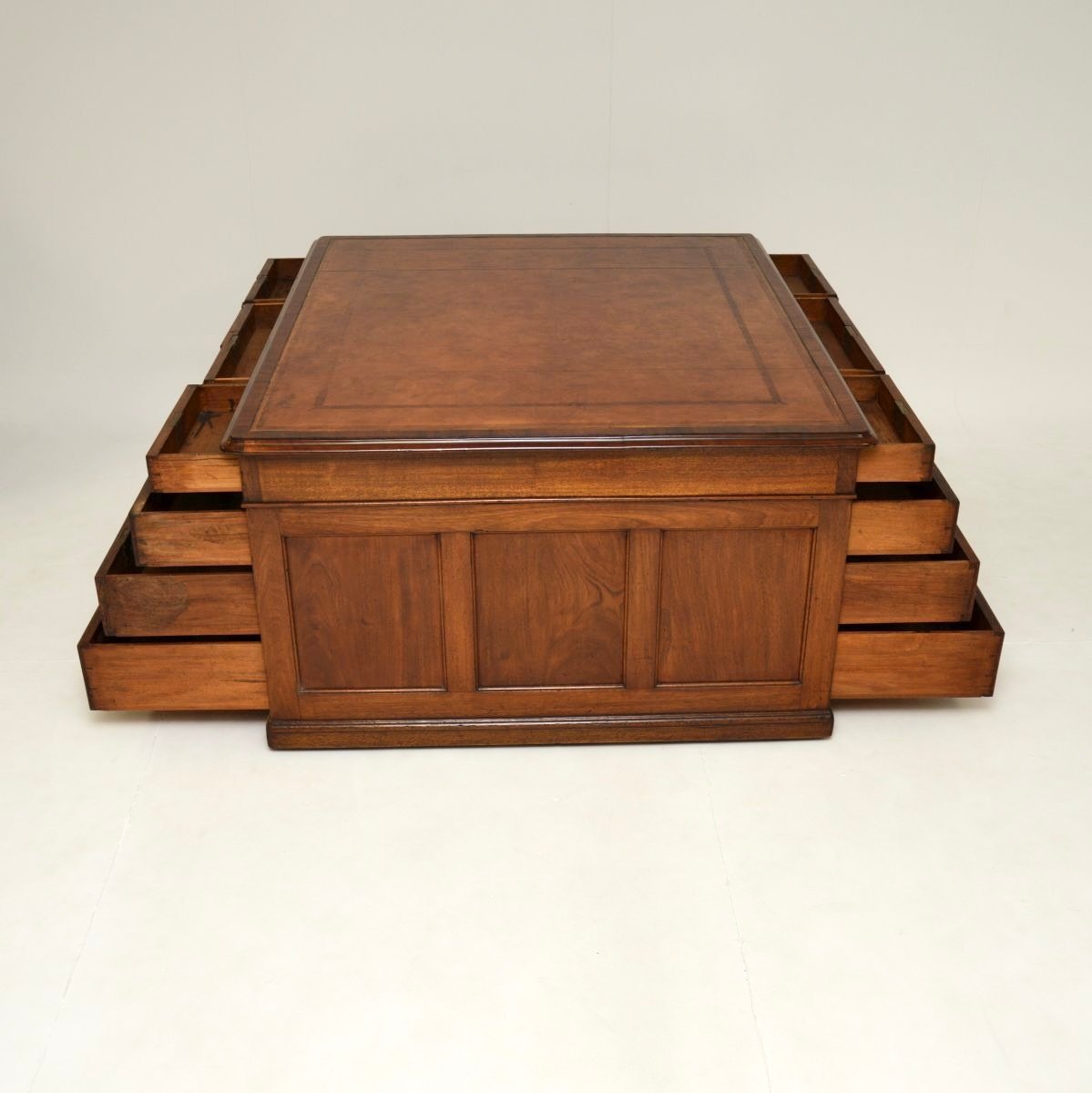 Es ist von extrem hoher Qualität, und ist ein sehr großes und beeindruckendes Stück. Dies hat sehr großzügige Proportionen, die Rückseite und die Vorderseite sind identisch mit neun Schubladen auf jeder Seite. Die Schubladen haben sehr hochwertige Messinggriffe mit detaillierten Löwenköpfen auf jedem Griff, das Holz hat eine schöne Farbe und reiche Patina. Die Oberseite hat eine atemberaubende handgefärbte und mit Gold verzierte Lederoberfläche, die ebenfalls eine herrliche Patina aufweist.