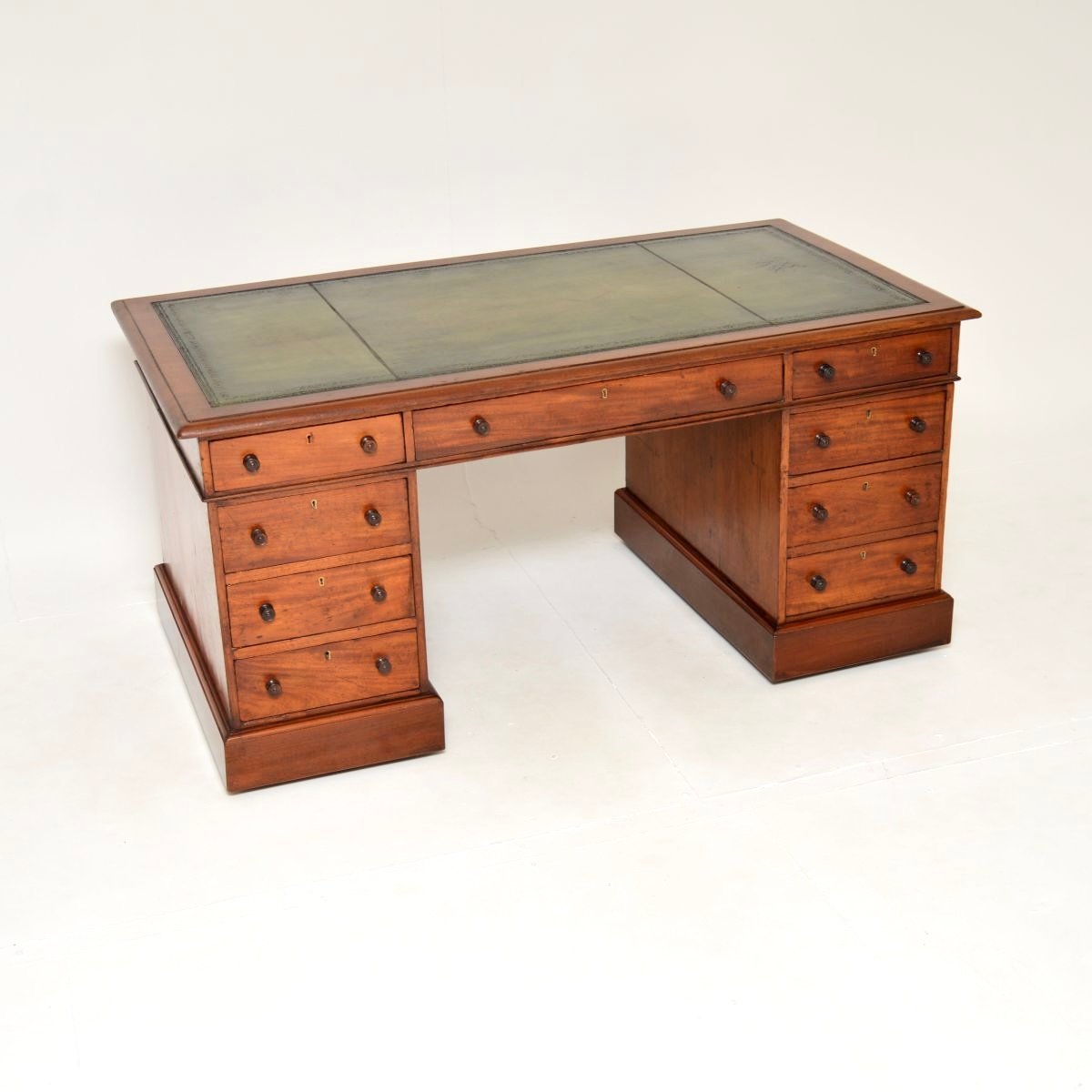 Es ist von schöner Qualität und ist eine nützliche Größe, mit einem großzügigen Knieloch und viel Stauraum im Inneren. Die Lederplatte ist handgefärbt und an den Rändern mit Verzierungen versehen. Die Schubladen haben gedrechselte Griffe aus Nussbaumholz und schöne Schwalbenschwanzverbindungen. Die Sockel stehen auf Sockeln mit Rollen darunter, so dass das Möbelstück gerollt werden kann. Die Rückseite ist ebenfalls schön verarbeitet, so dass das Möbelstück auch als freistehendes Element verwendet werden kann.
