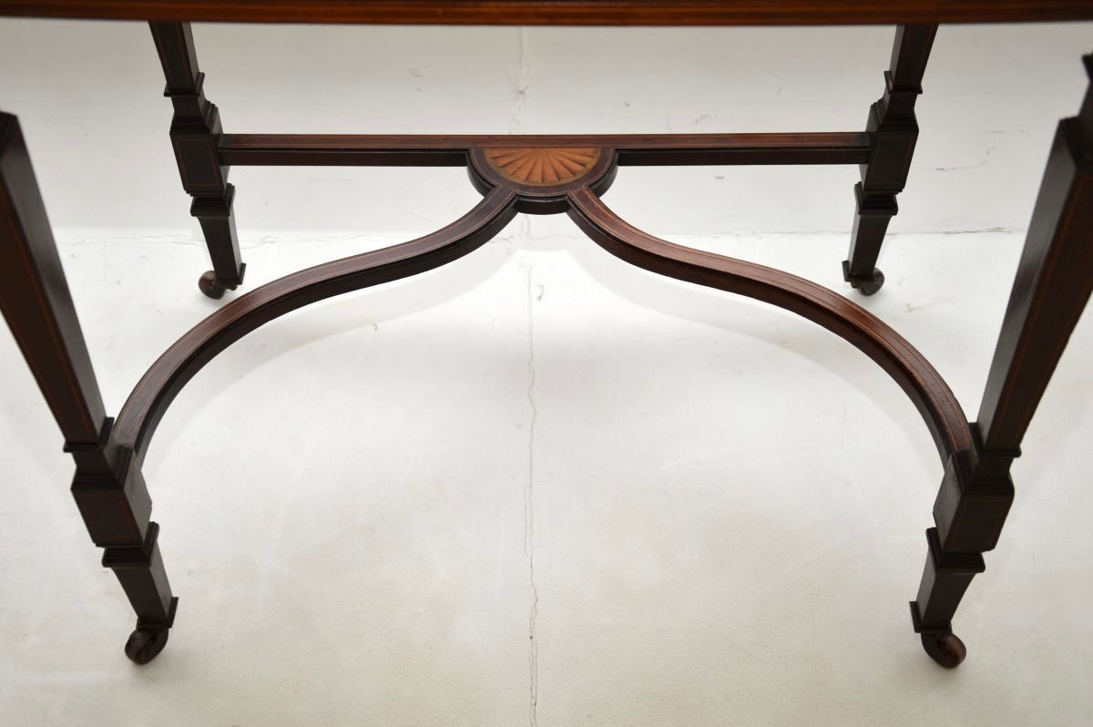 It is of exceptional quality and has a beautiful design. The wood is profusely inlaid with gorgeous floral satin wood designs, there is a nicely stretchered base that is also nicely inlaid. There is an inset tooled leather writing surface in the centre, and a small storage compartment on the back with a lift up link for pens and ink.