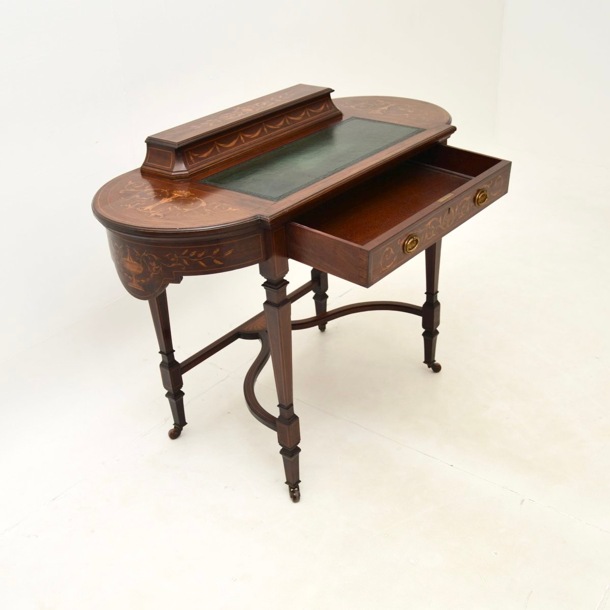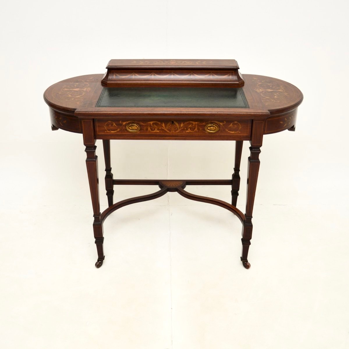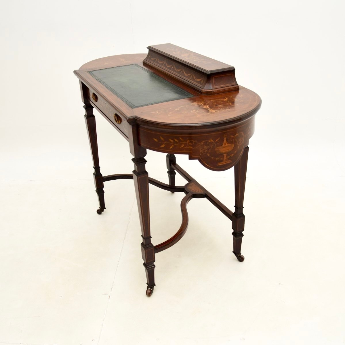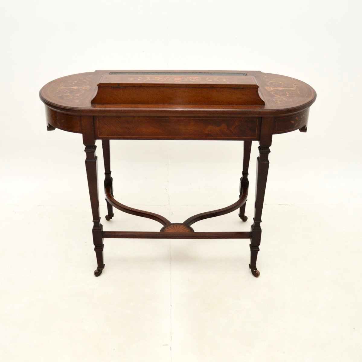 Er ist von außergewöhnlicher Qualität und hat ein wunderschönes Design. Das Holz ist reichlich mit wunderschönen floralen Intarsien aus Satinholz verziert, und der Sockel ist ebenfalls schön mit Intarsien verziert. In der Mitte befindet sich eine eingelegte Schreibfläche aus geprägtem Leder und auf der Rückseite ein kleines Staufach mit einem Klappdeckel für Stifte und Tinte.