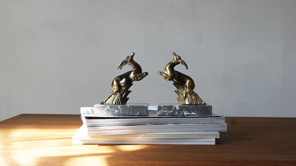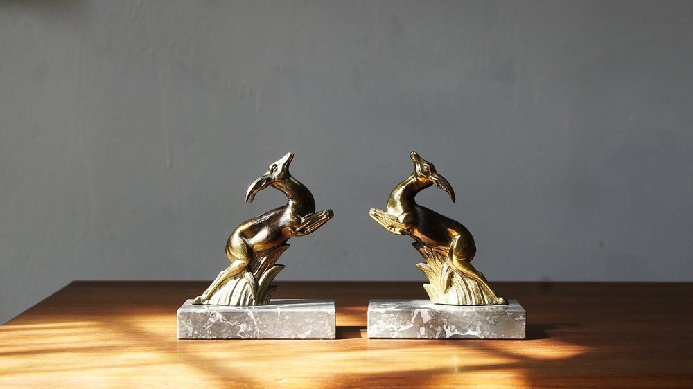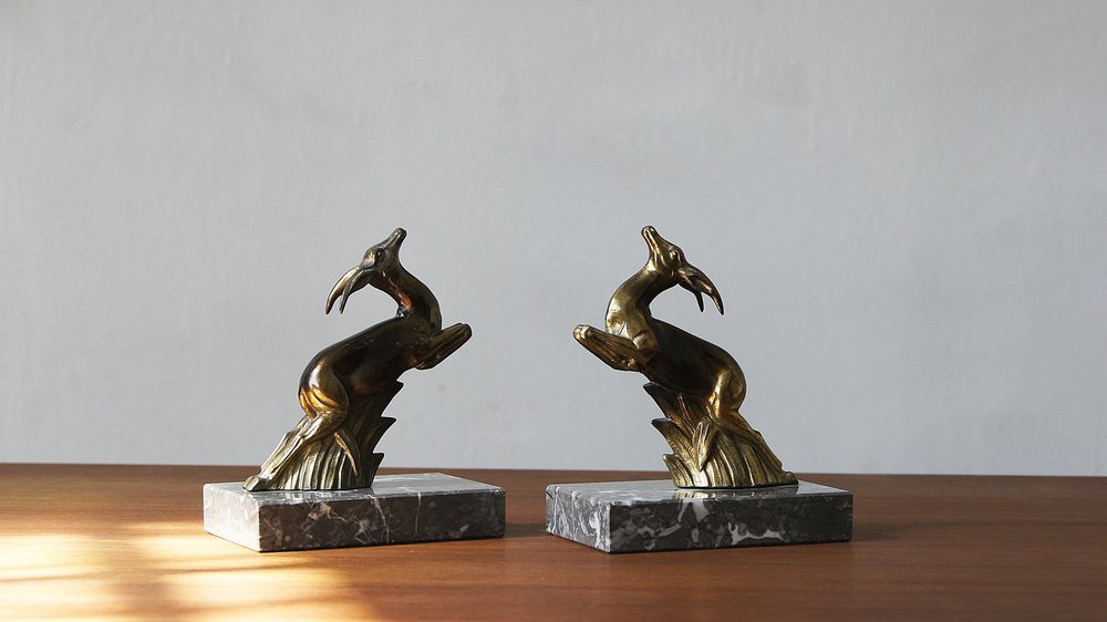 Antilopen Buchstützen auf Marmorsockel, 1930er, 2er Set