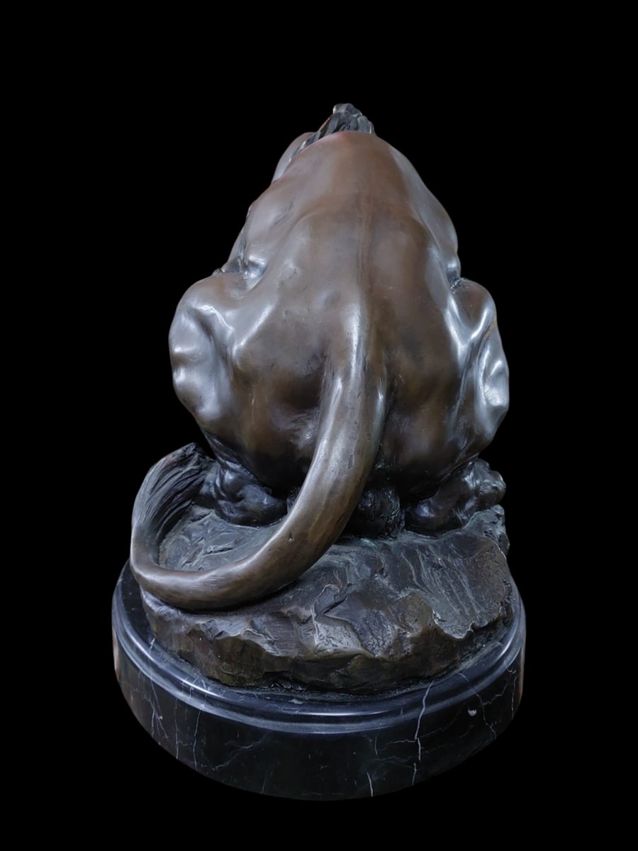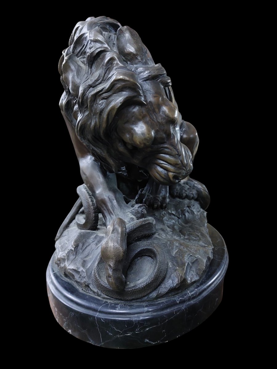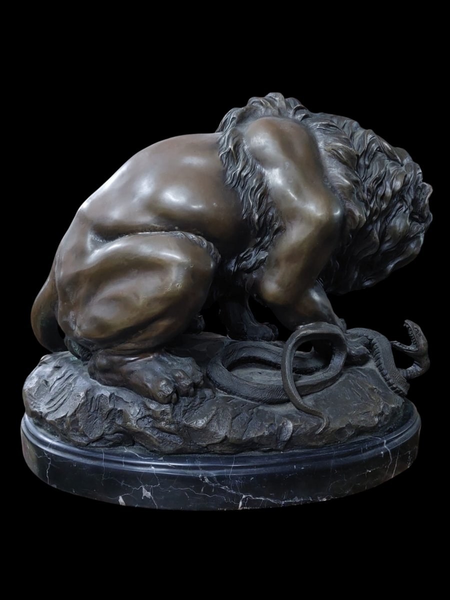 Dies ist eine originalgetreue Reproduktion der Bronzeskulptur „Löwe, der eine Schlange zertritt“ (Lion écrasant un serpent) aus den frühen 1900er Jahren, die ursprünglich vom französischen Künstler Antoine-Louis Barye geschaffen wurde. Künstler: Antoine-Louis Barye (1795–1875), ein renommierter Tierbildhauer.