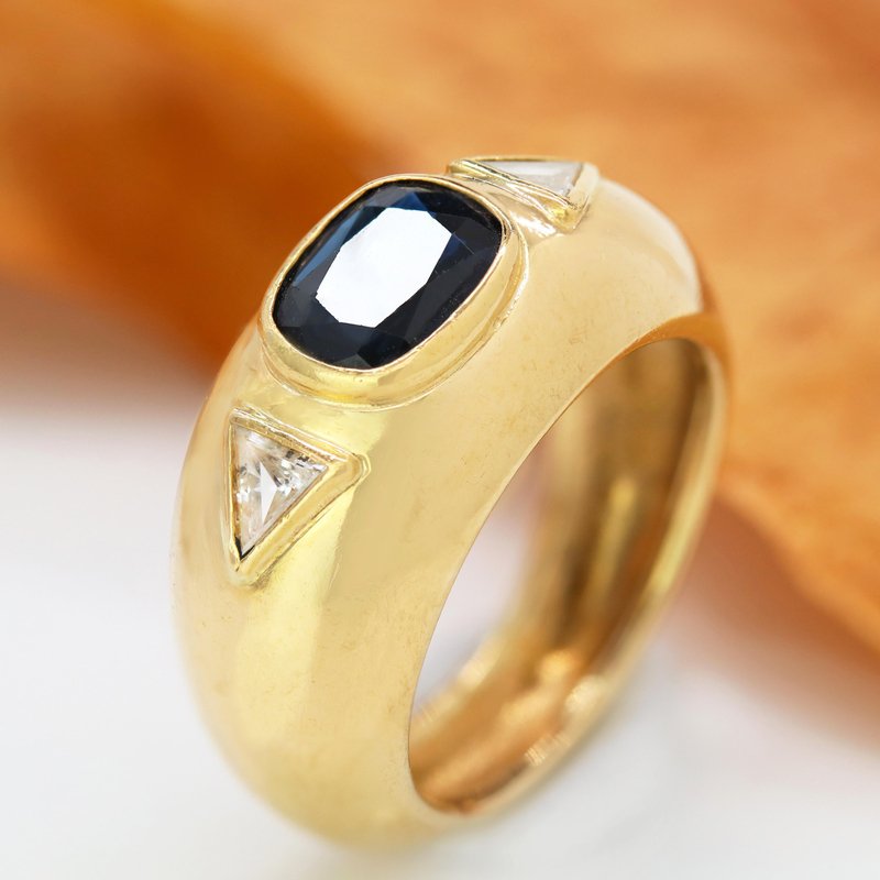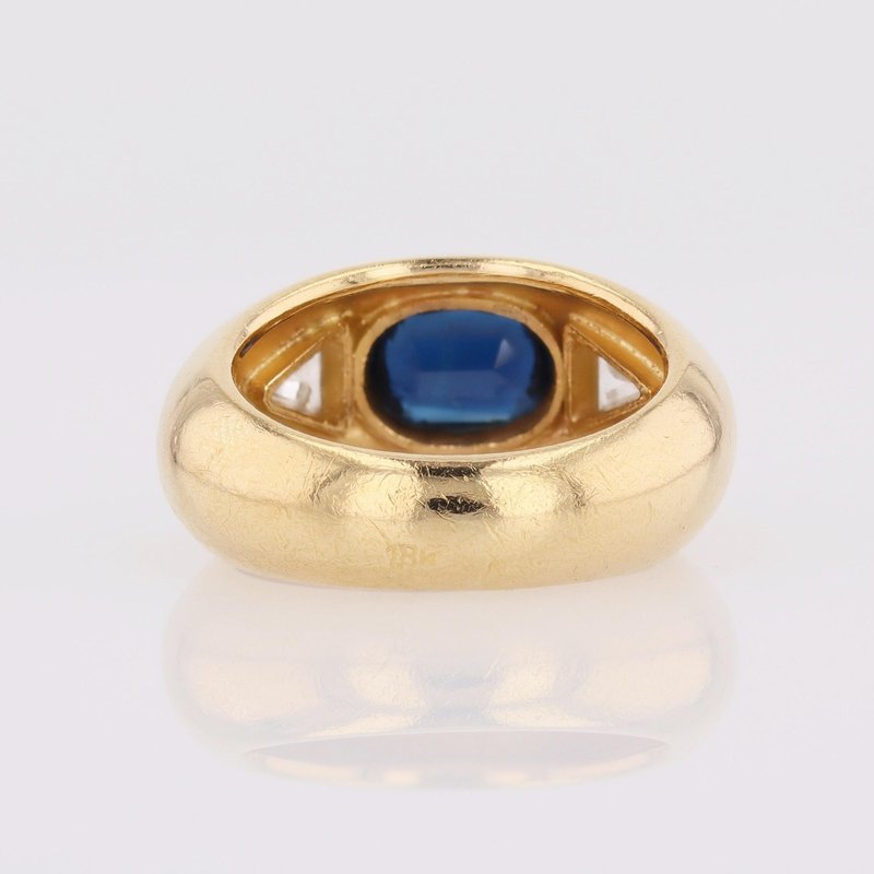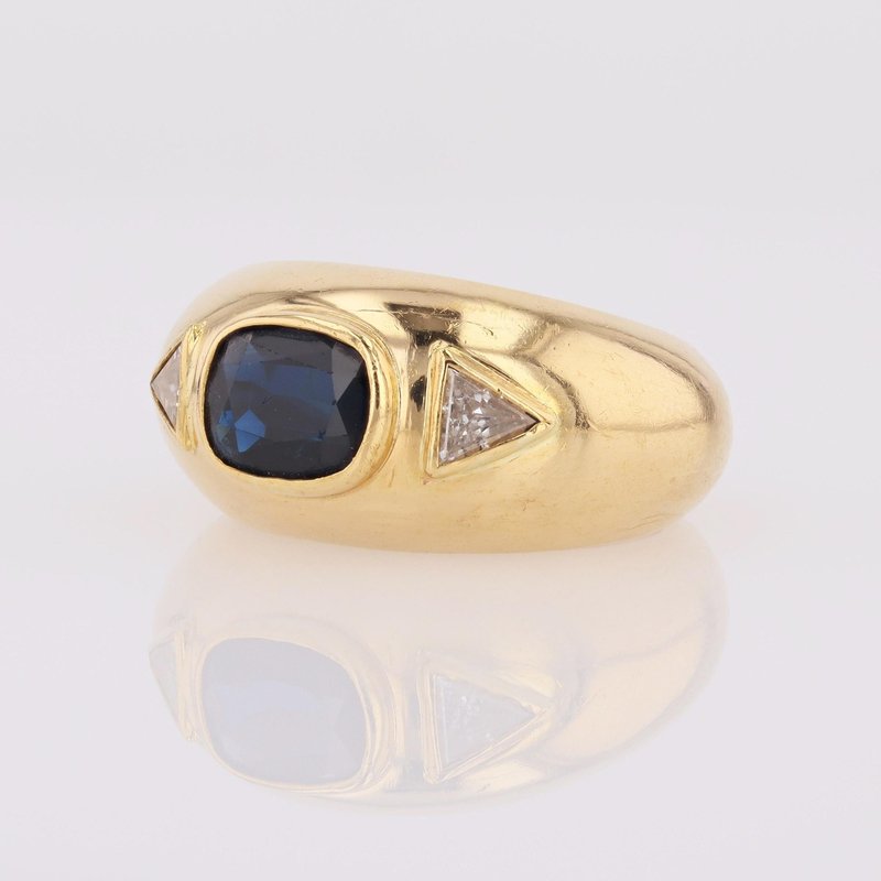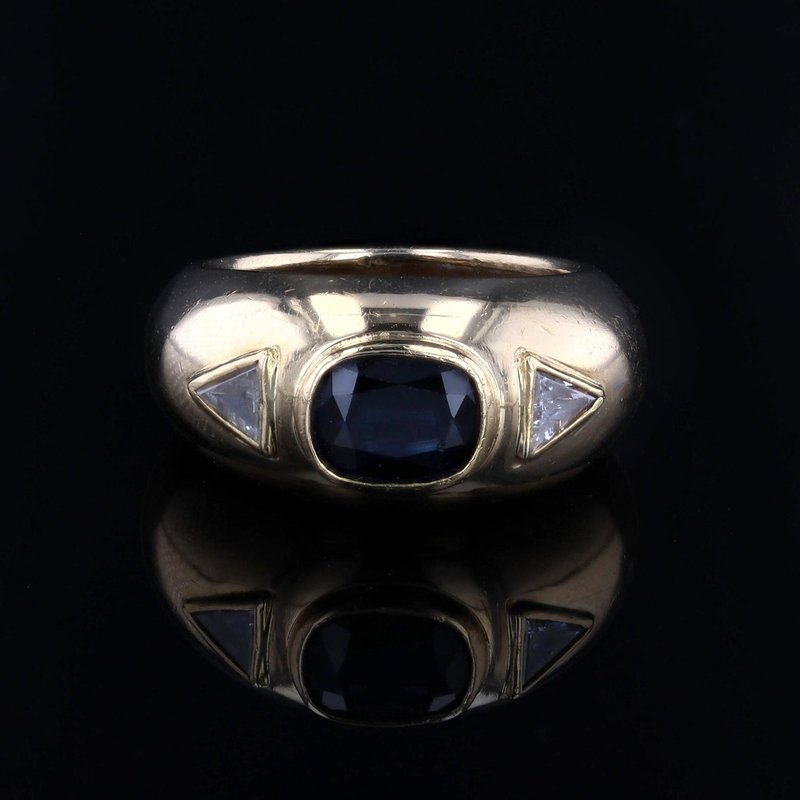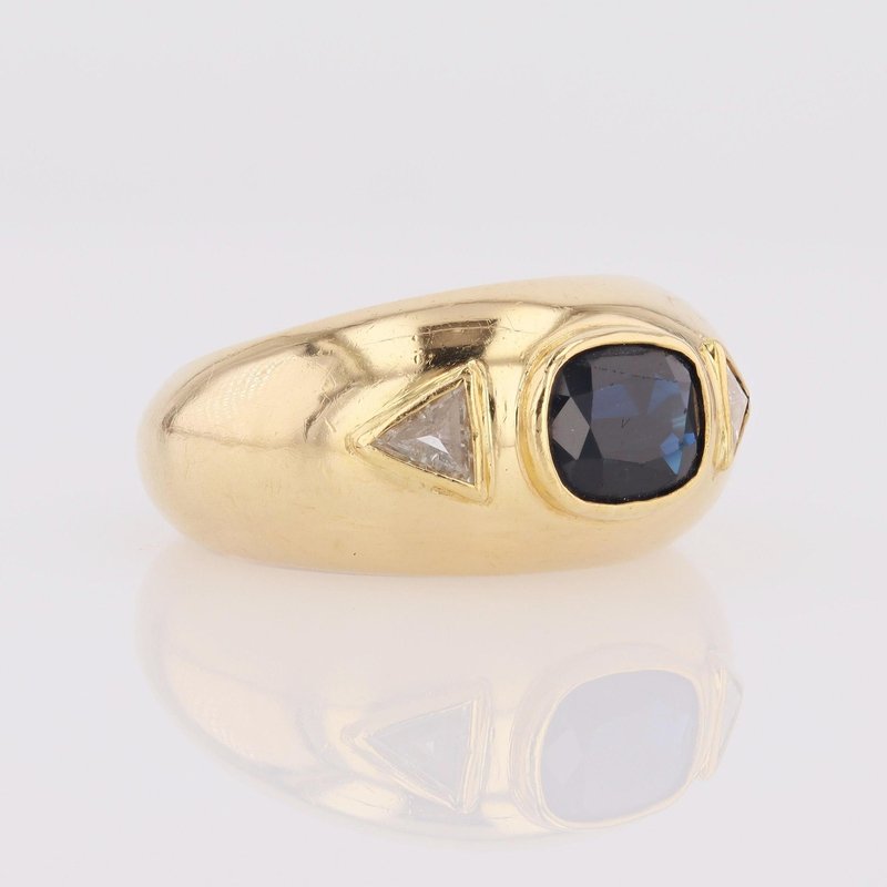 Ring in 18 karat yellow gold. A timeless bangle ring, it features a wide, domed band set with a cushion-cut sapphire on top and two triangle-cut diamonds on either side. Weight of the sapphire : 1 carat approximately. Total weight of the diamonds : 0.28 carat approximately. Height : 11 mm approximately, width : 9 mm approximately, thickness : 5.5 mm approximately, width of the ring at the base : 5.5 mm approximately. Total weight of the jewel : 11 g approximately. US Size : 6,5 ; resizing possible. Authentic antique jewelry - Work from the 1980s. Our opinion : This type of setting, featuring colored stones or diamonds, was very popular in the 1980s and is once again in high demand.