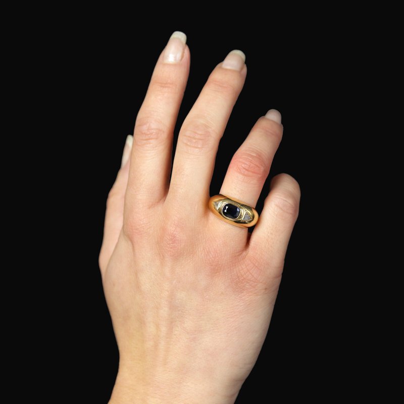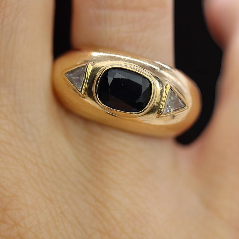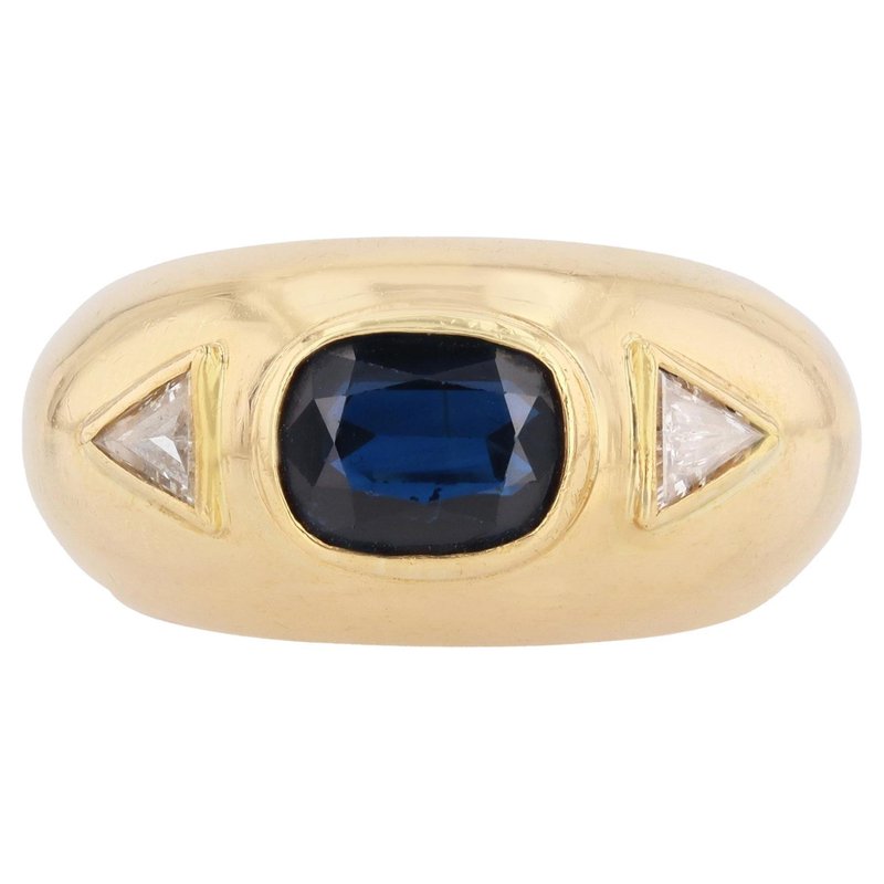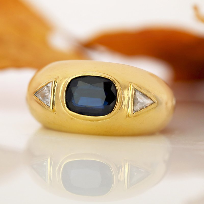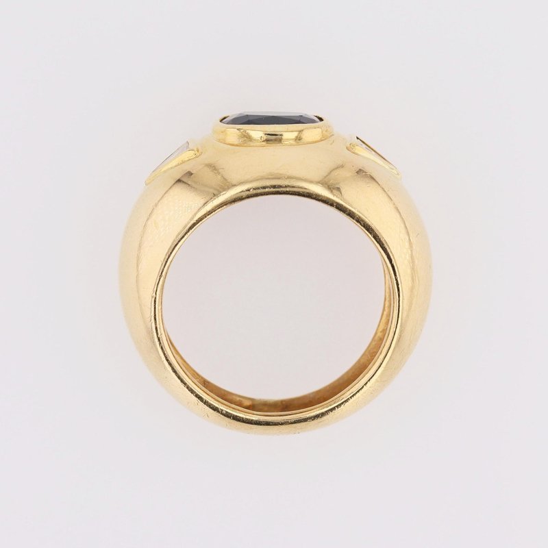 Ring in 18 karat yellow gold. A timeless bangle ring, it features a wide, domed band set with a cushion-cut sapphire on top and two triangle-cut diamonds on either side. Weight of the sapphire : 1 carat approximately. Total weight of the diamonds : 0.28 carat approximately. Height : 11 mm approximately, width : 9 mm approximately, thickness : 5.5 mm approximately, width of the ring at the base : 5.5 mm approximately. Total weight of the jewel : 11 g approximately. US Size : 6,5 ; resizing possible. Authentic antique jewelry - Work from the 1980s. Our opinion : This type of setting, featuring colored stones or diamonds, was very popular in the 1980s and is once again in high demand.