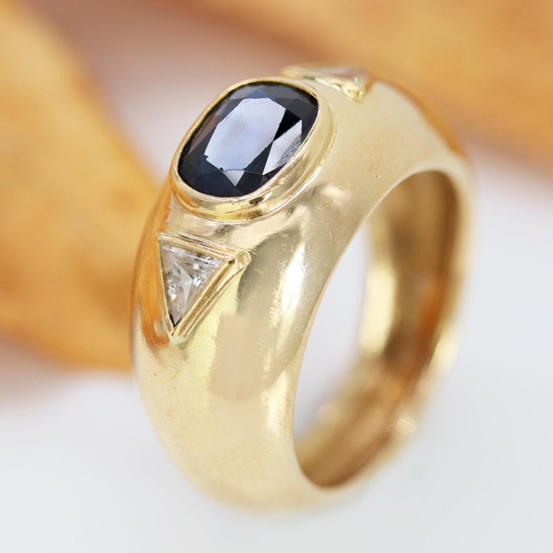 Ring aus 18 Karat Gelbgold. Ein zeitloser Armreif mit einem breiten, gewölbten Band, das oben mit einem Saphir im Kissenschliff und an beiden Seiten mit je zwei Diamanten im Dreieckschliff besetzt ist. Gewicht des Saphirs: ca. 1 Karat. Gesamtgewicht der Diamanten: ca. 0,28 Karat. Höhe: ca. 11 mm, Breite: ca. 9 mm, Dicke: ca. 5,5 mm, Breite des Rings an der Basis: ca. 5,5 mm. Gesamtgewicht des Schmuckstücks: ca. 11 g. US-Größe: 6,5; Größenanpassung möglich. Echter antiker Schmuck – Arbeit aus den 1980er Jahren. Unsere Meinung: Diese Art der Fassung mit farbigen Edelsteinen oder Diamanten war in den 1980er Jahren sehr beliebt und erfreut sich heute wieder großer Nachfrage.