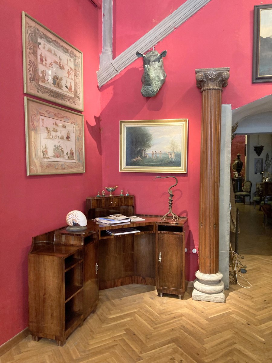 Exceptionally rare executive corner writing desk or vanity table branded Dominique, Paris. This beyond beautiful Art Deco period French writing table by Maison Dominique was designed by the French duo André Domin (1883-1962) & Marcel Genevrière (1885-1967), better known as Dominique. Entirely veneered in precious woods, showing inlaid angular parquetry on top- boasts two capacious cabinets with doors flanking a large knee-hole area, an open shelf unit on the left side for plenty of storage space, furthermore the niches that open on the apron offer more space for documents, books or magazines storage. The stunning design of this vintage desk is enriched by an additional removable compartment placed on the desk top, this two doors shelf unit opens to reveal a letterbox or glove compartment and can also serve as a convenient shelf or support surface thanks to its wide triangular shaped top. This stunning corner executive desk or angular writing table is fitted with original handles, knobs, locks and working key in silver-colored chromed metal with sophisticated geometrical shapes typical of the Art Deco period. An Art Deco desk that is an example of high cabinetry, the two side compartments with door are finished at the top with a rounded shape and embellished with geometric inserts of small silver metal strips that are also repeated on the feet. A quirky design piece of furniture of very high quality and craftsmanship. This French one of a kind veneer bureau features two embossed brand marks “Dominique Paris” behind. The desk is in perfect structural condition and in quite overall perfect condition showing only a minor wood dimple on the left side as showed in the last picture that can be restored on request. Professional hand French polish that gives this corner writing table a lavish glossy the appearance and enhances the wonderful wood grain and flamed color. This high end French design vintage piece can also serve as striking writing table, vanity table, vanity desk, small bureau, ladies desk, entry table, small cabinet, as a bespoke item in a bedroom, home office or study The decorating firm of Dominique was established in 1922 at 104 Faubourg Saint-Honore, Paris. Co-founded by Andre Domin, a self-taught artist, and Marcel Genevriere, a trained architect, the partnership got off to a resounding and rapid start. Within a year they were advertising a wide range of carpets, fabrics, furniture, and wrought iron. Dominique's enduring designs are characterized by rectilinear lines paired with smooth curves to accommodate the human form. The duo preferred materials such as precious woods, bronze, and copper inlay. Their furniture design was characterized by simplicity and dignity.