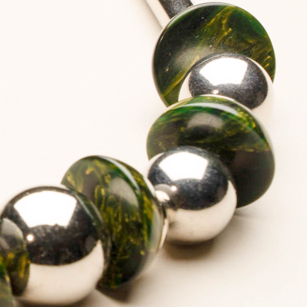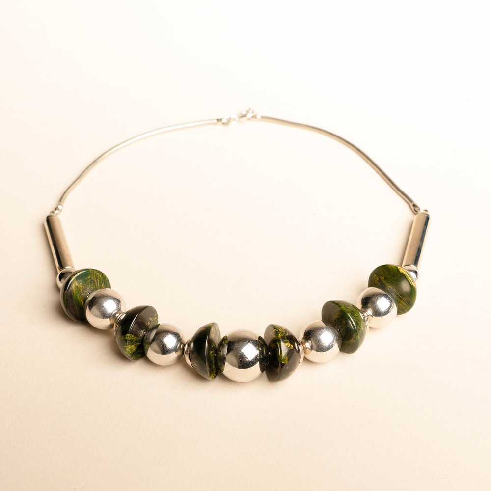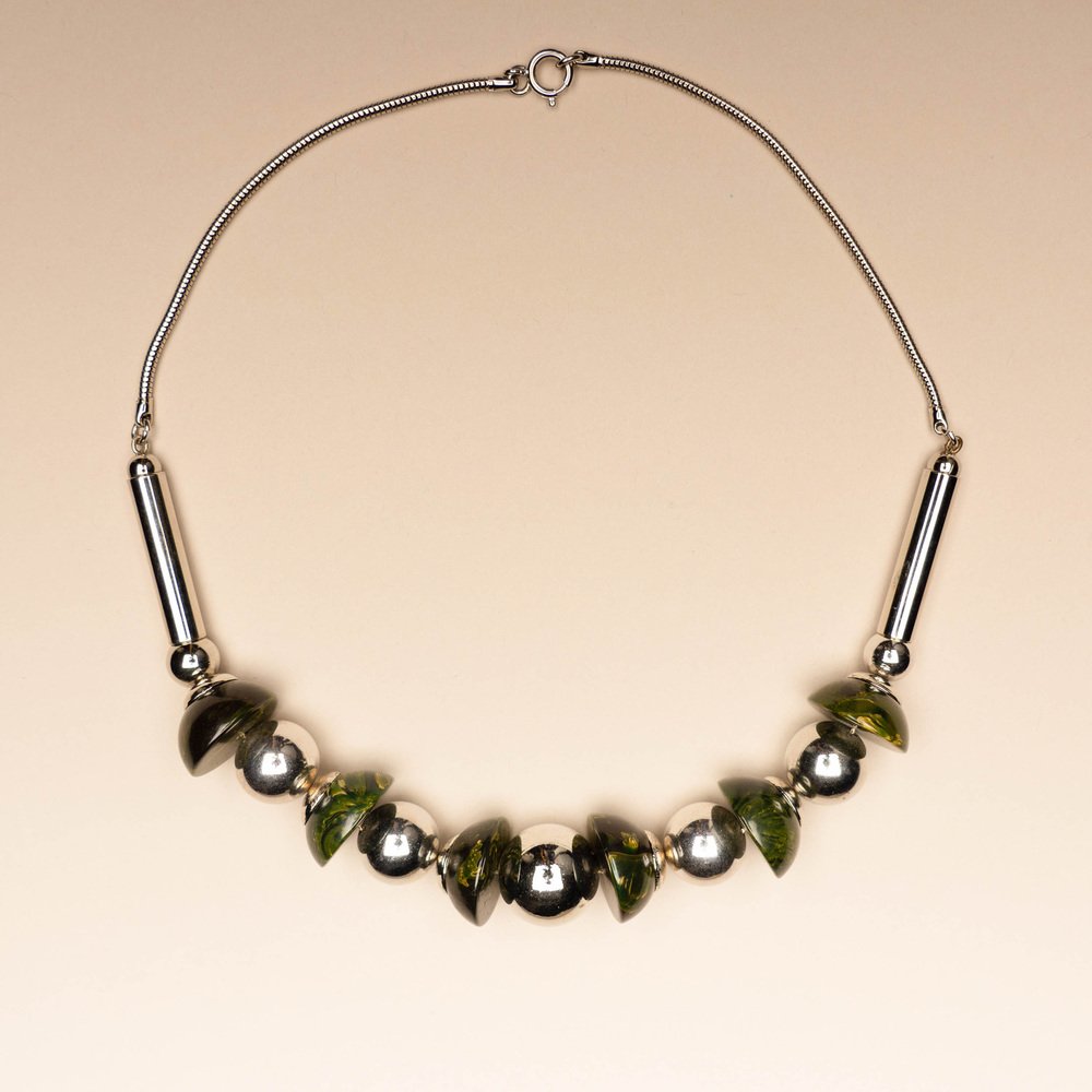 Halskette mit Kugeln und Röhren aus vernickeltem Messing sowie Halbkugeln aus dunkelgrün-gelb marmoriertem Galalith; Federringverschluss. Der Durchmesser der Halbkugeln und Kugeln beträgt 2 bzw. 1.5 cm.