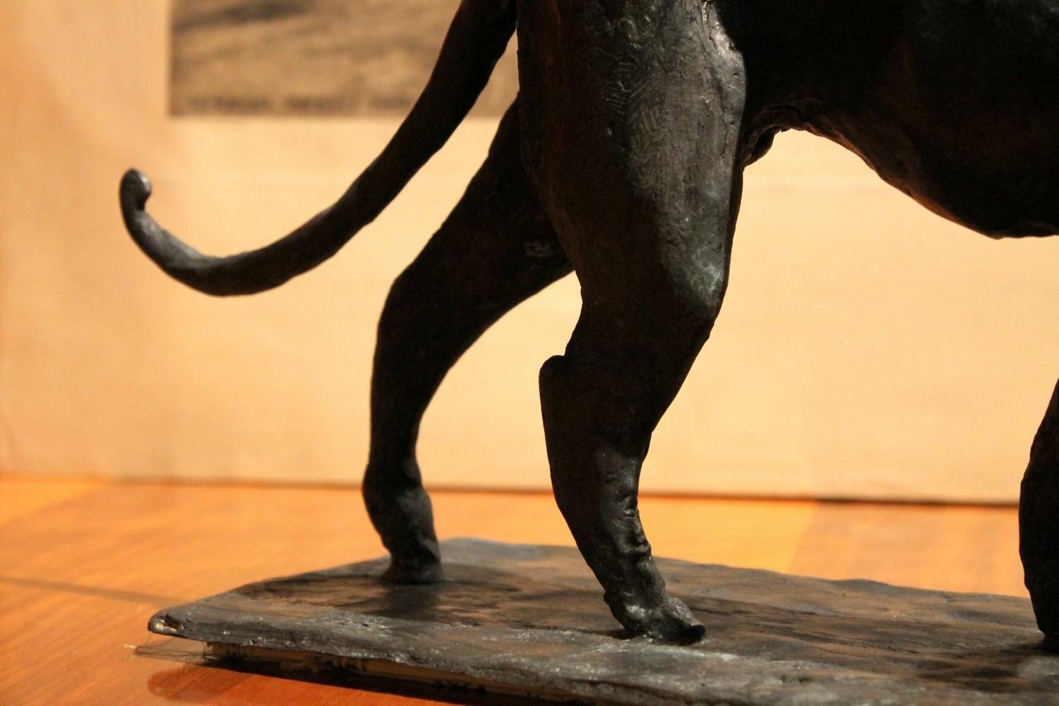 This contemporary sculpture representing a walking leopard on a rectangular naturalistic base is made of solid burnished black patinated bronze, created by the Argentine-Italian artist Pablo Simunovic through the ancient lost wax casting method. The animal figurative feline artwork - sculptured on the round – has a majestic appearance and wonderful bronze texture. The dark patina of the bronze with different shades ranging from grey to black emphasizes the mysterious elegance of this wild big cat and its profile is stunning from any angle. The superb modeling of this exceptional Art Deco or Jugendstil inspired piece captures strength and power of this majestic wildlife animal as long as a natural sense of motion. The artist is able to attribute incredible details to this work of art creating an animal figurative Fine art object by applying classical techniques to contemporary subjects, modeling the inert wax cast of the sculpture, which is the soul of the final result in bronze, creates an animal with incredible realistic features. Measures: H.22, W.33, D.13 cm