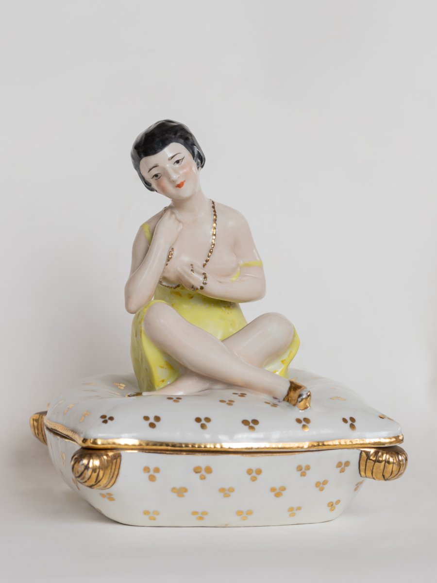 Art Deco Porzellan Puder Schmuckschatulle mit Dame von Kosso, Deutschland, 1920er