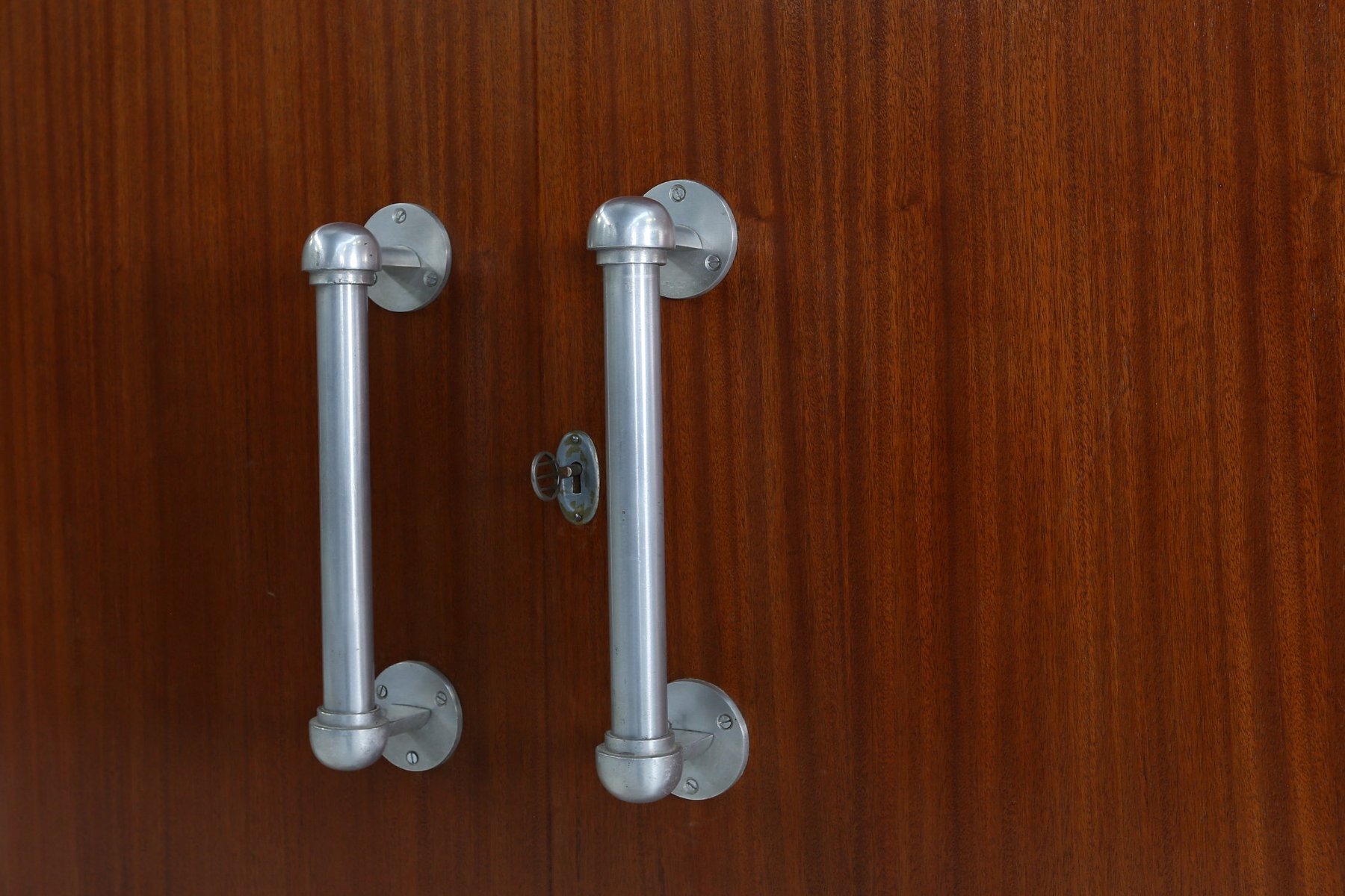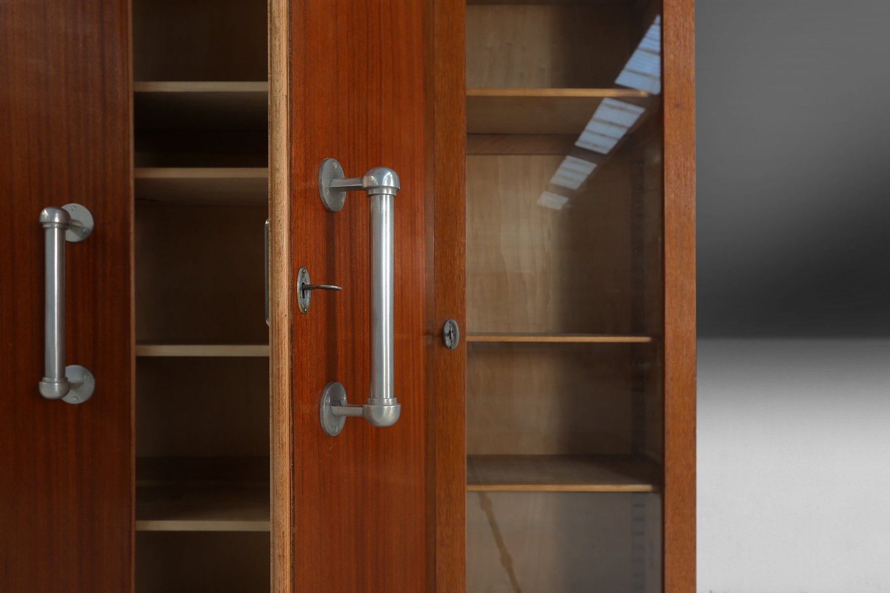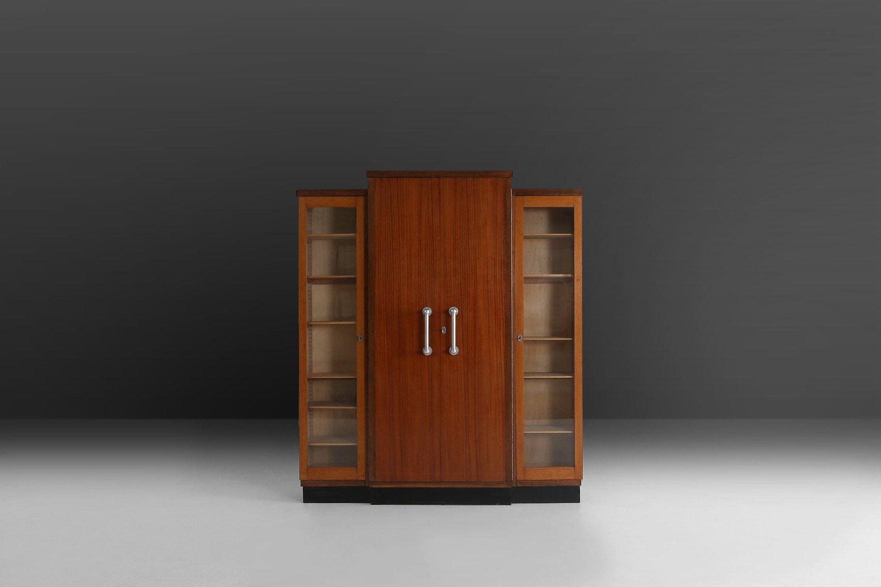 Der Schrank besteht aus drei unterschiedlichen Teilen: einem Mittelteil mit massiven Holztüren, flankiert von zwei verglasten Fächern, die jeweils mit Regalen zur Präsentation ausgestattet sind. Der Schrank besteht aus zwei Volumen, die dem Design eine einzigartige Spannung zwischen den einzelnen Ebenen verleihen. Die vertikalen Aluminiumgriffe an den Mitteltüren bilden einen eleganten industriellen Kontrast zur Wärme der Holzmaserung, während der schwarz lackierte Sockel die Komposition mit grafischer Präzision verankert. Die Gesamtsilhouette ist kühn und dennoch ausgewogen, mit einer skulpturalen Präsenz, die an den architektonischen Geist der Zwischenkriegszeit erinnert. Die Aluminiumgriffe sind ein typisches Element für Joseph De Bruycker und ein schönes Beispiel für die Blütezeit der Art-Déco-Periode. Joseph De Bruycker, der in den 1930er und 1940er Jahren in Belgien tätig war, war bekannt für seine Wohnbauaufträge, die modernistische Ideale mit dekorativer Raffinesse verbanden. Dieser Schrank, der wahrscheinlich speziell für eines seiner Interieurs angefertigt wurde, ist ein Beispiel für die belgische Interpretation des Art Déco – weniger extravagant als sein Pariser Pendant, aber dennoch tief verbunden mit Handwerkskunst, Proportionen und Materialintegrität. De Bruycker hat einen modernen Stil, der aus einer Abfolge von Volumen besteht und kubistisch anmutet.
