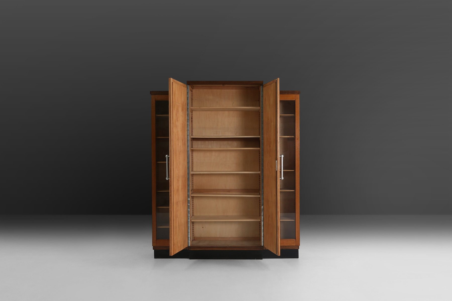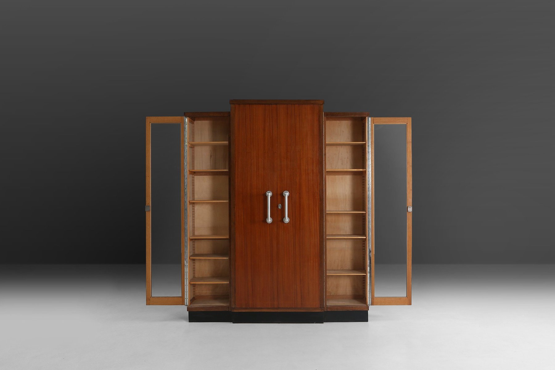 The cabinet is composed of three distinct sections: a central body with solid wooden doors flanked by two glazed compartments, each fitted with shelves for display. The cabinet is made out of two volumes giving the design a unique tension between each layers. The vertical aluminum handles on the central doors offer a sleek industrial counterpoint to the warmth of the wood grain, while the black lacquered base anchors the composition with graphic precision. The overall silhouette is bold yet balanced, with a sculptural presence that evokes the architectural spirit of the interwar period. The aluminum handles are a typical element for Joseph De Bruycker and are a fine example of the heyday of the Art Deco period.