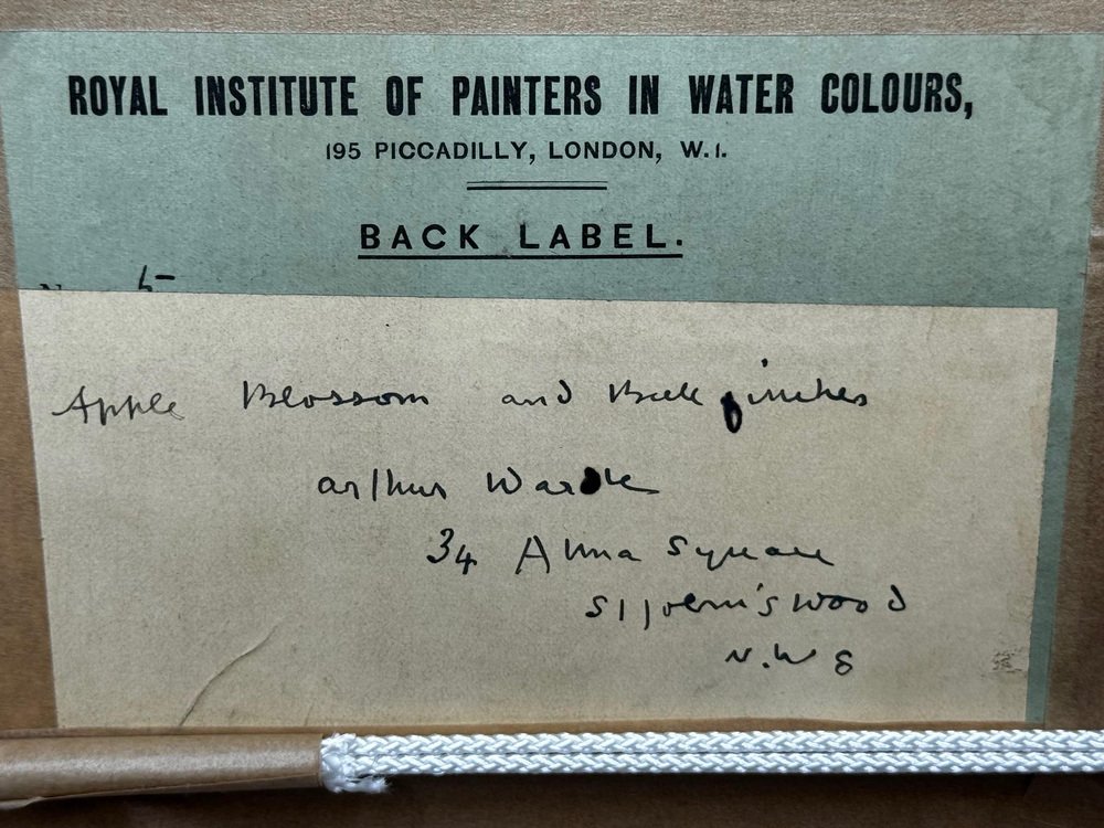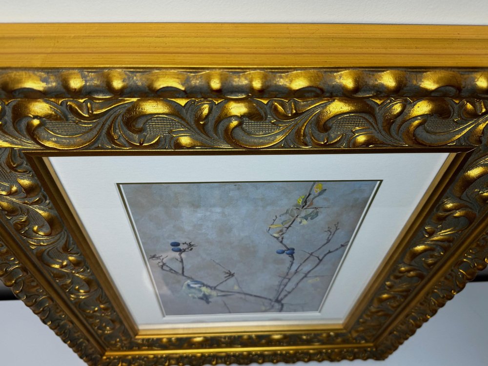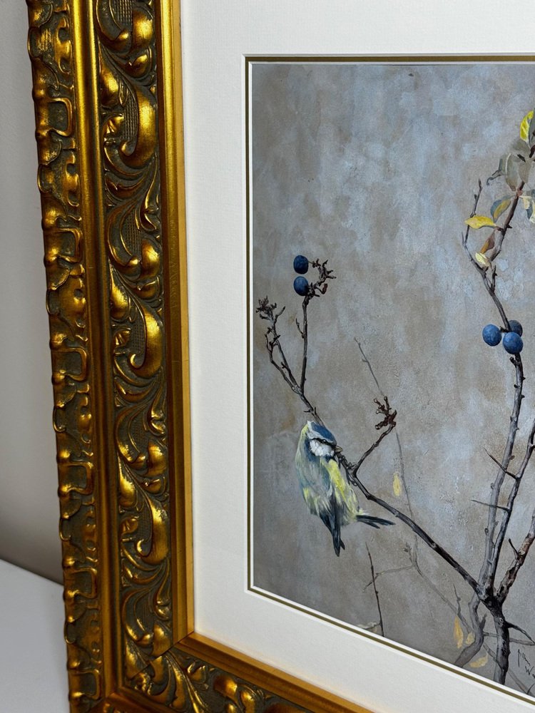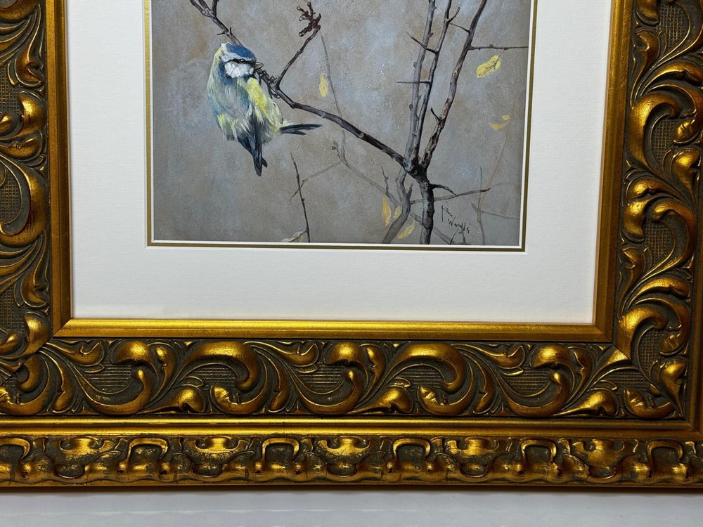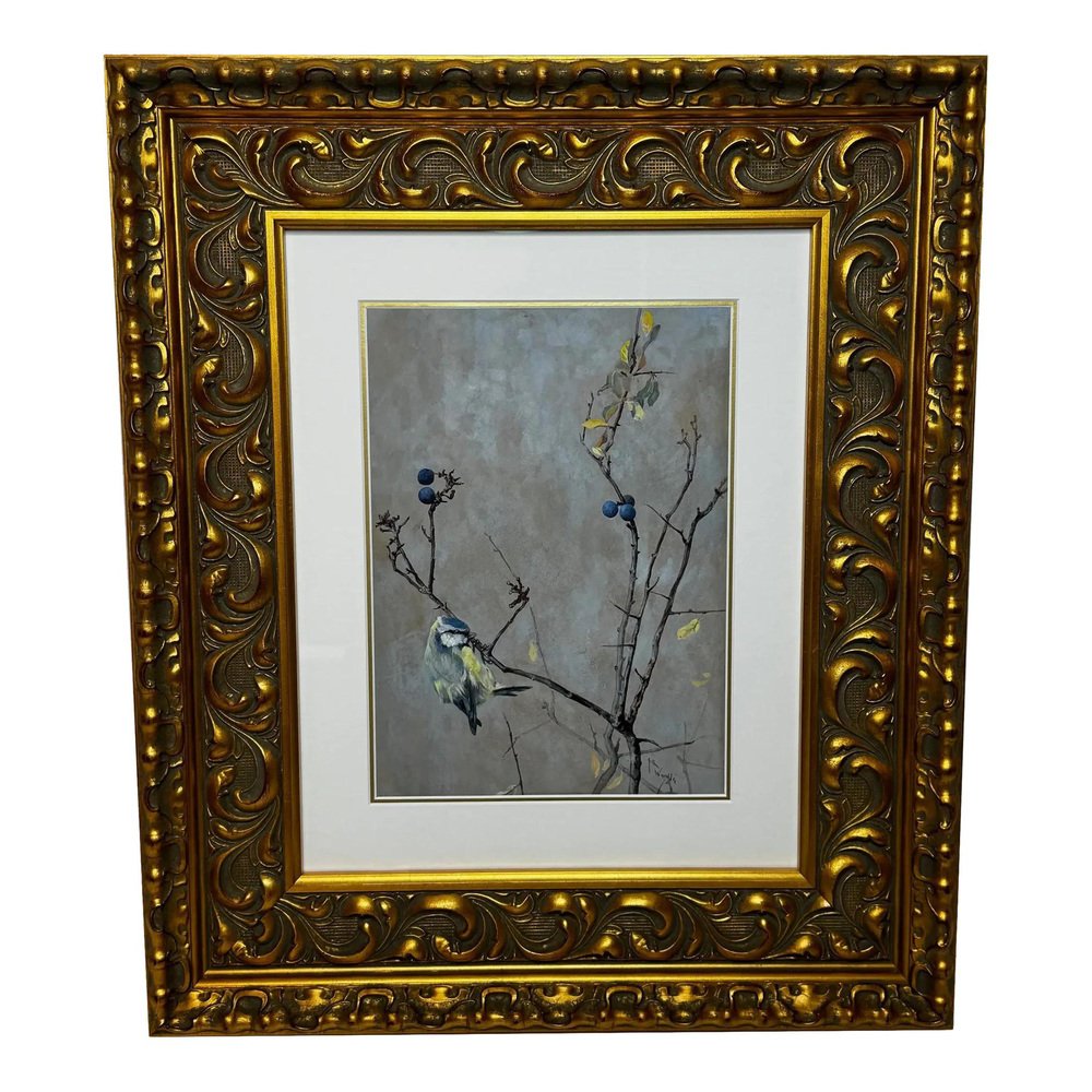 Beginning of 20th Century Victorian British Watercolour Painting Apple Blossom and Blue Tit Bird by Arthur Wardle 1860-1949. Impress your Beginning of 20th Century Victorian British Watercolour Painting Apple Blossom and Blue Tit Bird by Arthur Wardle 1860-1949. Impress your guests & clients in your home or office with this rather pretty fascinating ornithology masterpiece. Subject ornithology study of a beautiful cute Blue tit bird, which has vibrant colour hues of blue & turquoise, grey, white, light yellow, black & brown. The little bird in side profile is perched on an apple blossom tree hanging onto a lower branch, looking towards the right. Which has a few little dark blue coloured berries & some sparse leaves on. Title “Apple Blossom and Blue Tit” by Arthur Wardle. Medium is watercolour & bodycolour on paper, set in a recent white with gold border mount & AR70 protective glass on the front. Signed in the bottom corner by the known listed British artist Arthur Wardle. A fine rare example of his work particularly as this is a bird study. Set in a recent traditional heavy decorative gilt moulded Larson Julh LJE Item No 123360000 frame. Circa of the painting 1900 beginning of the 20th century end of Victorian era. A nice display size with the frame being 55.5 cm wide and 63.5 cm high. Artist biography Arthur Wardle (1860-1949) Born in London, aged just sixteen Wardle had a piece displayed at the Royal Academy. His first exhibit was a study of cattle by the River Thames, leading to a lifelong interest in painting animals. In 1880 Wardle lived in Oakley Square, Camden, but artistic success enabled him to move along with his wife to the more upmarket Alma Square in St John's Wood, London in 1892. Wardle loved this area as it was near the zoo, which gave him easy access to study nature help to make him the finest animal artists of his generation. Wardle was prolific until 1936 he exhibited more than 100 works at the Royal Academy, as well as the Society of British Artists at Suffolk Street. He painted a variety of animal subjects with equal skill but his work may be divided into two categories, domestic and exotic; animals from overseas including leopards, polar bears and tigers such as The Deer-Stealer (1915) were painted from sketches that he made at London Zoo. He is considered equally proficient in oils, watercolours and pastels and was elected to the Pastel Society in 1911 and became a member of the Royal Institute of Painters in Water Colours in 1922. In 1931 he held his first one-man exhibition at the Fine Art Society and in 1935 the Vicar's Gallery put on an exhibition of his work. He also exhibited in Paris. By 1936 Wardle had moved to West London. His career was highly successful and his works continue to be sought after and widely reproduced on postcards, calendars and boxes of chocolates. He remains one of the widely known dog painters of the 19th and 20th centuries. The highest sold price at auction is $510,978 US Dollars for a painting that sold at Christie's in London. Arthur Wardle died on 16 July 1949. Sources see Tate Museum, Christie’s & Bonhams. Provenance Royal Institute Of Painters In Water Colours 195 Piccadilly, London, W.1. Back Label, Artist address label Alma Square, St Johns Wood, N.W 8. Highly sought after due to the collectible nature of the ornithology subject matter. with new hanging thread on the back ready for immediate home wall display. We only select & sell paintings based upon subject, quality & significance. Dimensions in centimetres of the frame High (63.5 cm) Wide (55.5 cm) Depth thickness of frame (5 cm) less